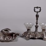 Ensemble en argent 800/1000e soit une paire de salerons en cristal à monture en argent et un bougeoir avec sa mouchette. Poids brut total. : 579 g.