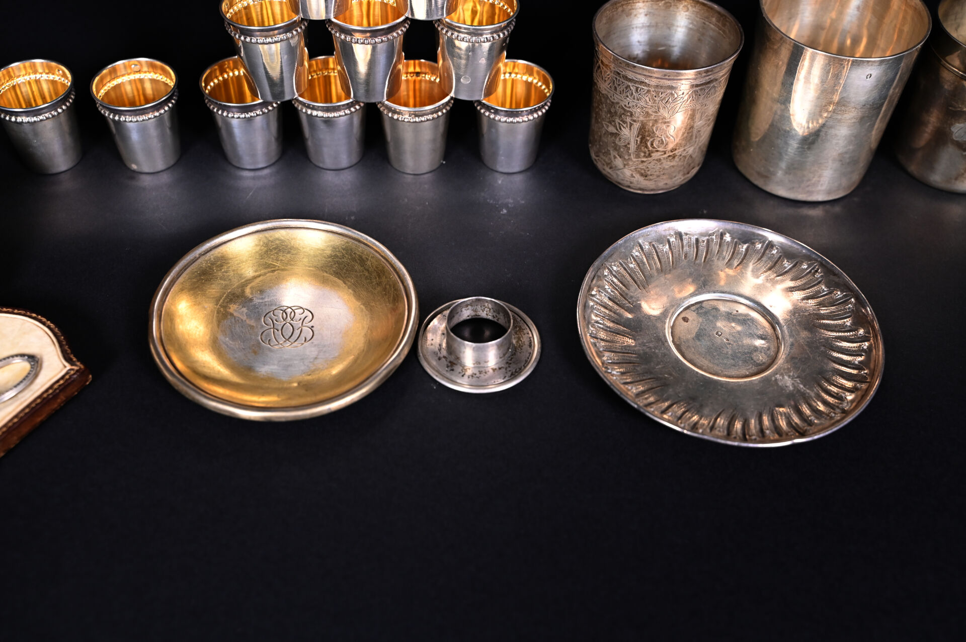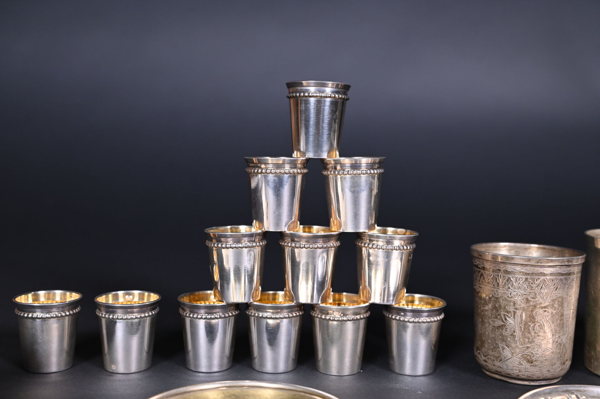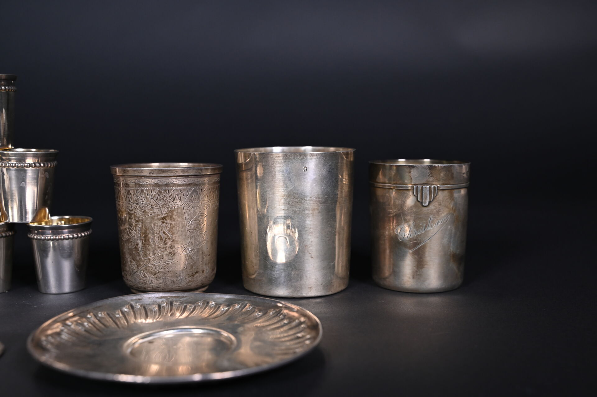 Ensemble en argent 925/1000e et 800/1000e dont timbales et gobelets, une coupelle anciennement dorée marquée PUYFORCAT. Poids. : 461 g. On joint une paire de ciseaux et un dé à coudre en argent. Poids brut. : 13g.