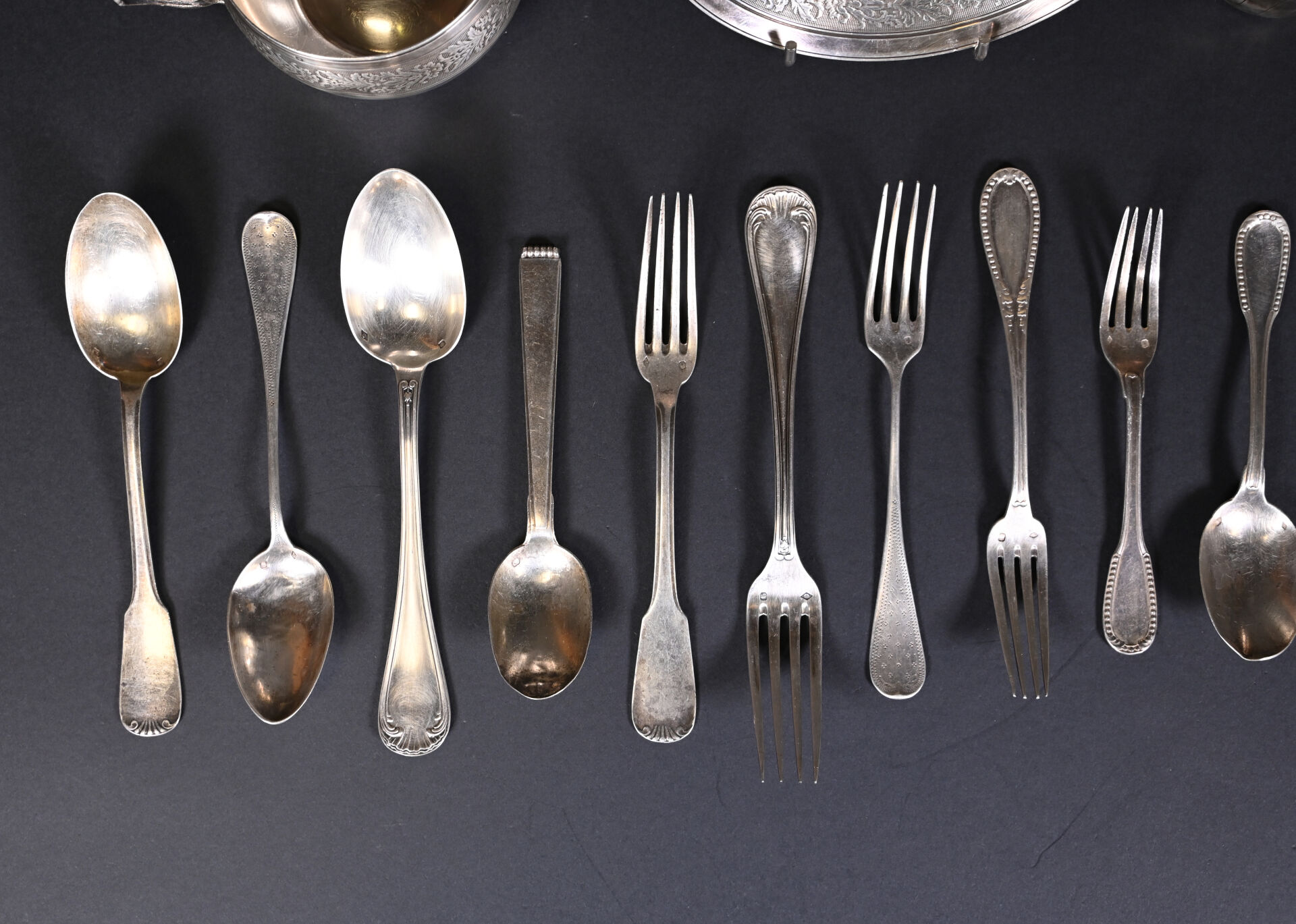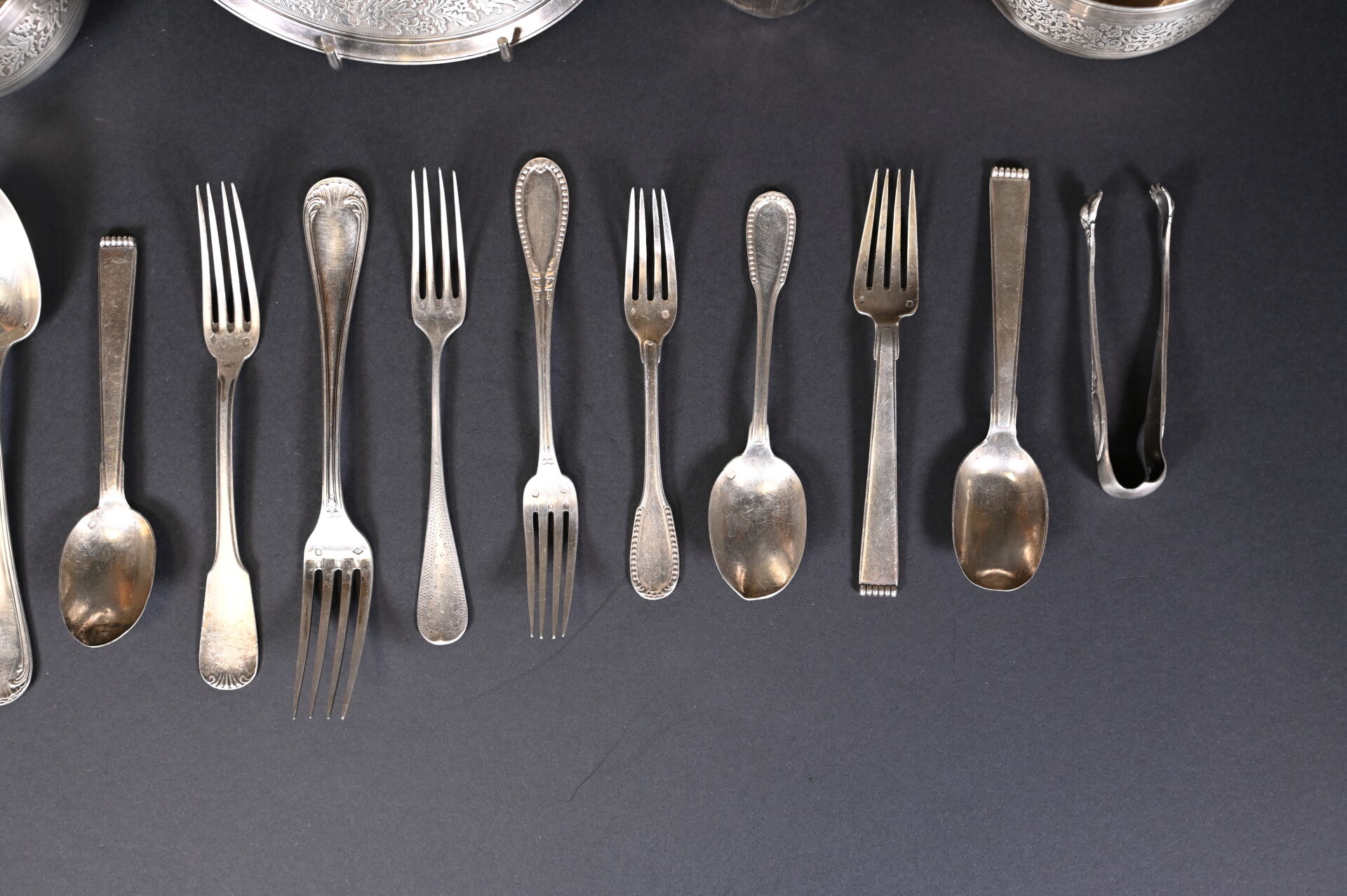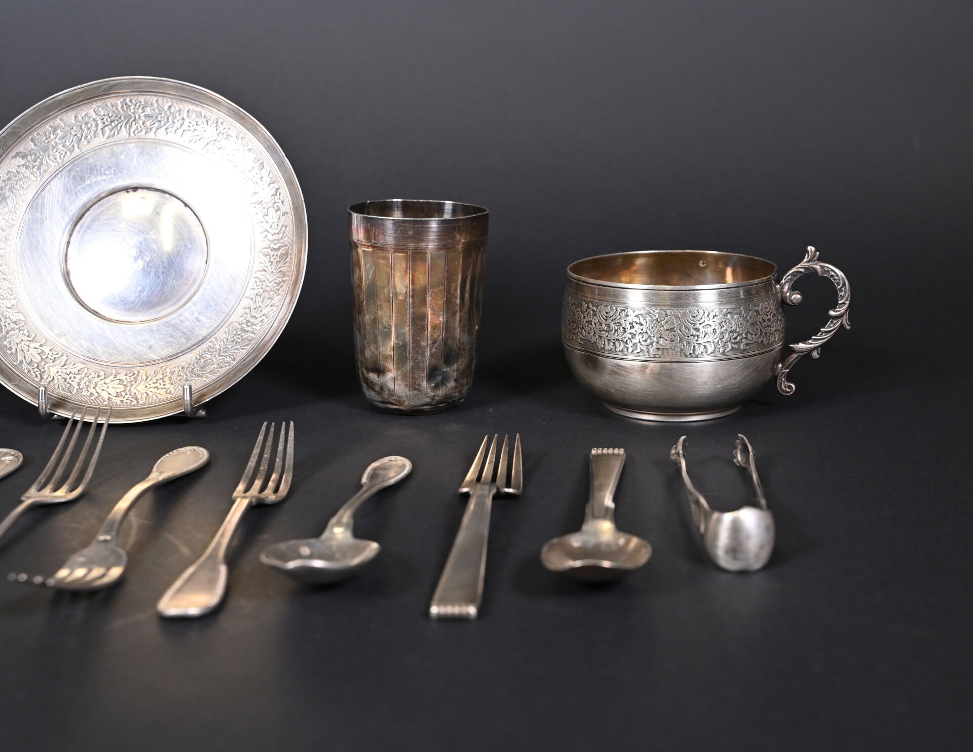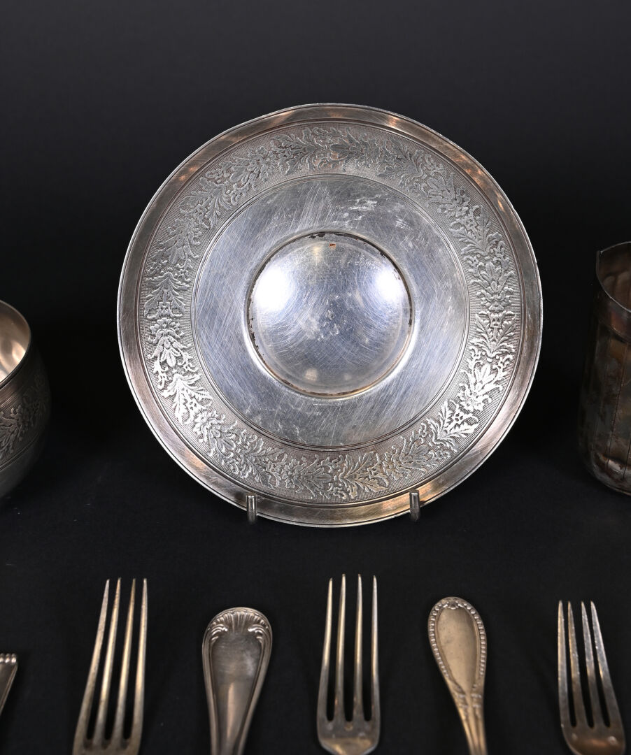 Ensemble en argent 925/1000e et 800/1000e (poinçon Minerve) soit des couverts dépareillés, deux tasses à thé, une sous-tasse une pince à sucre et une timbale (accidents et déformations). Poids total. : 1001 g.