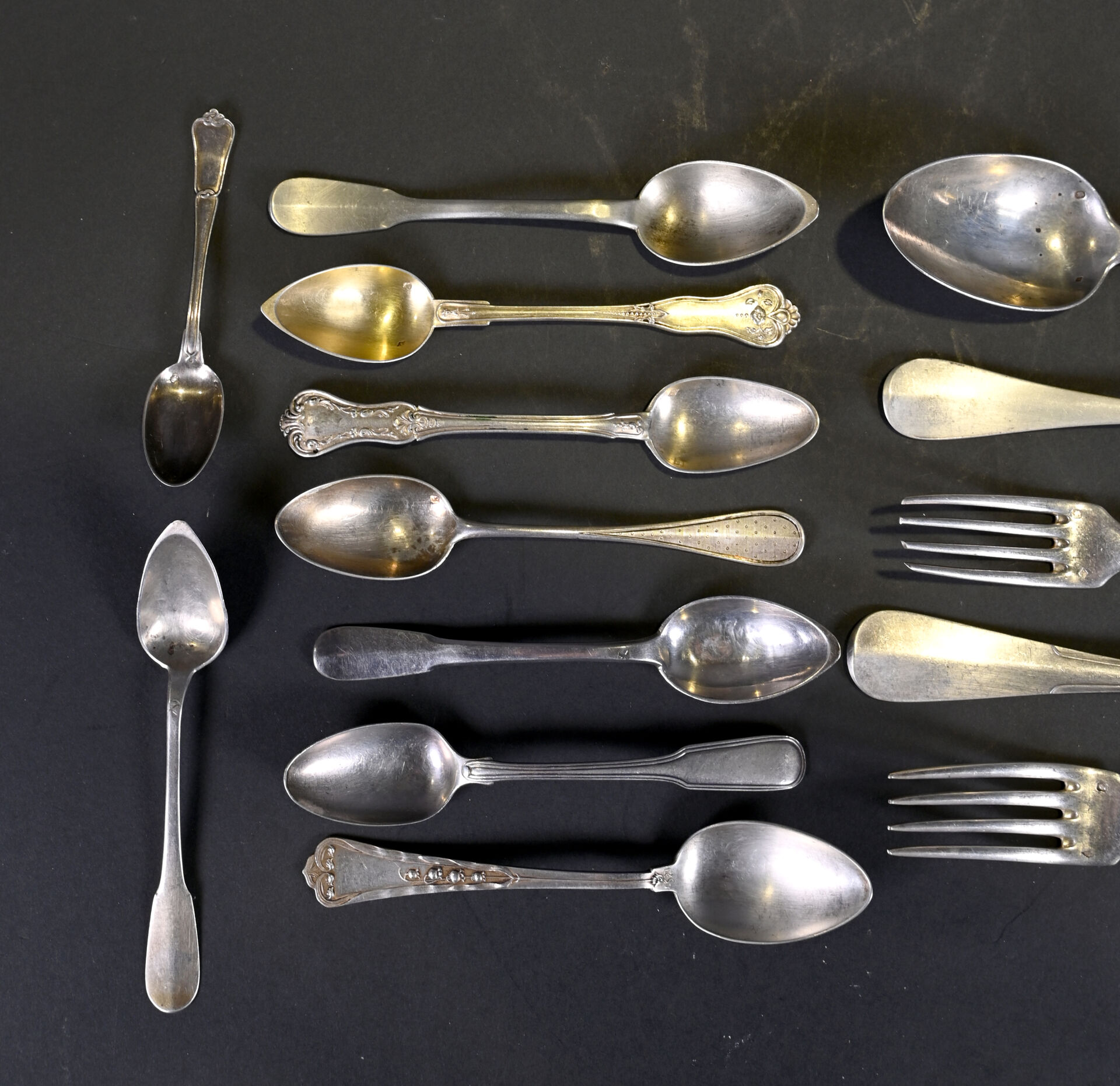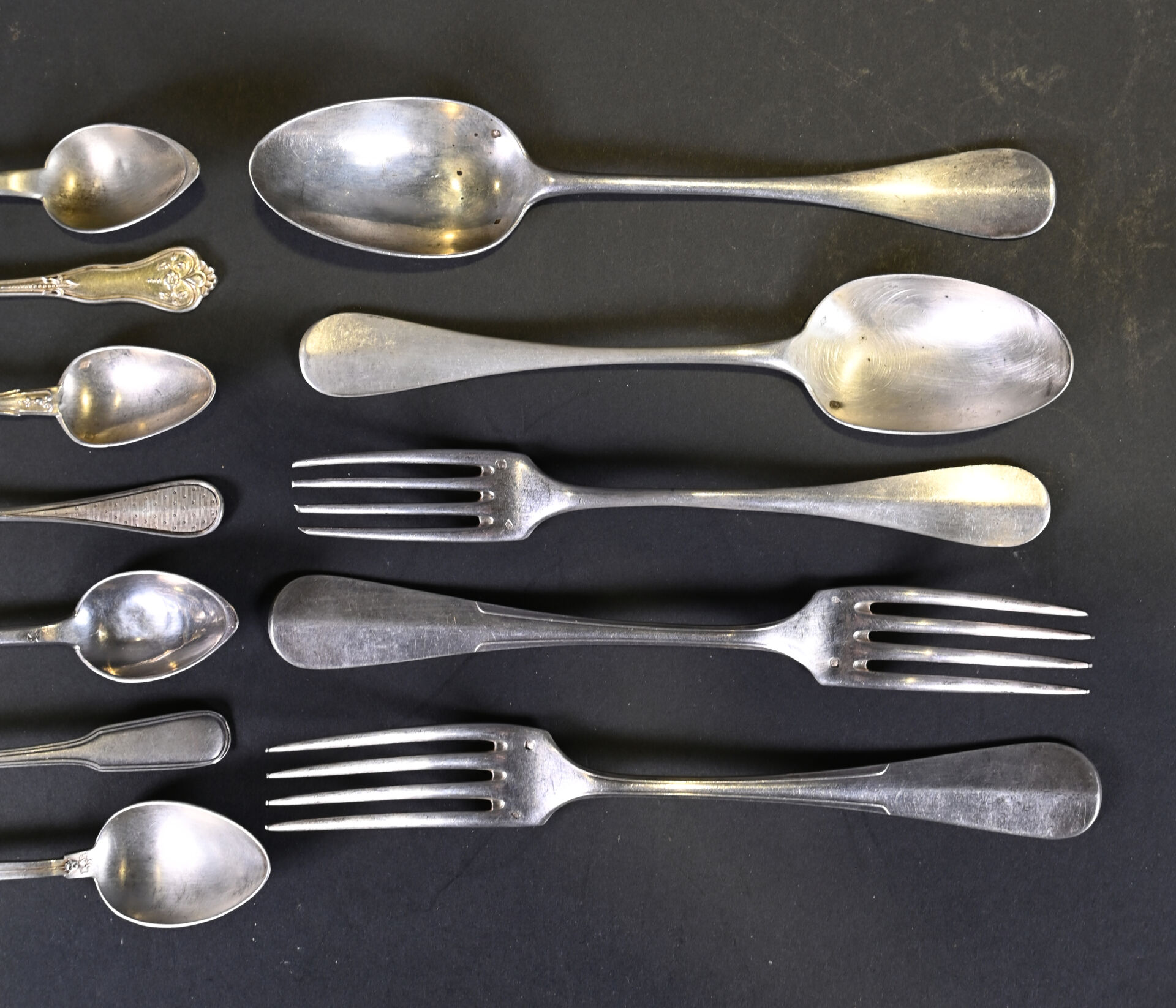 Ensemble en argent 925/1000e et 800/1000e soit trois grandes fourchettes, deux grandes cuillères, 8 petites cuillères et une cuillère à moka. Poids total. : 515 g.