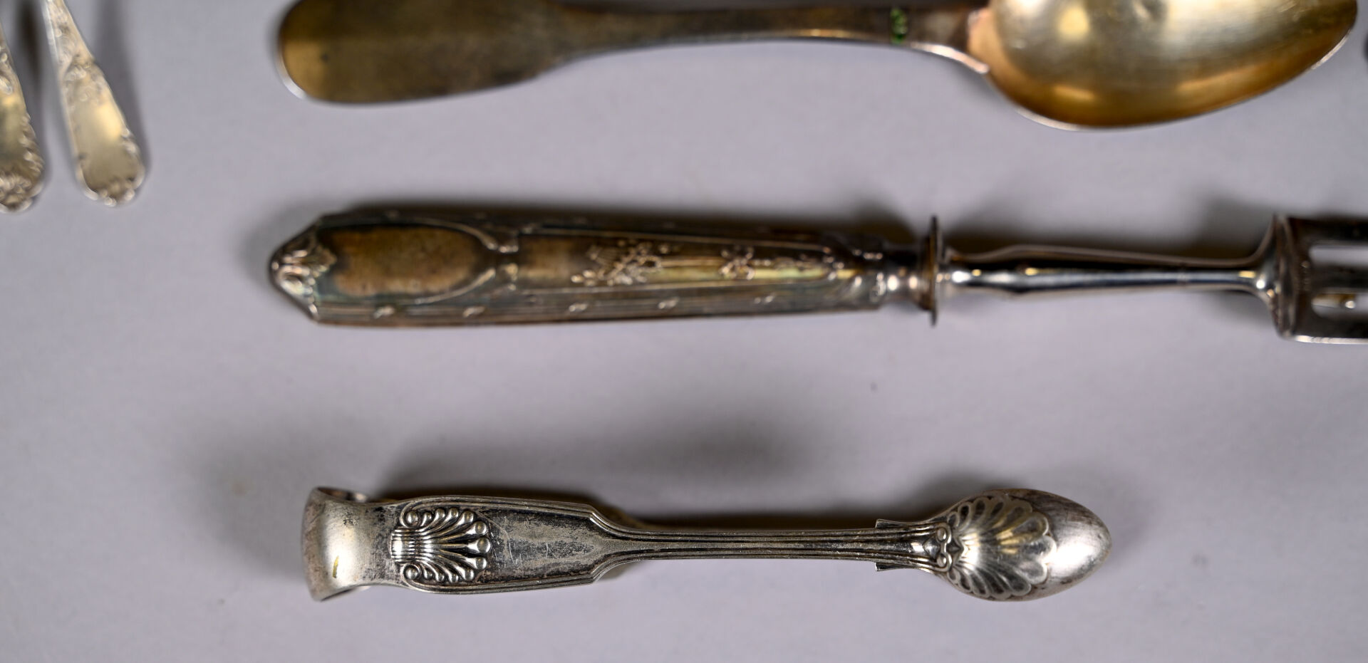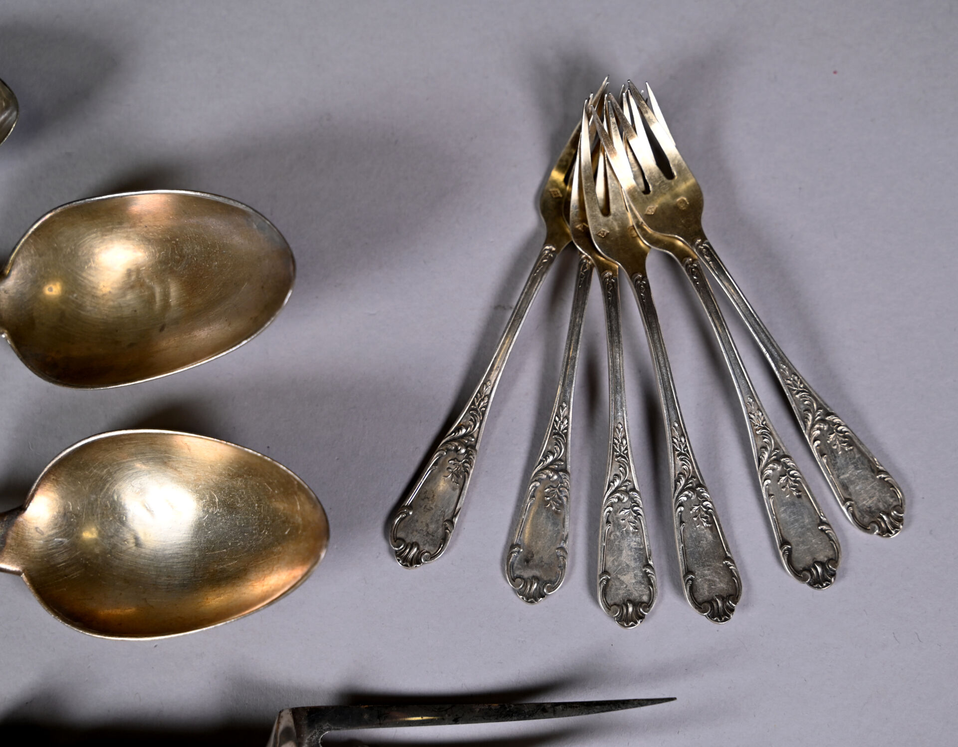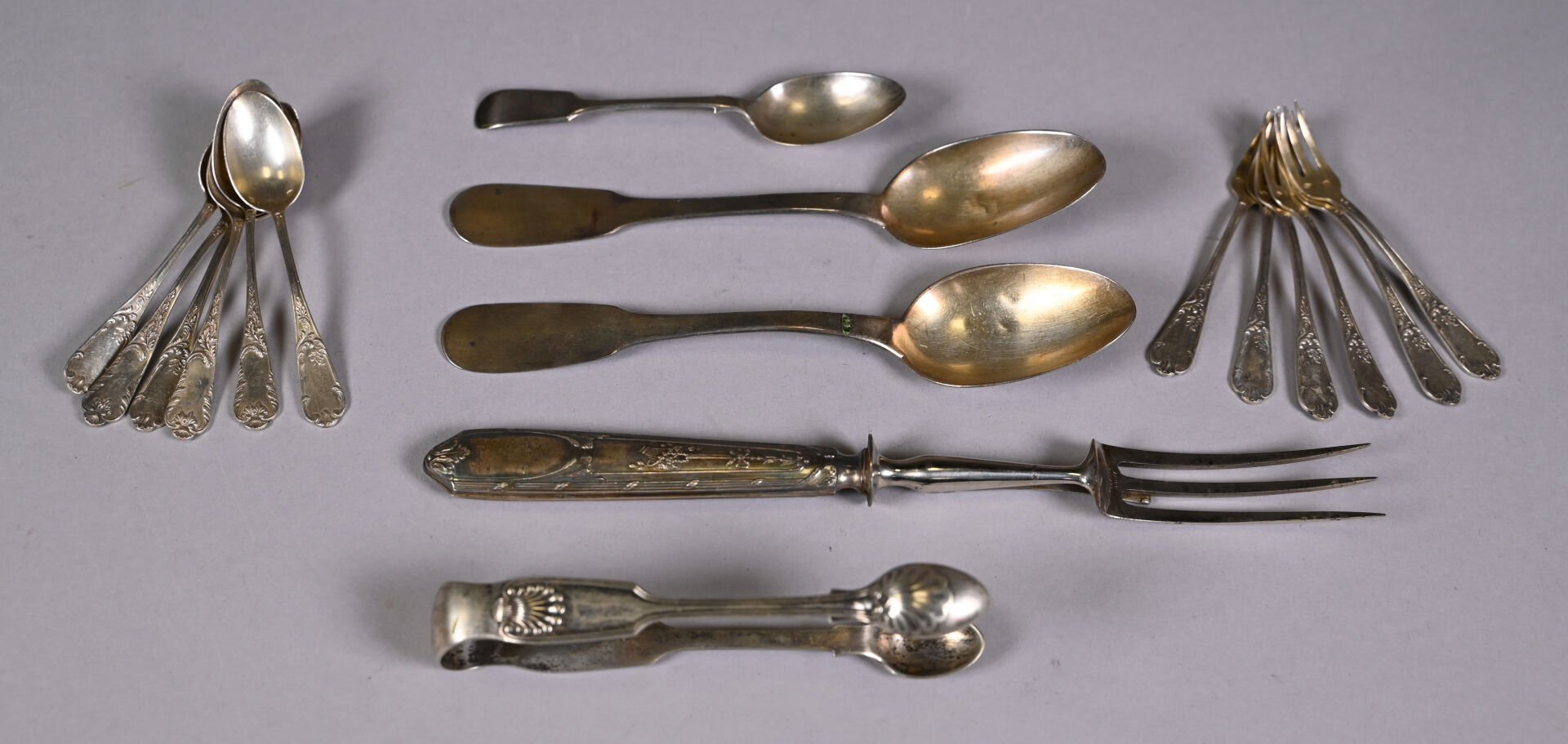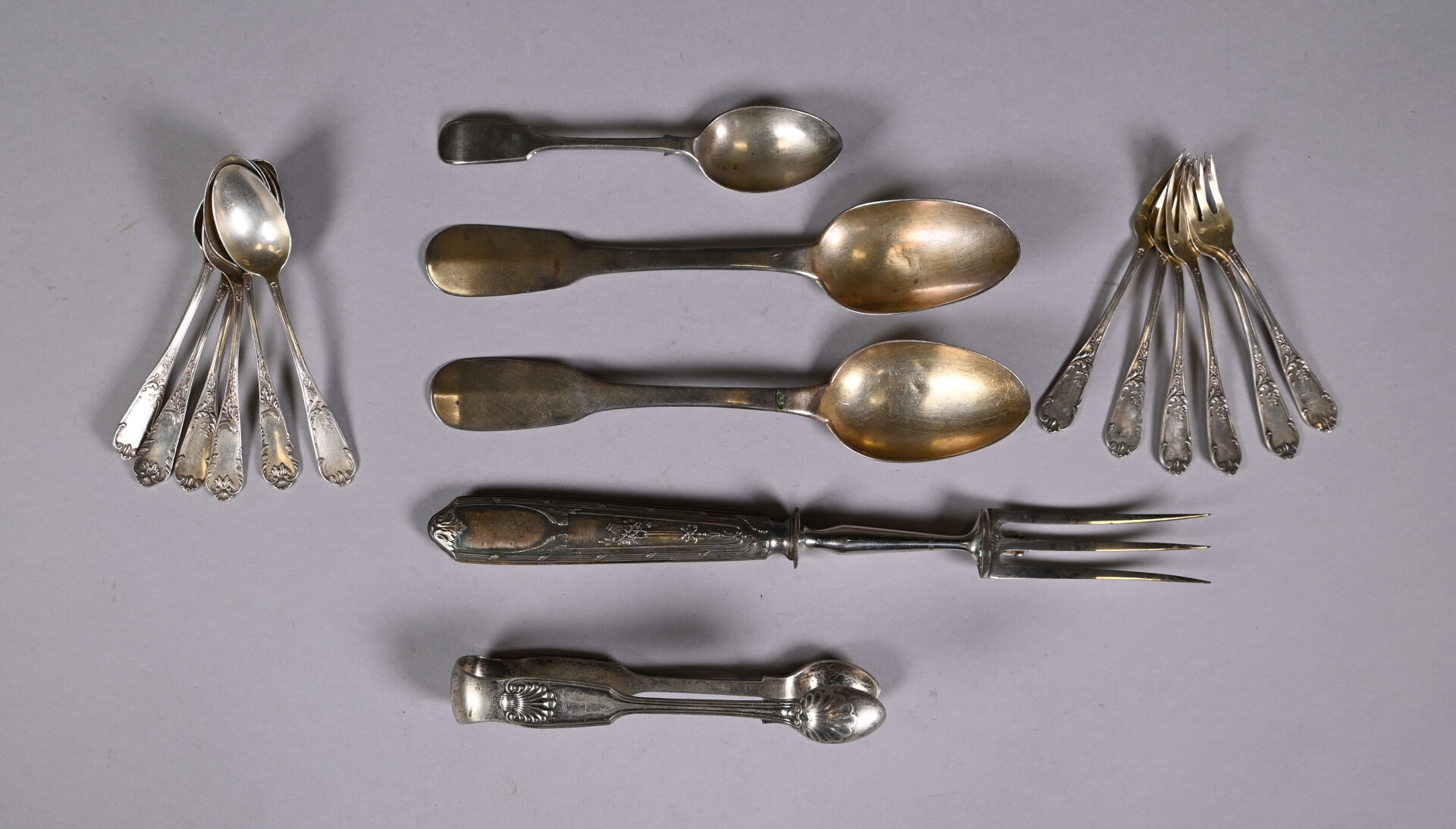 Ensemble en argent 925/1000e et 800/1000e soit une pince à sucre, deux grandes cuillères, six fourchettes à mignardises, 6 cuillères à moka, une petite cuillère. Poids total : 366 g. On joint une fourchette de service à viande à manche en argent fourré. Poids brut. : 106 g.