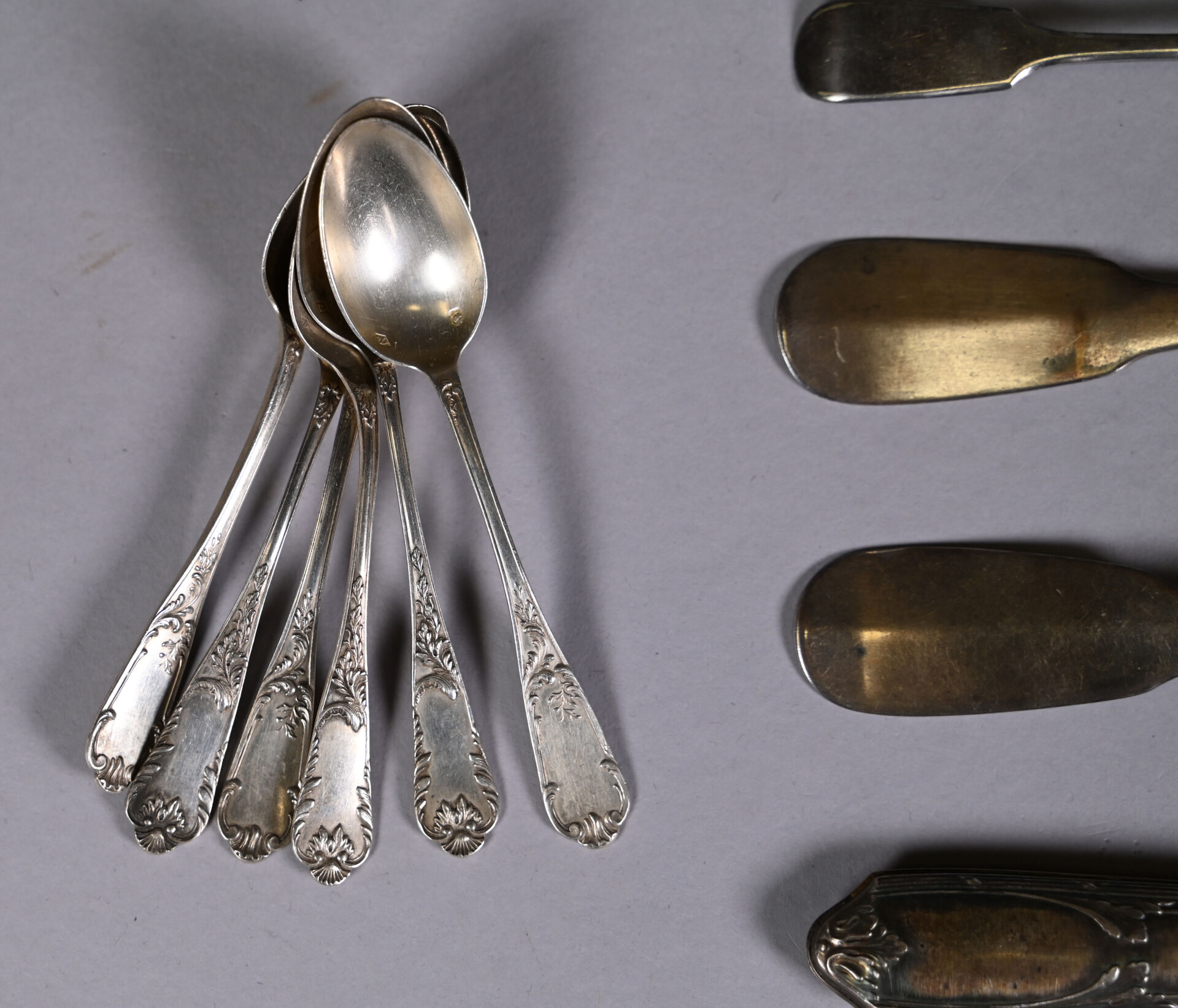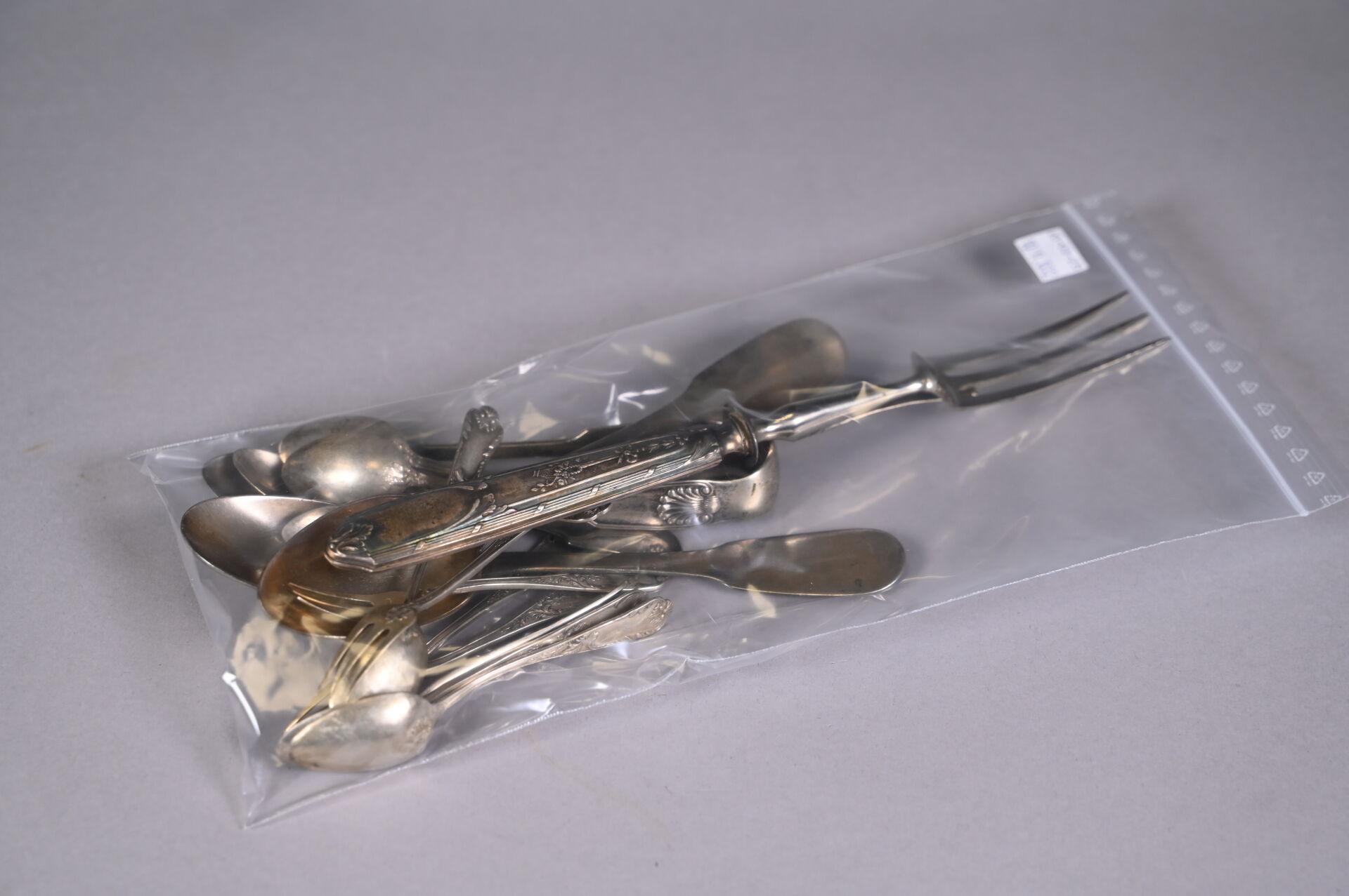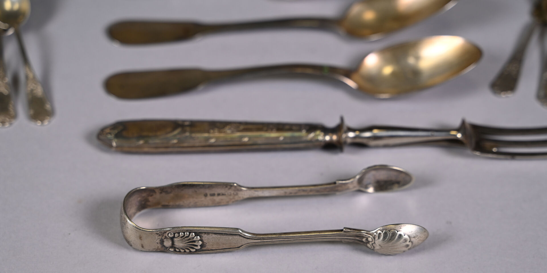 Ensemble en argent 925/1000e et 800/1000e soit une pince à sucre, deux grandes cuillères, six fourchettes à mignardises, 6 cuillères à moka, une petite cuillère. Poids total : 366 g. On joint une fourchette de service à viande à manche en argent fourré. Poids brut. : 106 g.