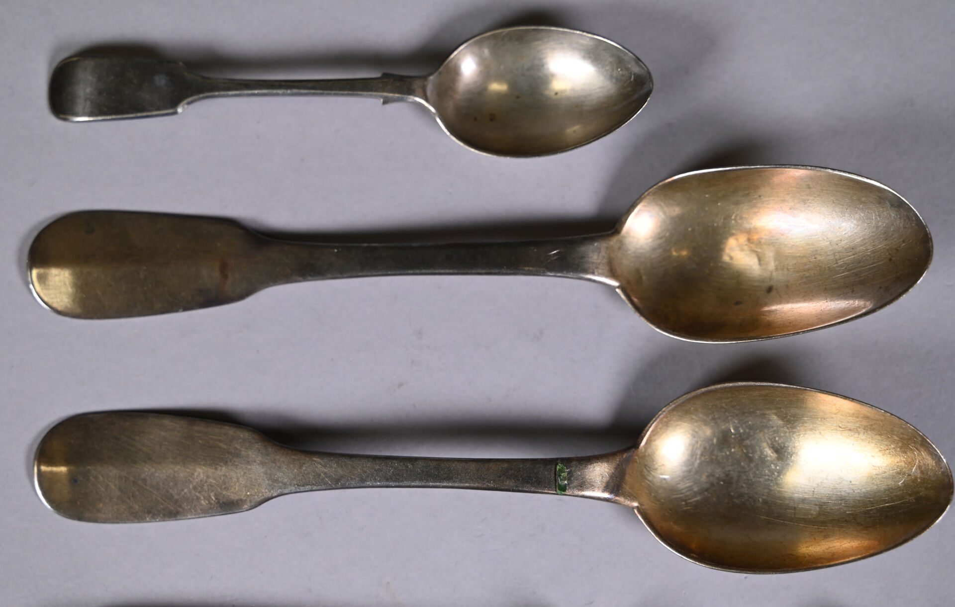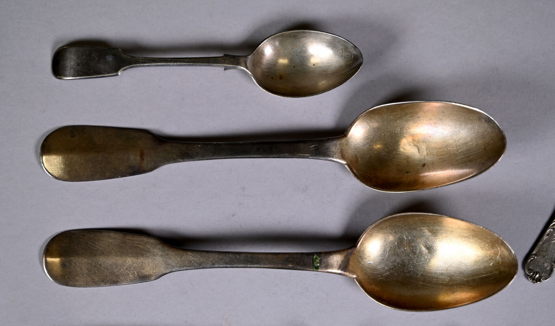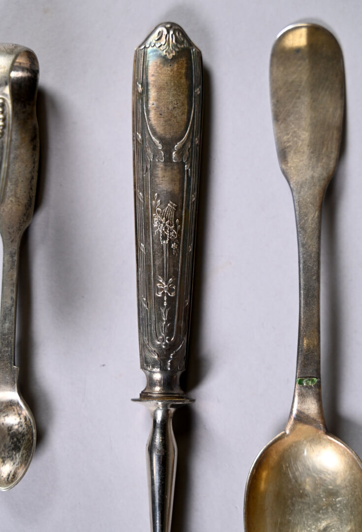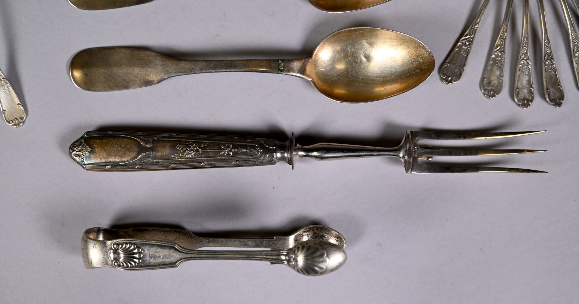 Ensemble en argent 925/1000e et 800/1000e soit une pince à sucre, deux grandes cuillères, six fourchettes à mignardises, 6 cuillères à moka, une petite cuillère. Poids total : 366 g. On joint une fourchette de service à viande à manche en argent fourré. Poids brut. : 106 g.