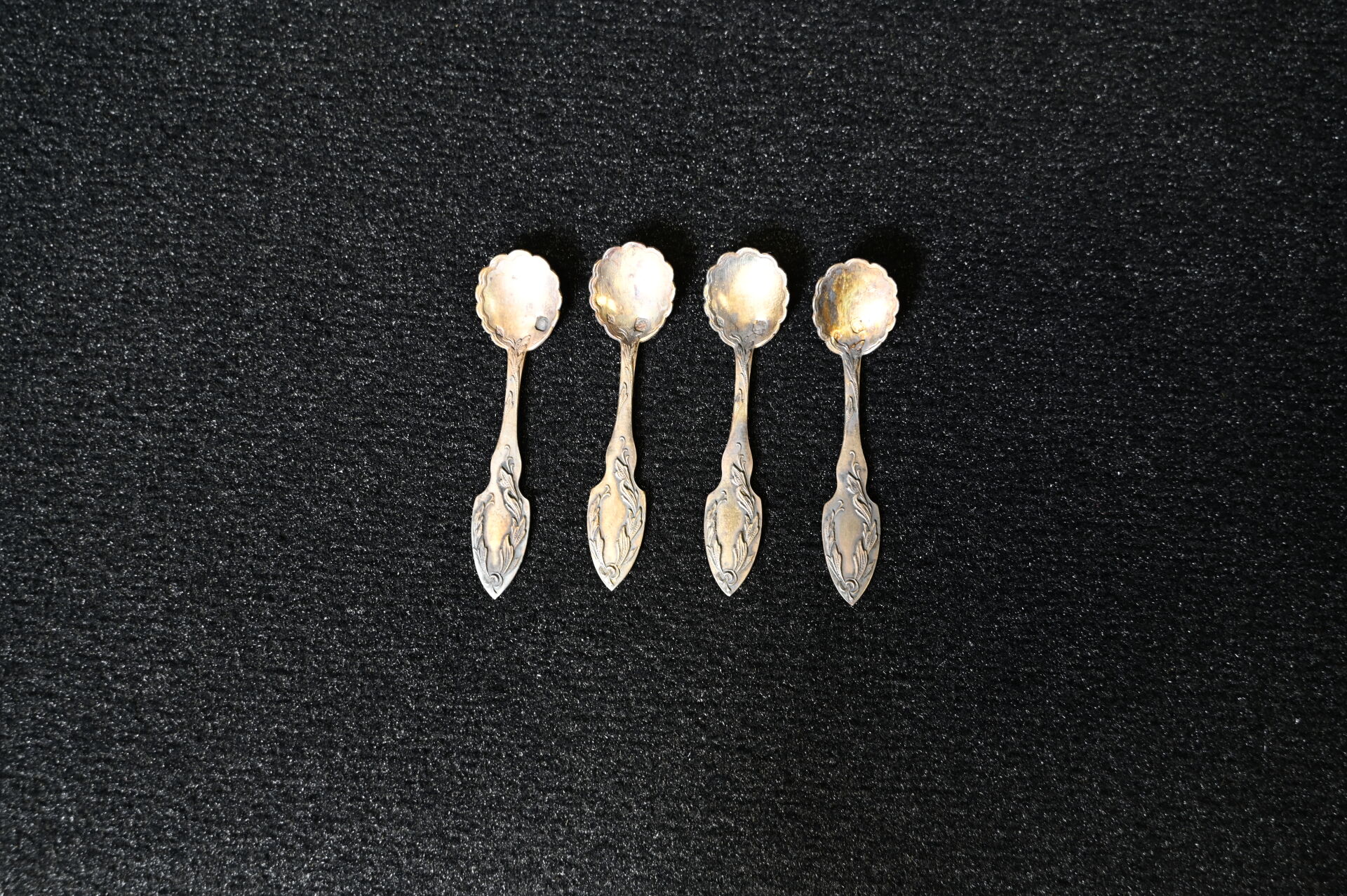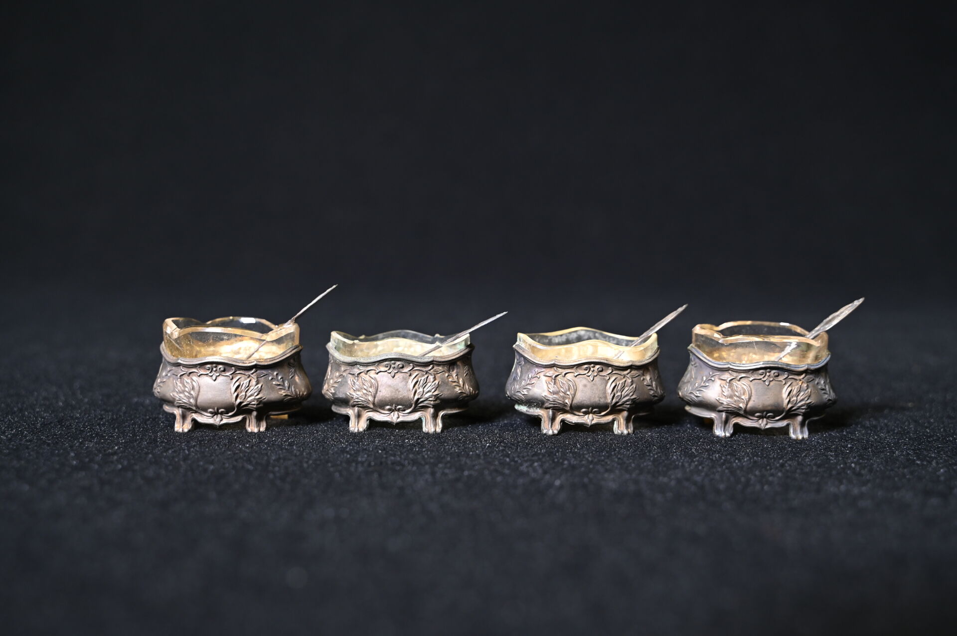 Ensemble en argent 925/1000e soit 4 salerons à intérieur en verre amovible et 4 petites cuillères (boite). Poids total. : 52 g.