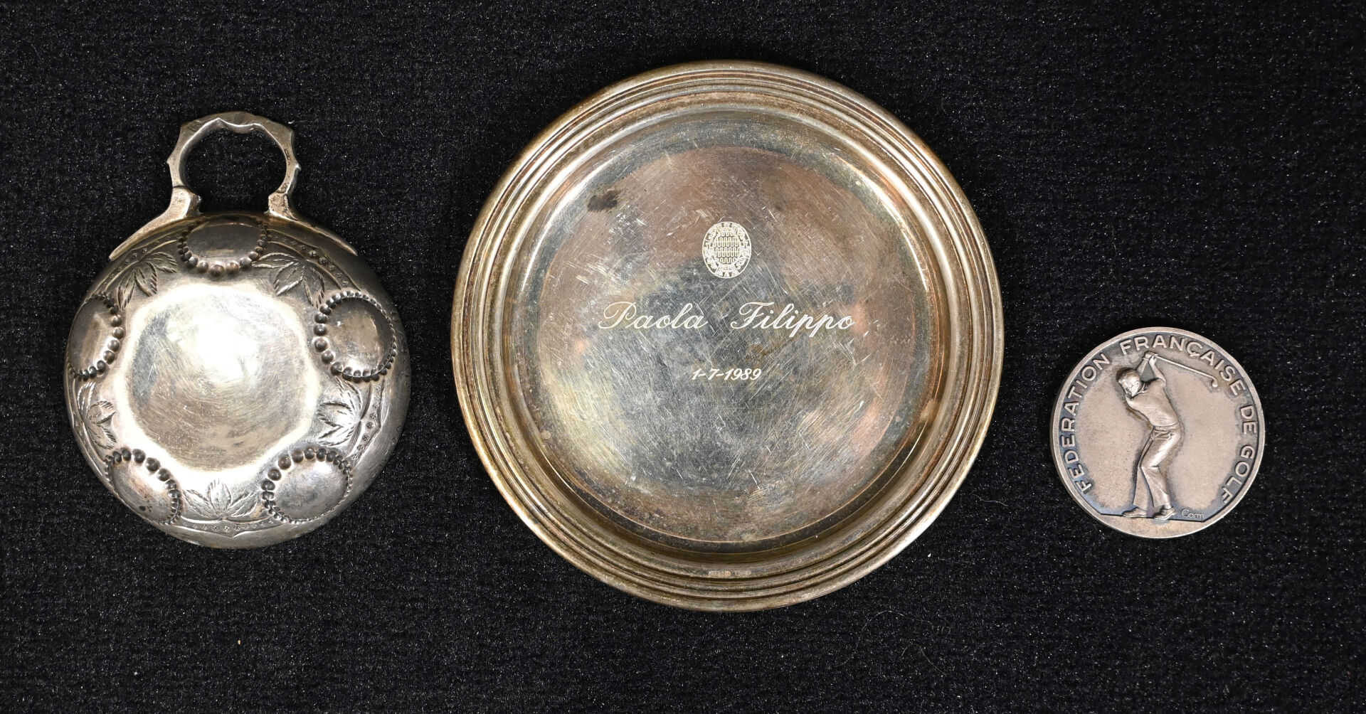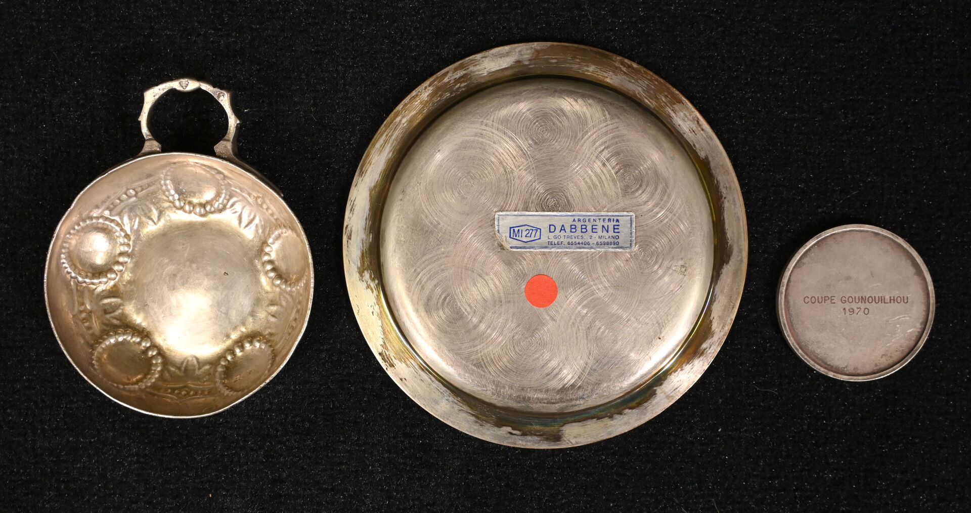 Ensemble en argent 925/1000e soit un tastevin, une coupelle (a charge) et une médaille. Poids total. : 148 g. Poids de la coupelle : 65 g.