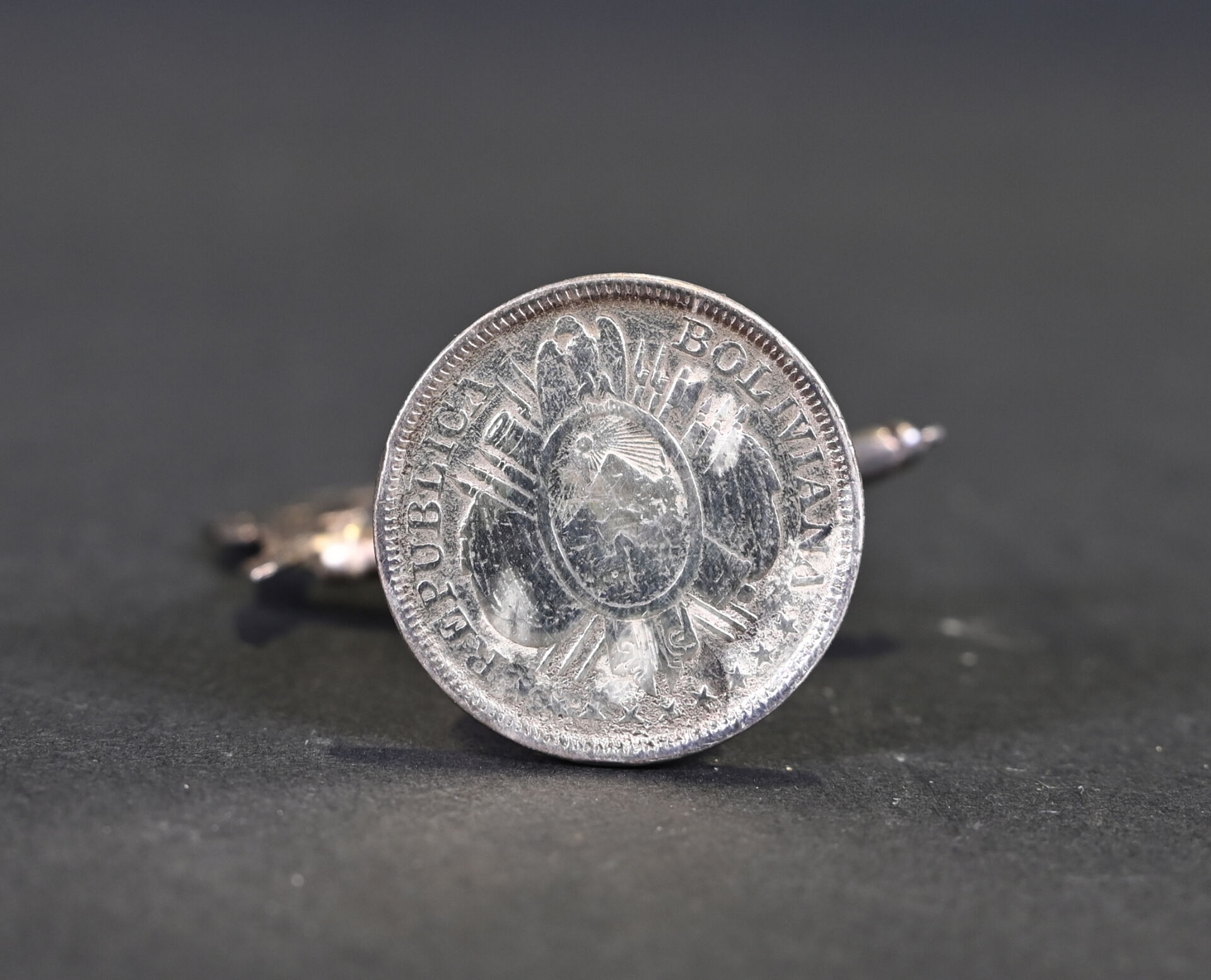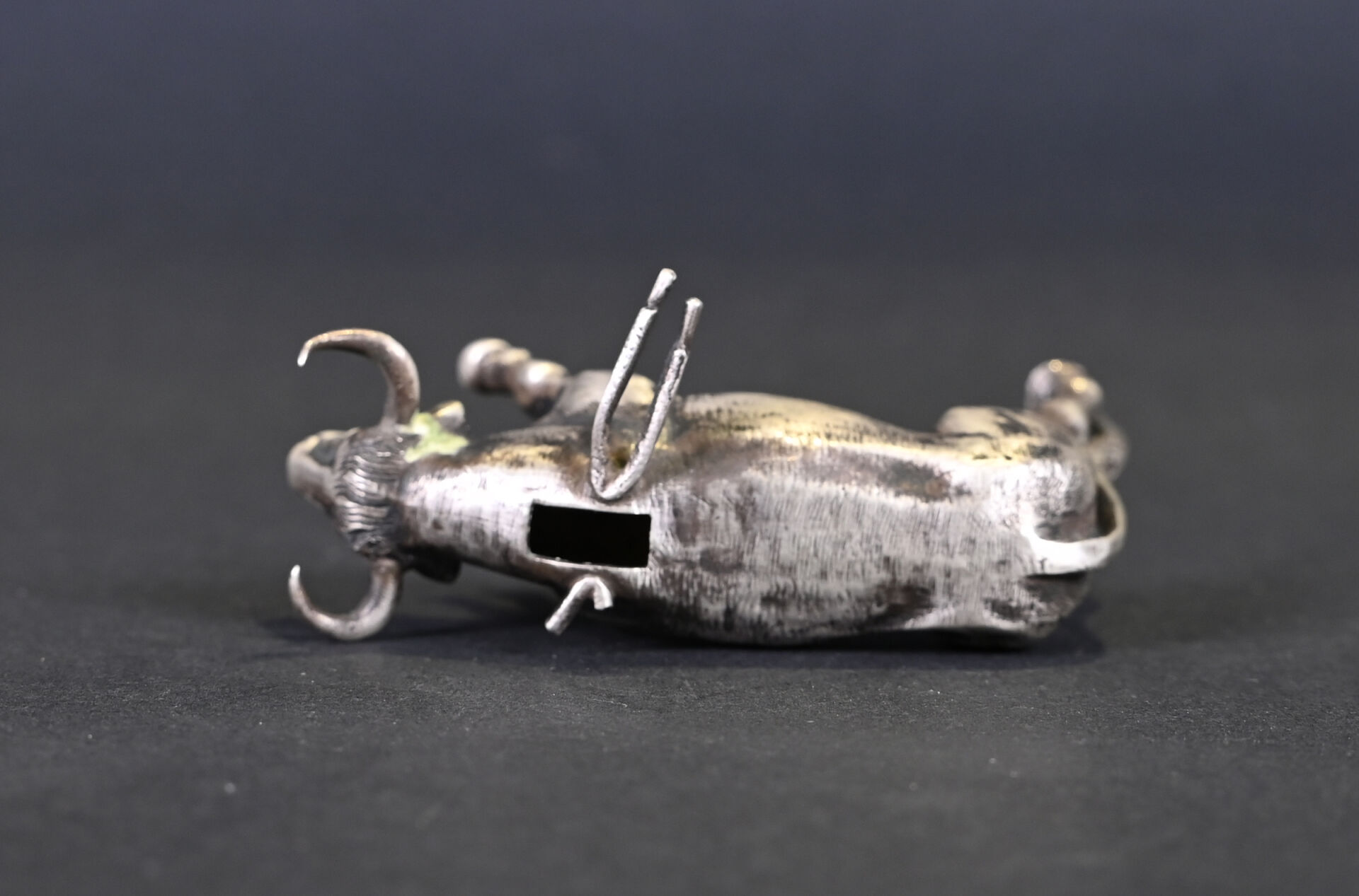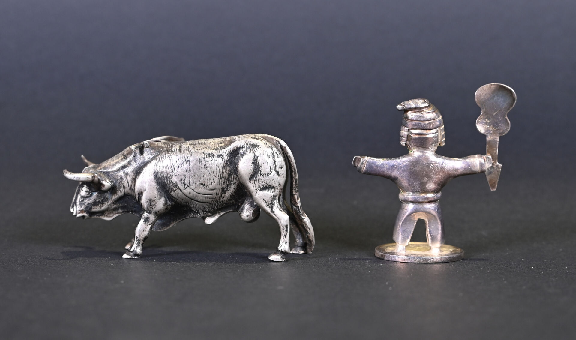Ensemble en argent 925/1000e soit un taureau (accidenté) et un Bolivien tenant une guitare à l’envers sur une pièce. Poids total. : 132 g.