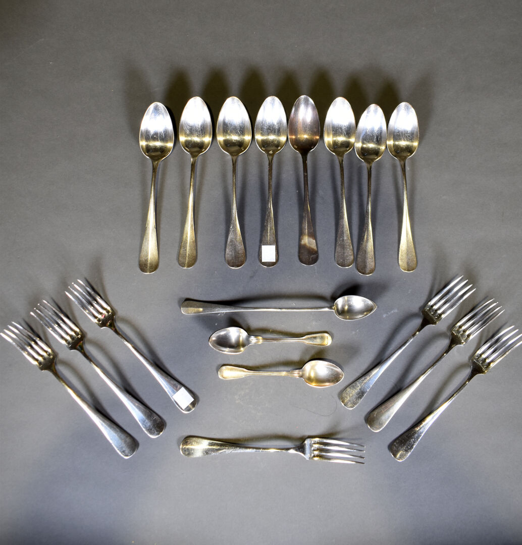 Ensemble en argent 925/1000e soit une timbale à décor de fleurs ciselées (chocs). Poids : 85,85 g. On joint une petite boite en argent anglais à intérieur en bois exotique, une pelle à tarte, la pelle en argent 925/1000e et le manche en argent fourré, 6 couverts de service variés à manches en argent (poinçon minerve), 4 couverts à mignardises à manches en argent fourré (minerve) et 12 fourchettes à huitres en argent 850/1000e les manches en argent fourré. Poids brut total : 1390 g. On joint également un ensemble de couverts en métal argenté dont une louche et une cuillère à saupoudrer CHRISTOFLE et deux cuillères ERCUIS.