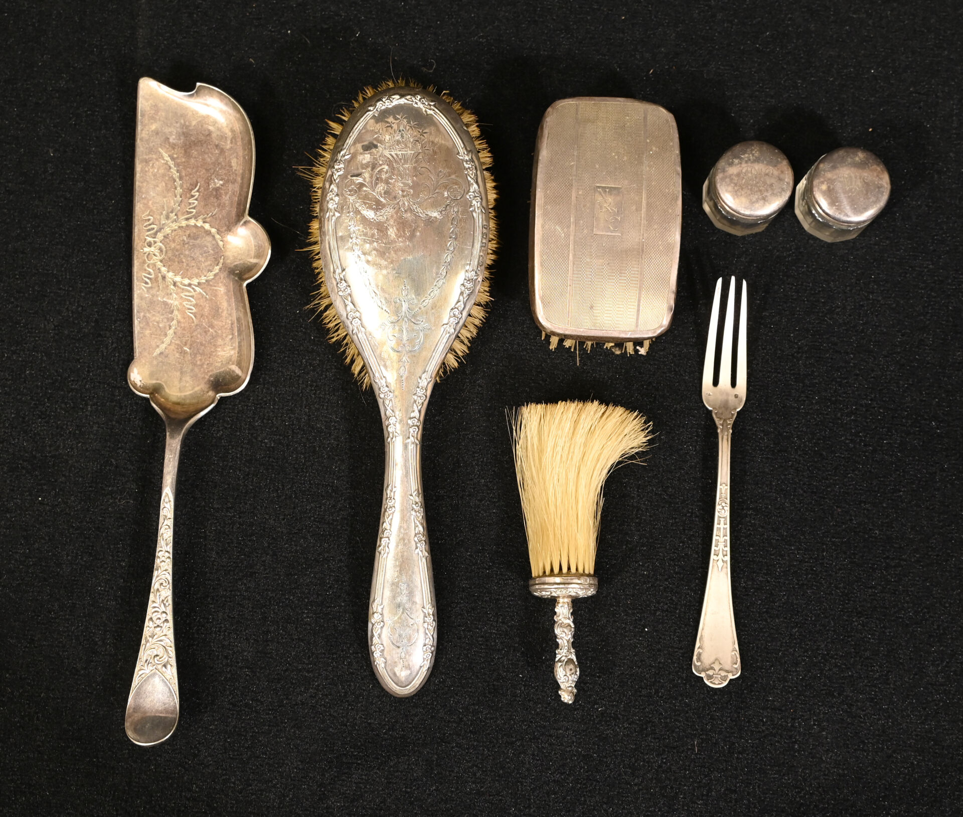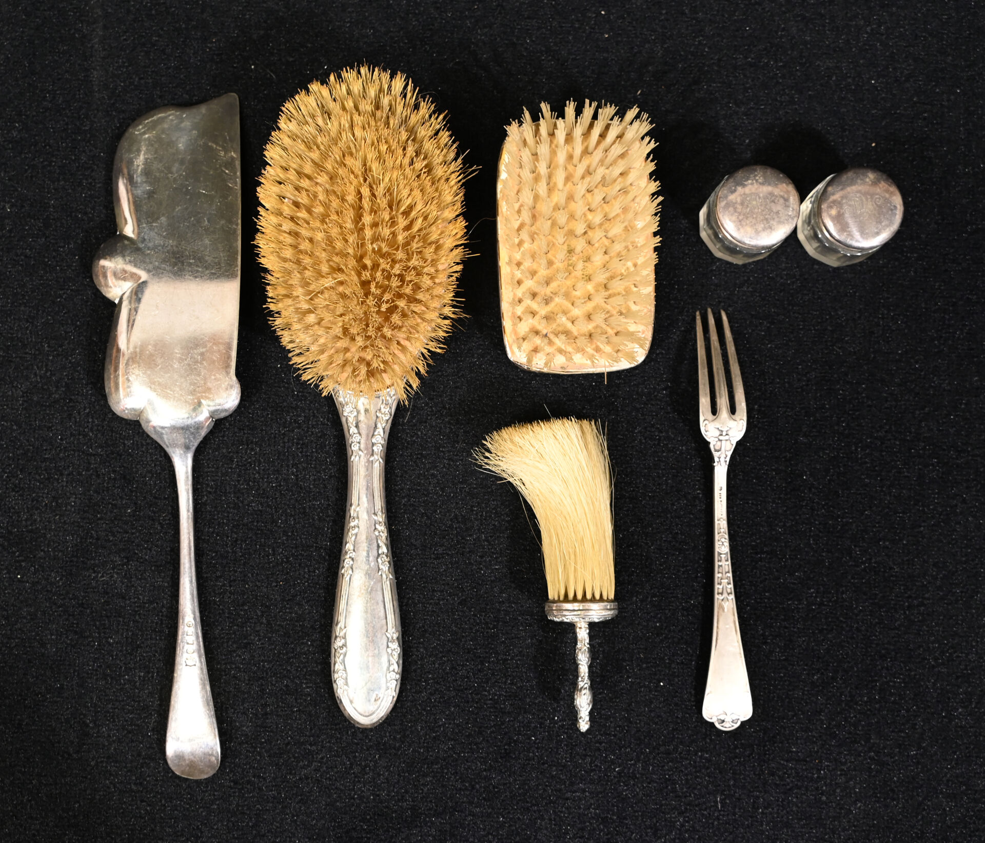 Ensemble en argent 925 et 800/1000e soit une fourchette (Poids. : 51 g – Allemagne), une pelle (Poids. : 187 g – A charge) et une balayette, deux brosses et deux pots en verre. Poids brut. : 369 g.