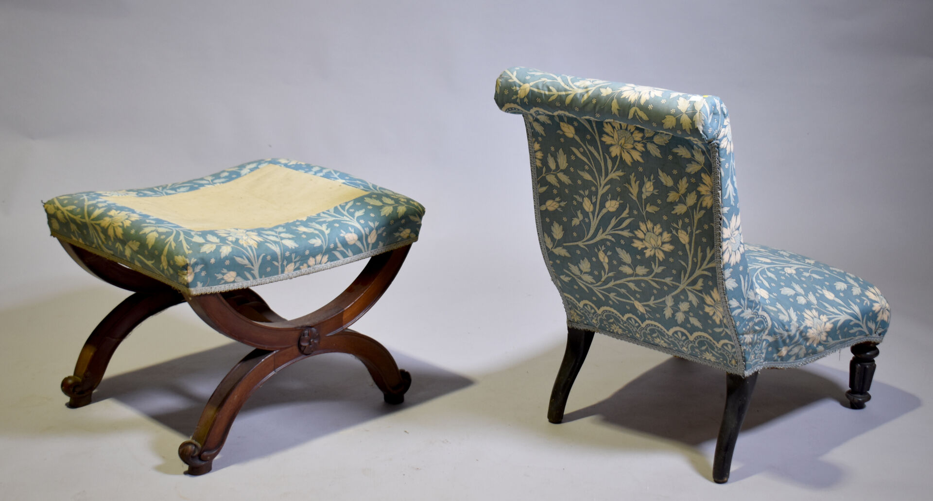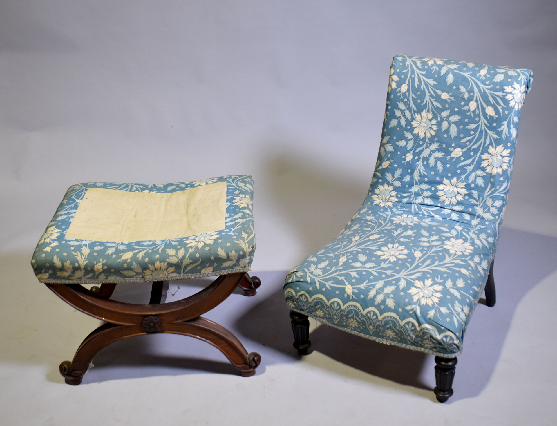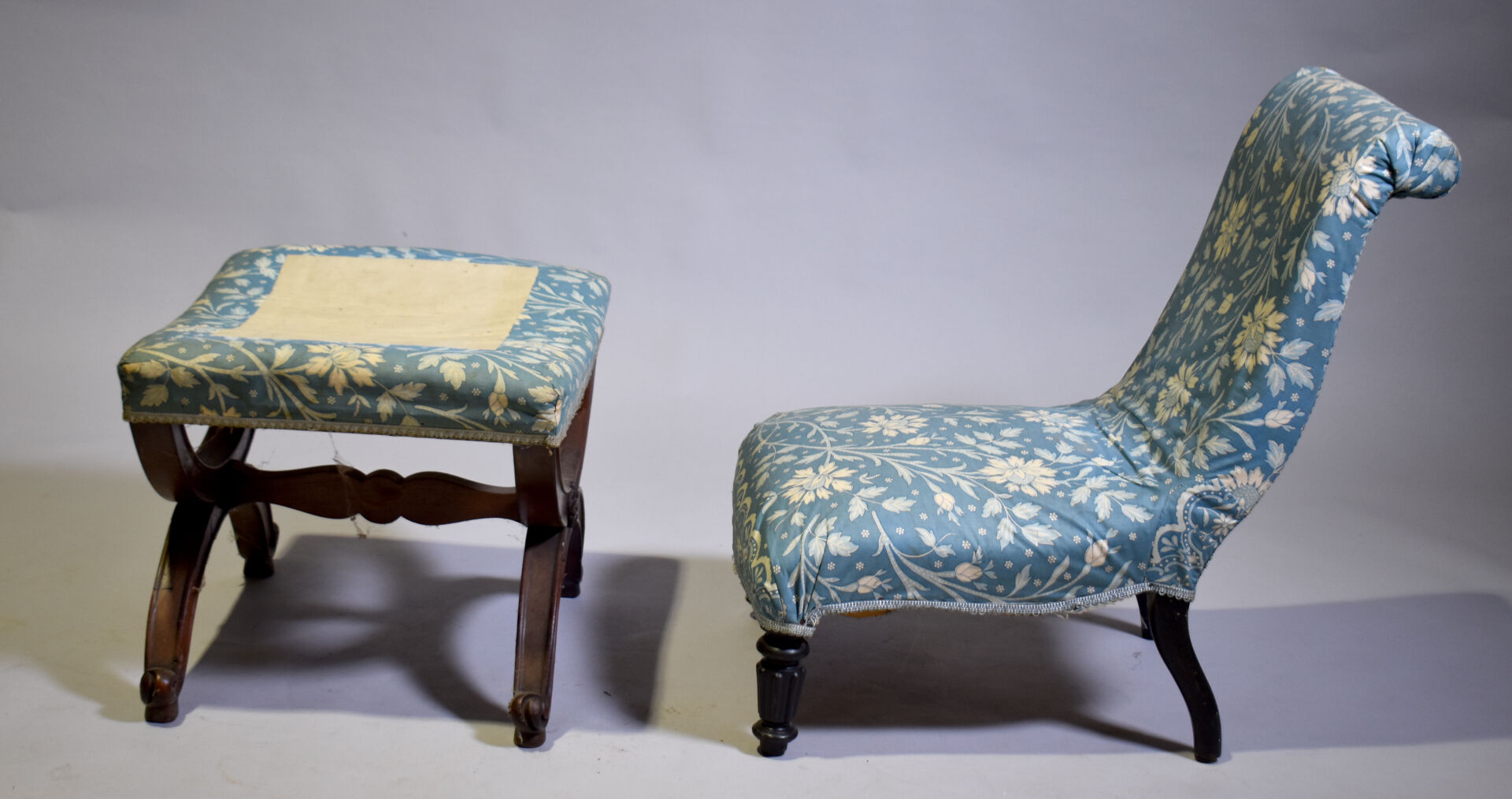 Ensemble en bois teinté et acajou soit une chauffeuse garnis de tissus bleu (postérieur) et un repose-pied (manque un coussin, restaurations). Haut. : 72 cm.