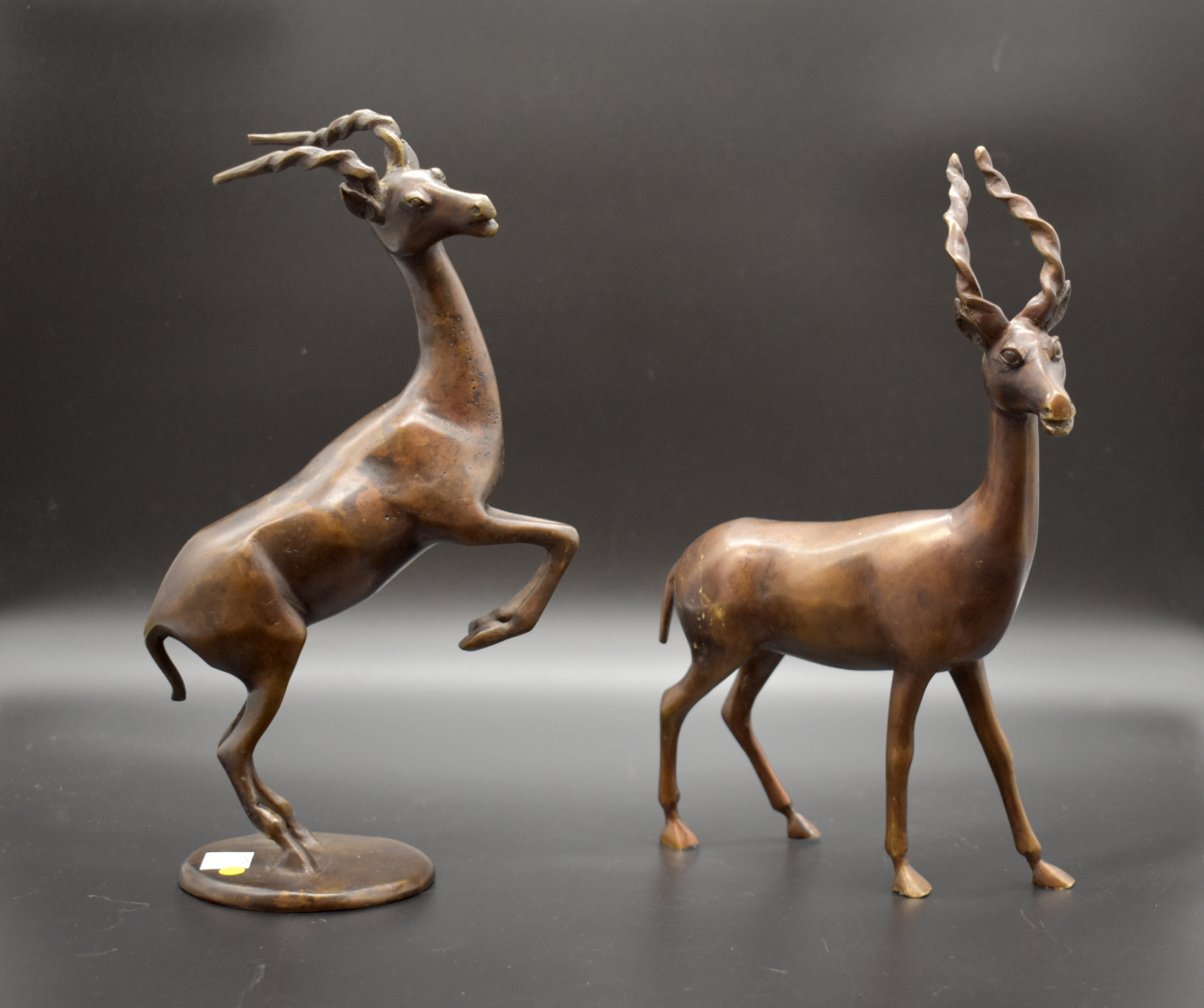Ensemble en bronze, laiton et métal soit un masque Bénin (?), deux gazelles, quatre bracelets de chevilles et une tabatière.