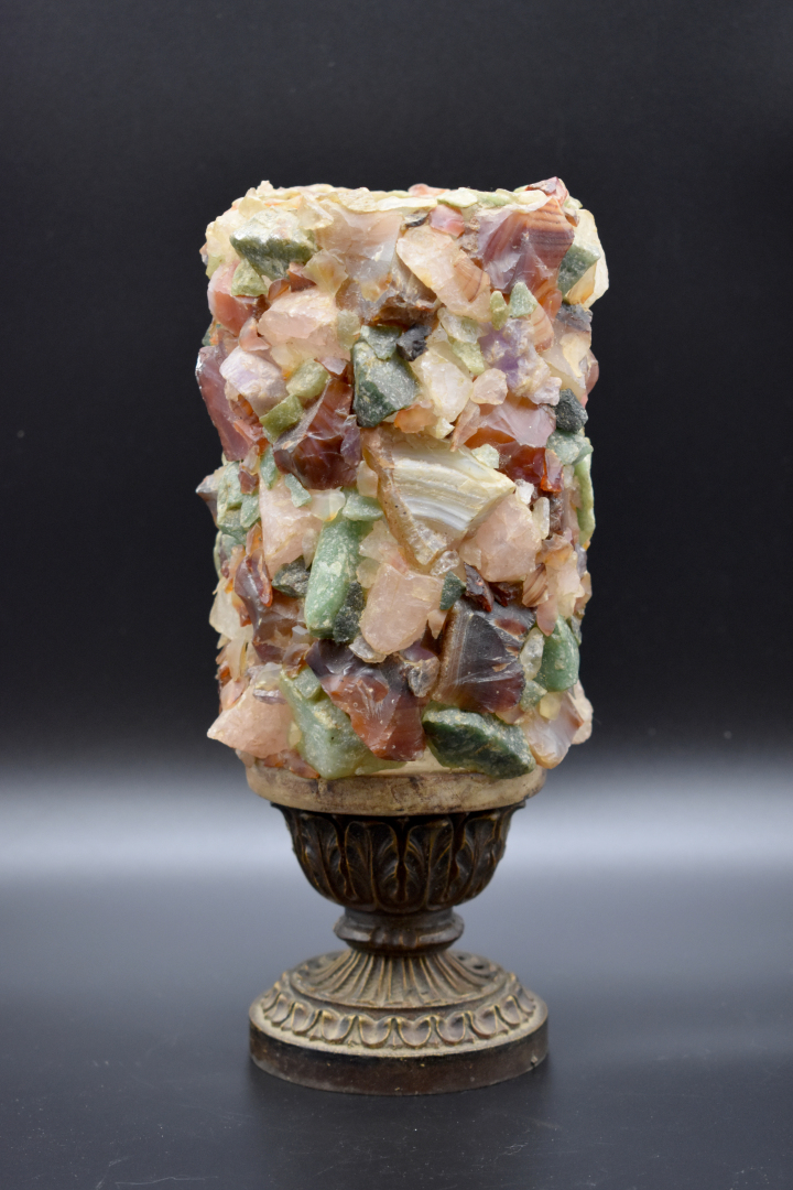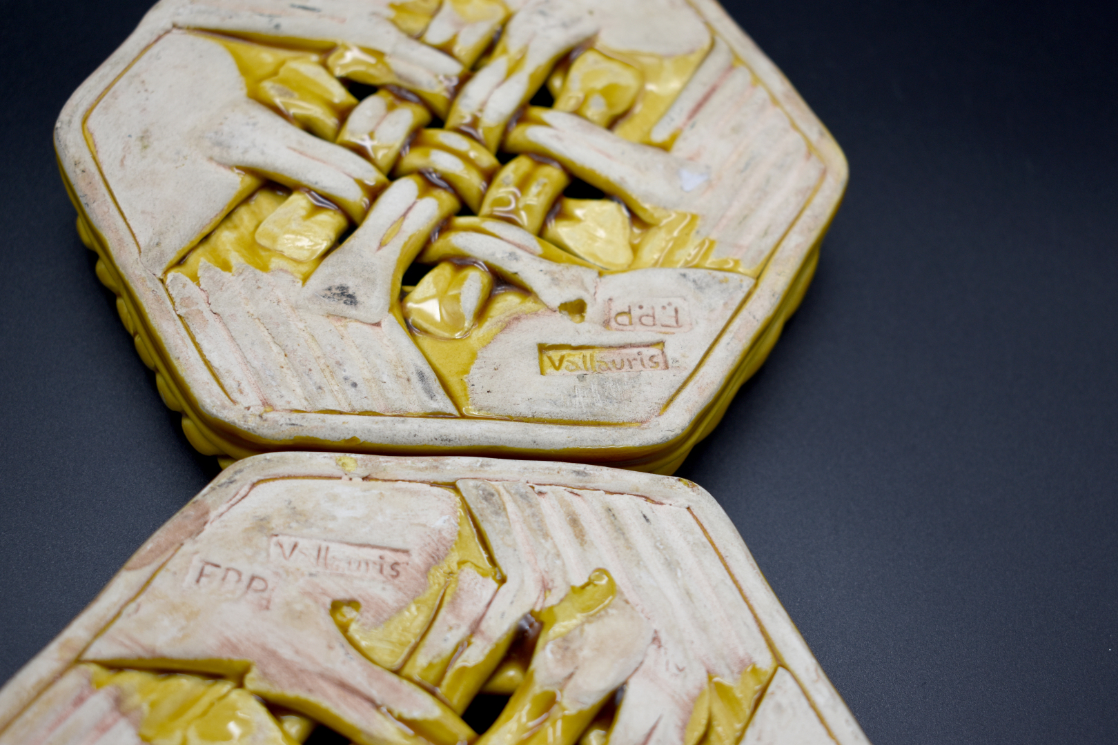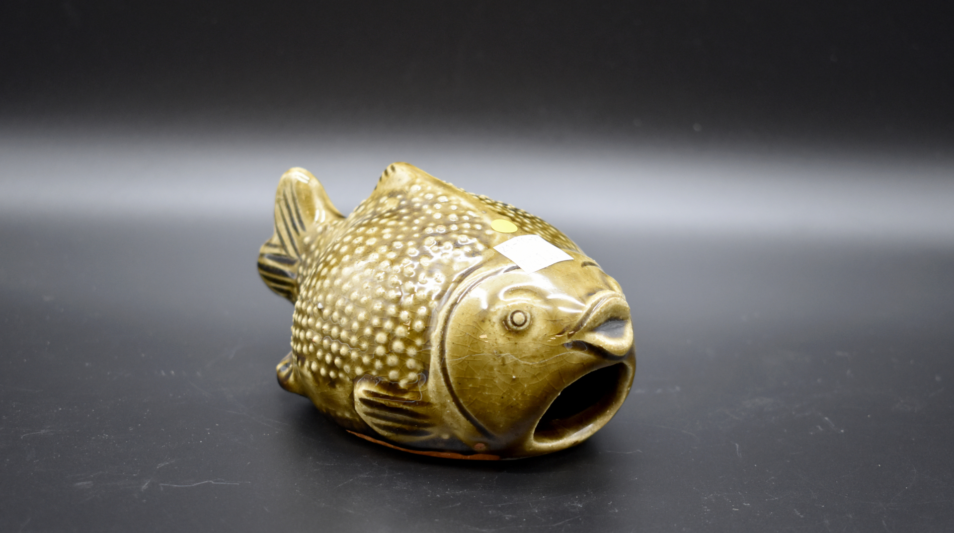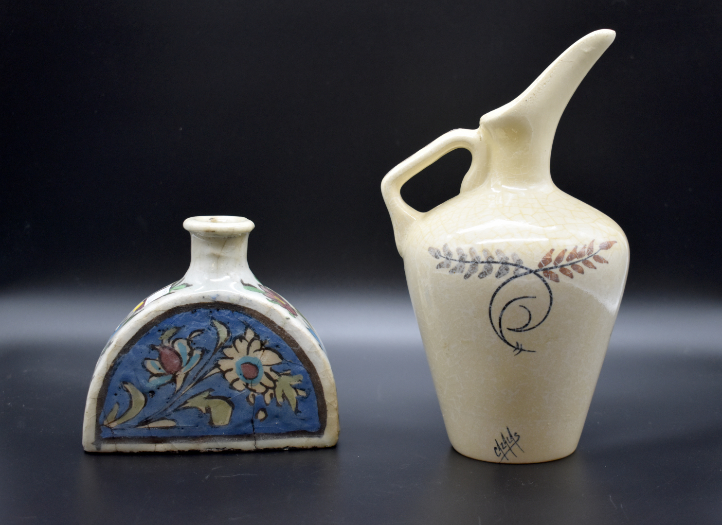 Ensemble en céramique soit deux dessous de bouteilles en faïence jaune de Vallauris, un vase cornet en faïence à décor de fleurs, une verseuse signée Cazalas, un poisson en barbotine, un vase demi-gourde en céramique. On joint un vase en pâte de verre et pierre dure.