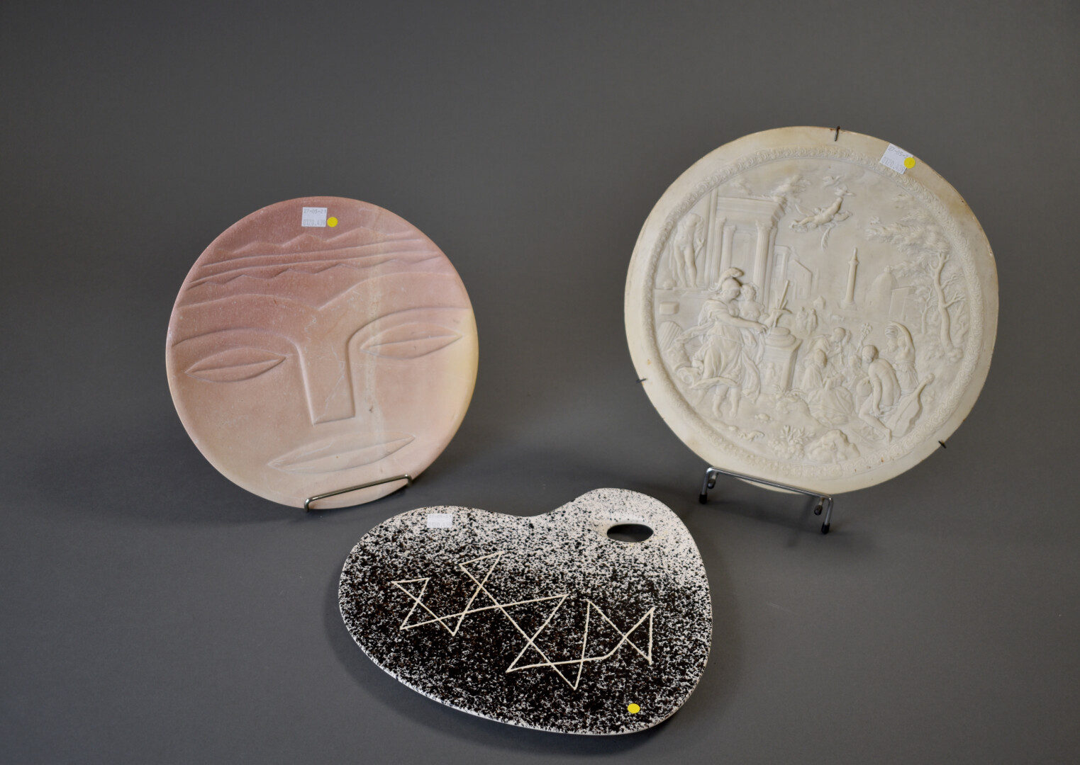 Ensemble en céramique soit un plateau figurant une palette de peintre, une assiette représentant un visage en rose (un fèle restauré), un plat en calcaire moulé représentant une scène à l’antique. Diam. :30 cm.