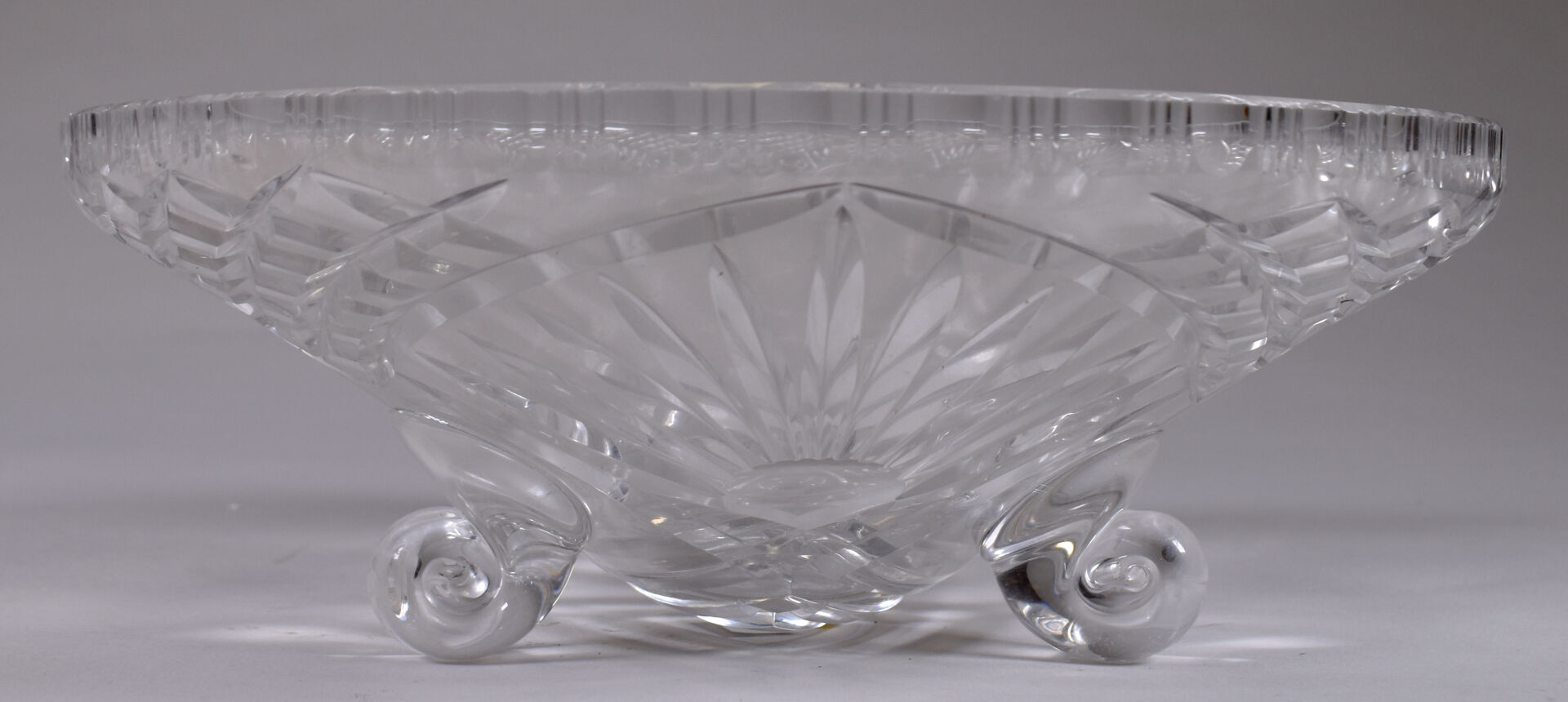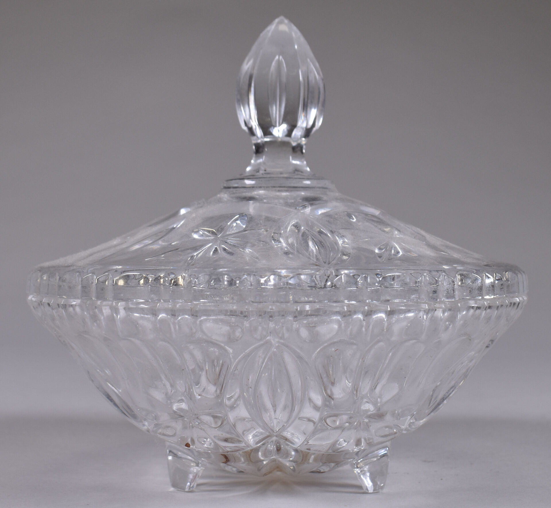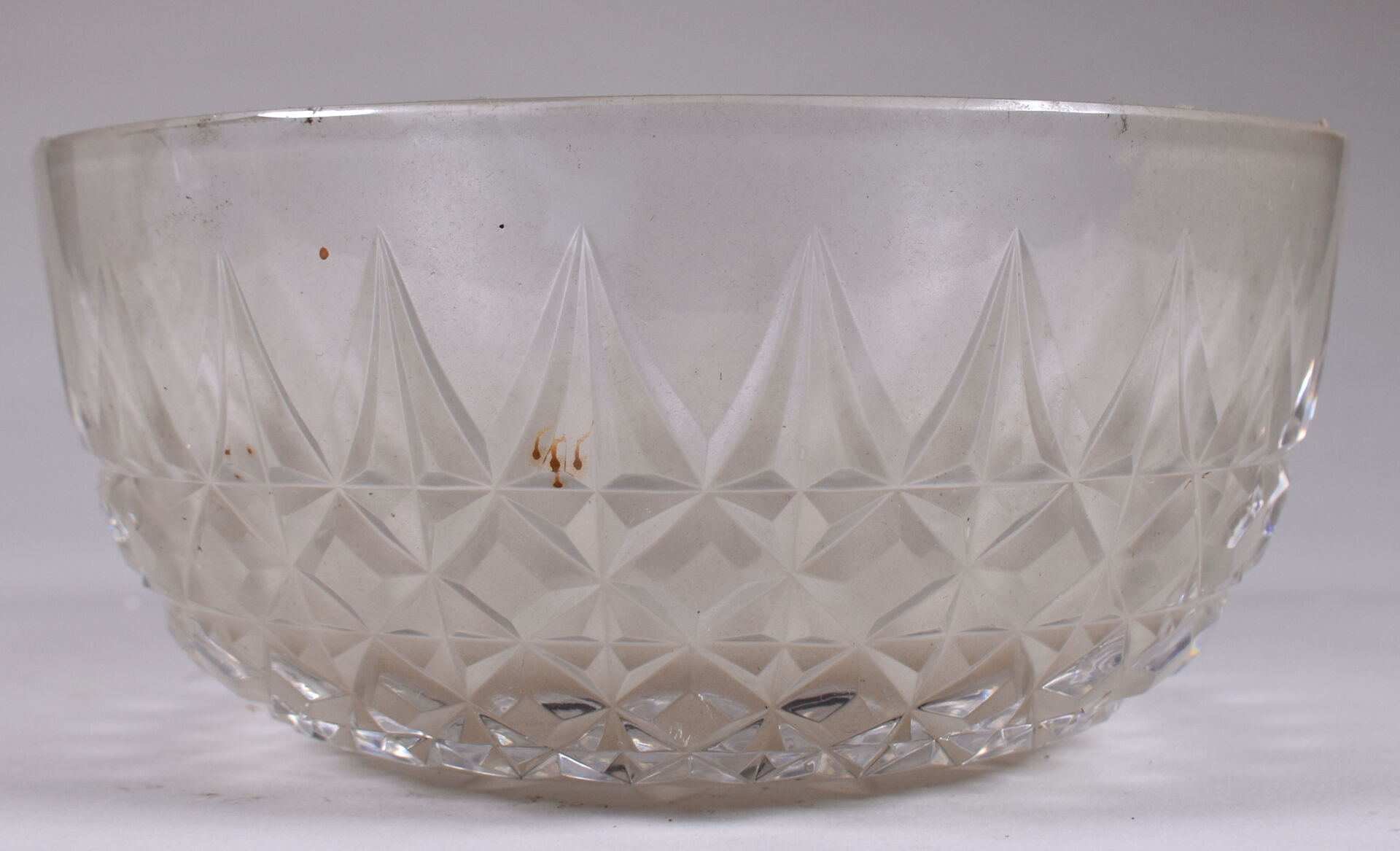 Ensemble en cristal moulé et taillé soit une coupe tripode, un sucrier, un flacon, une bouquetière et un saladier (égrenures). Dim. de la coupe. Haut. : 10,5 cm – Larg. : 31 cm.