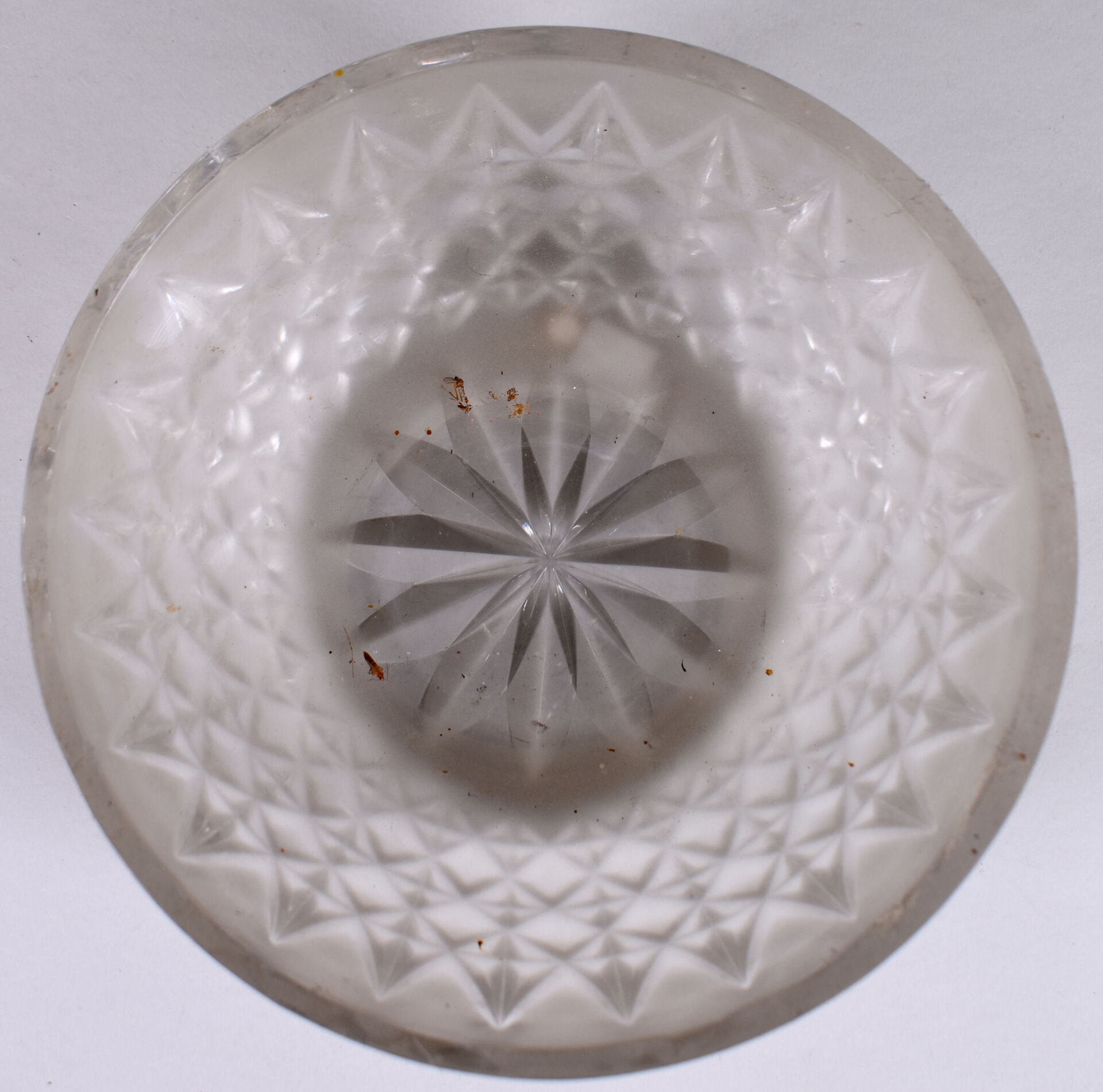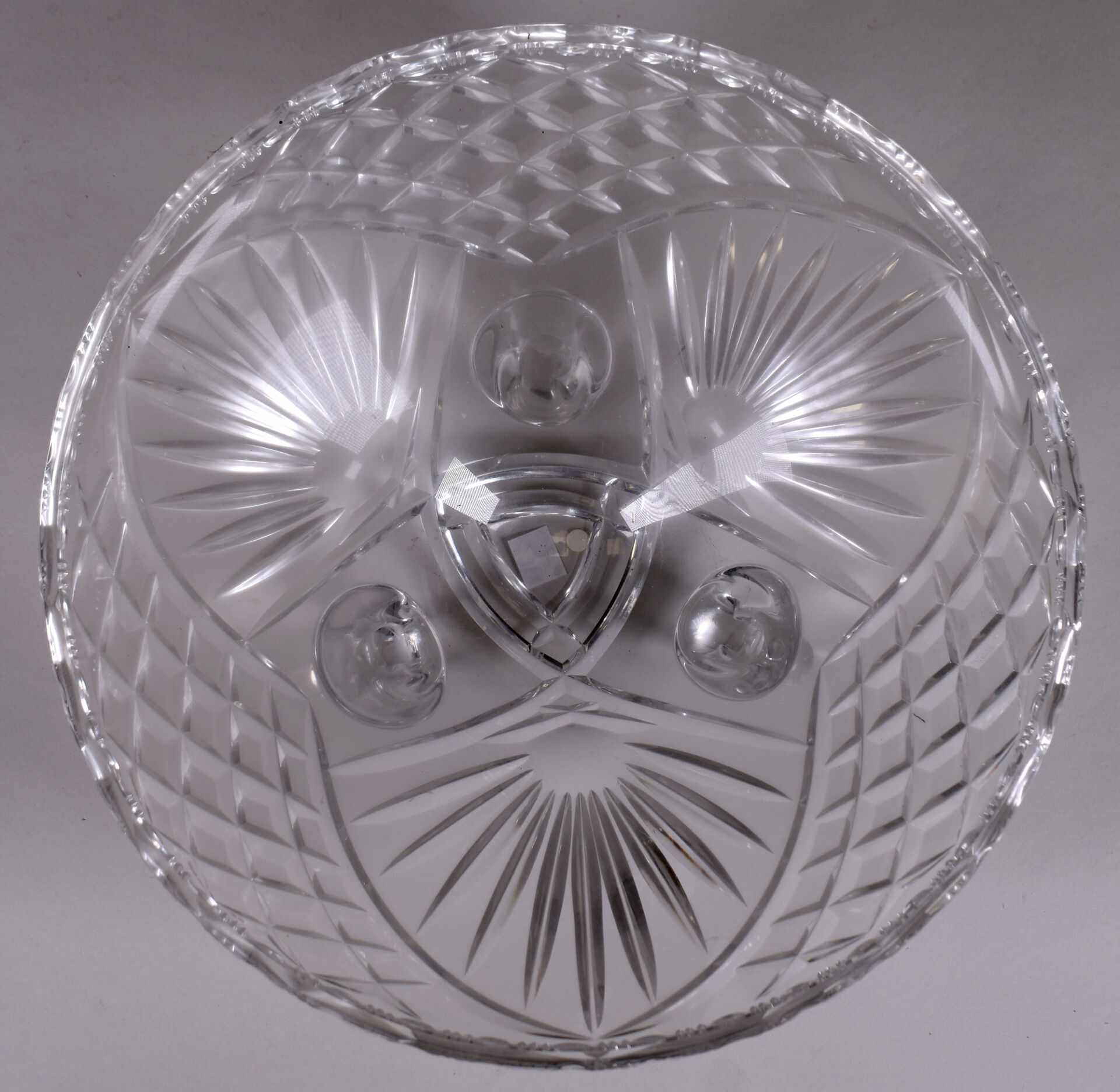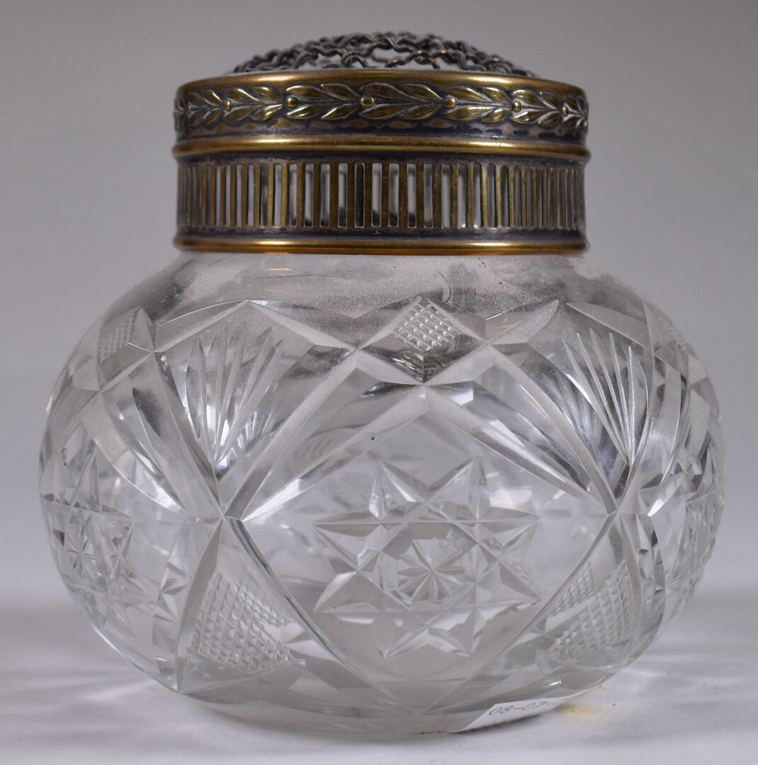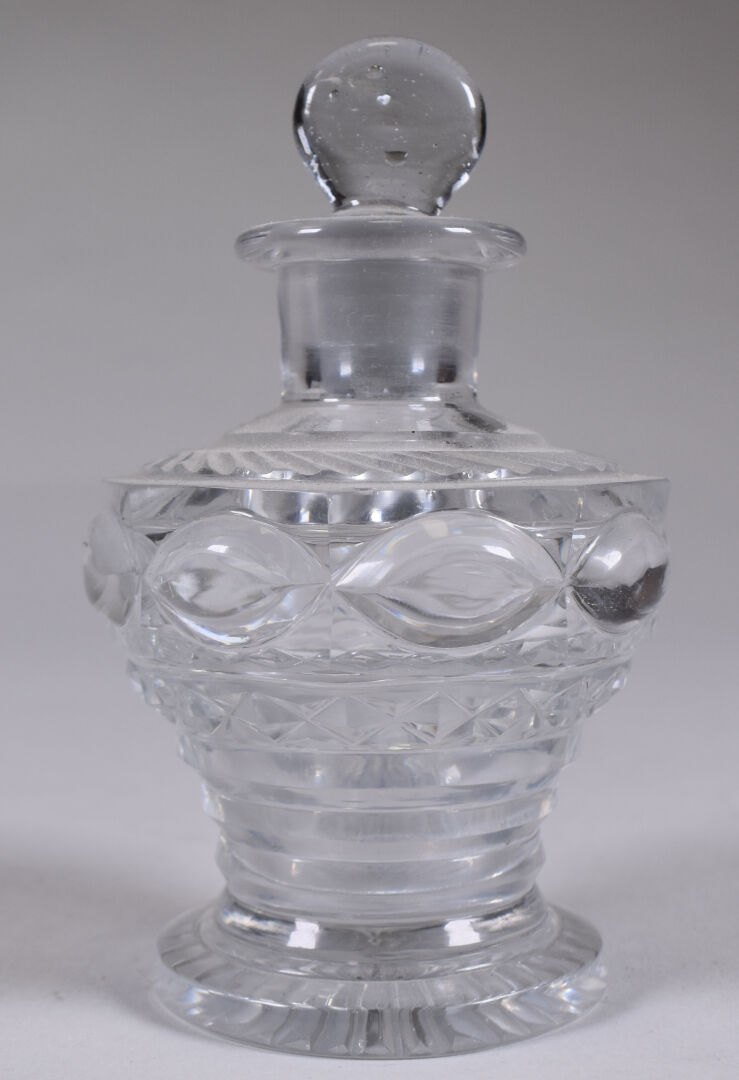 Ensemble en cristal moulé et taillé soit une coupe tripode, un sucrier, un flacon, une bouquetière et un saladier (égrenures). Dim. de la coupe. Haut. : 10,5 cm – Larg. : 31 cm.