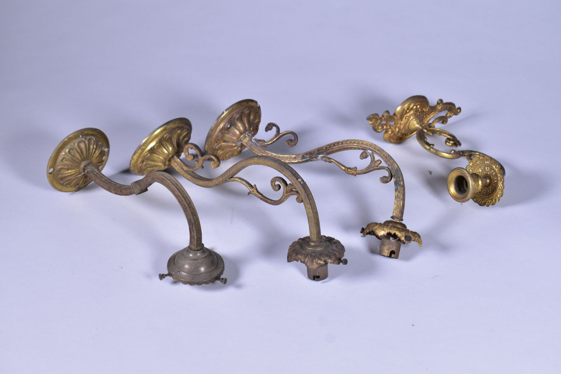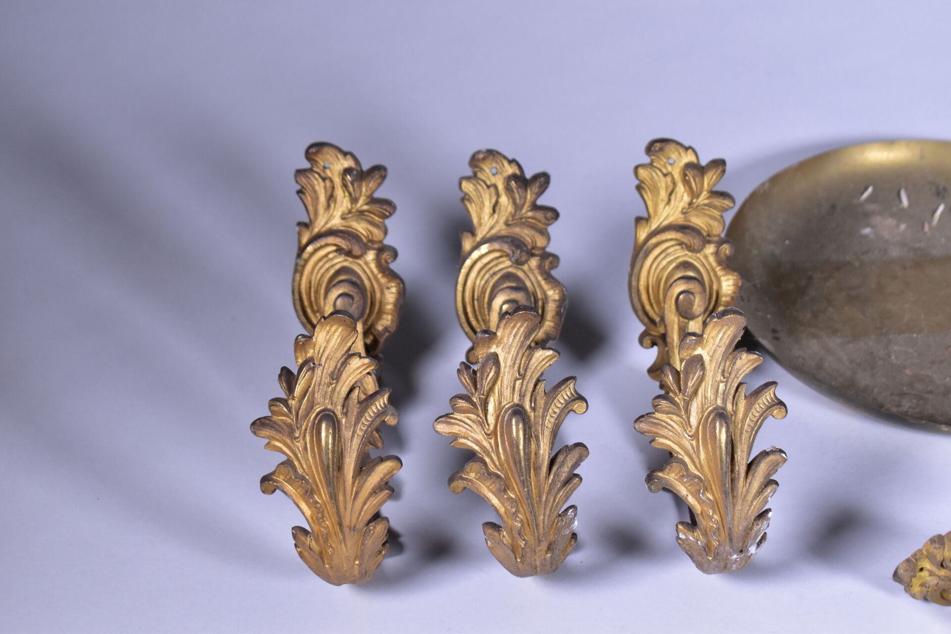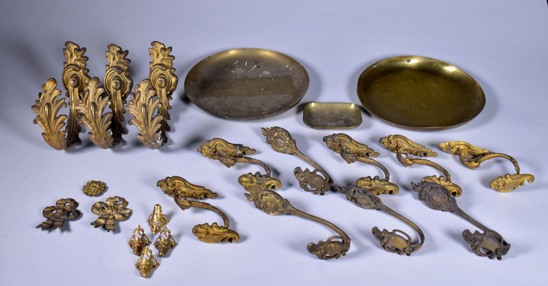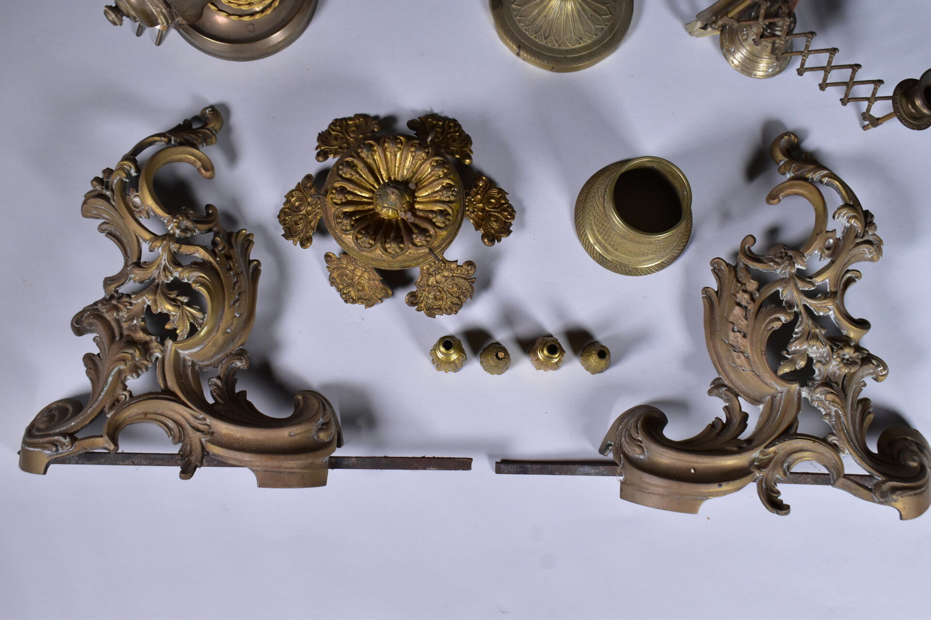 Ensemble en cuivre, laiton et bronze doré dont lampe de bureau, éléments de chenets, appliques, plateaux de balance, attaches pour embrases PCCF et divers. 1 caisse.