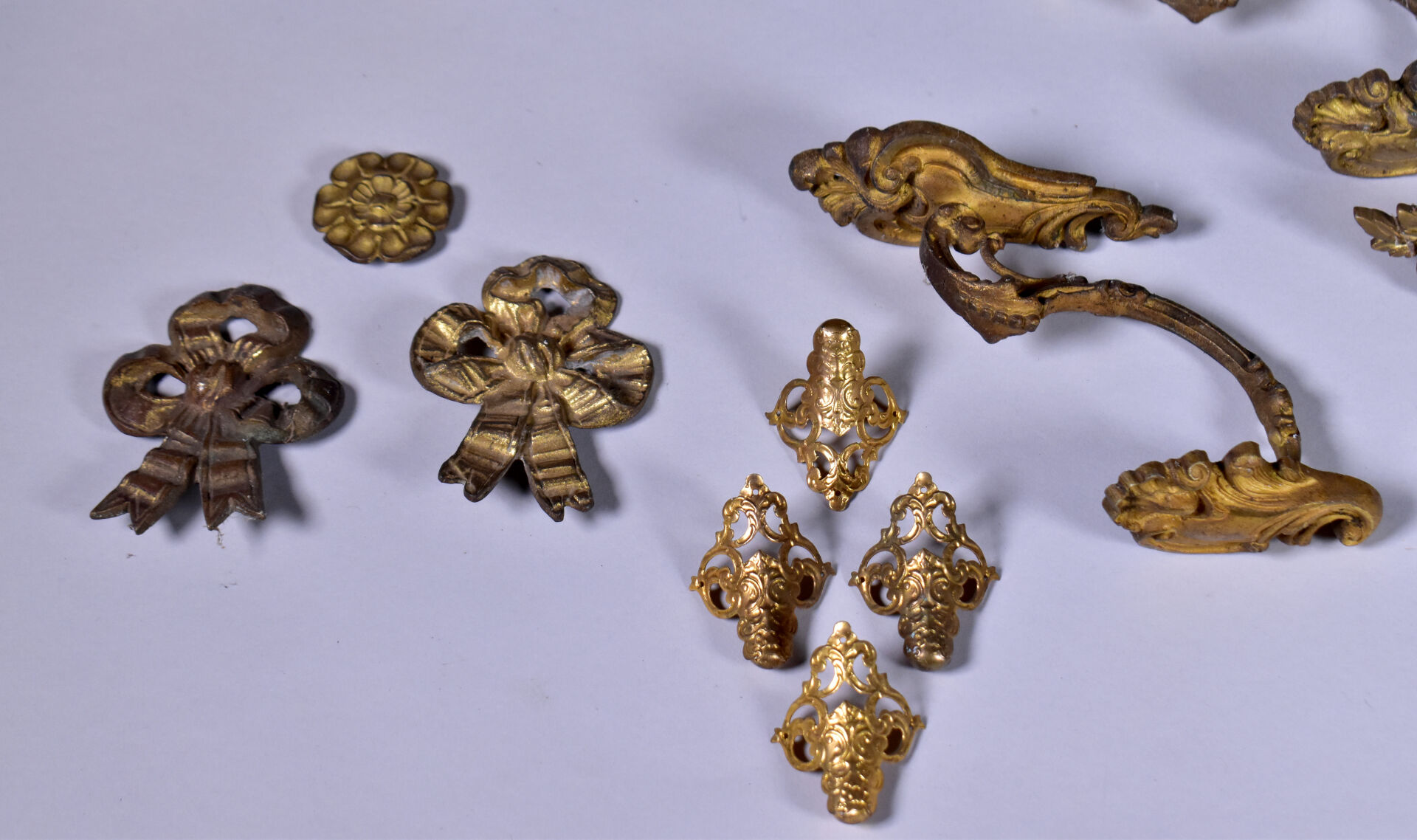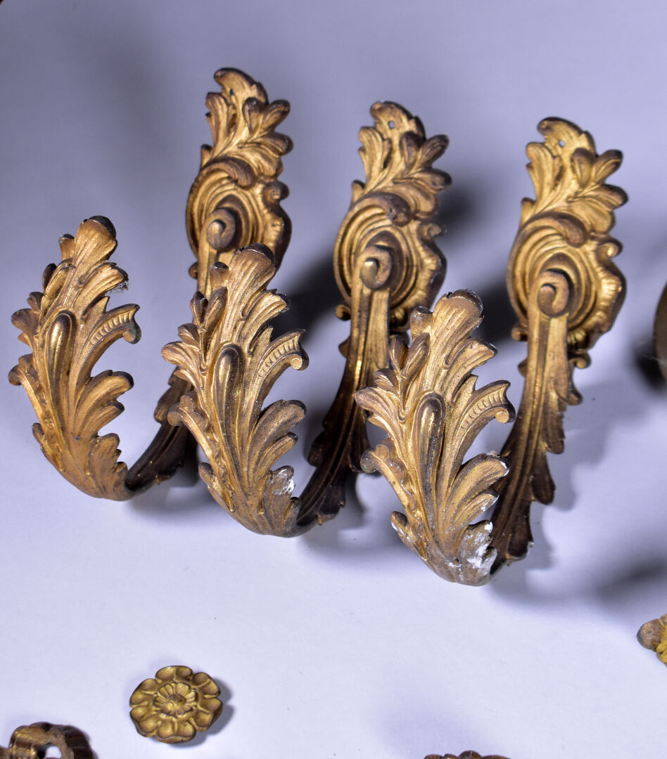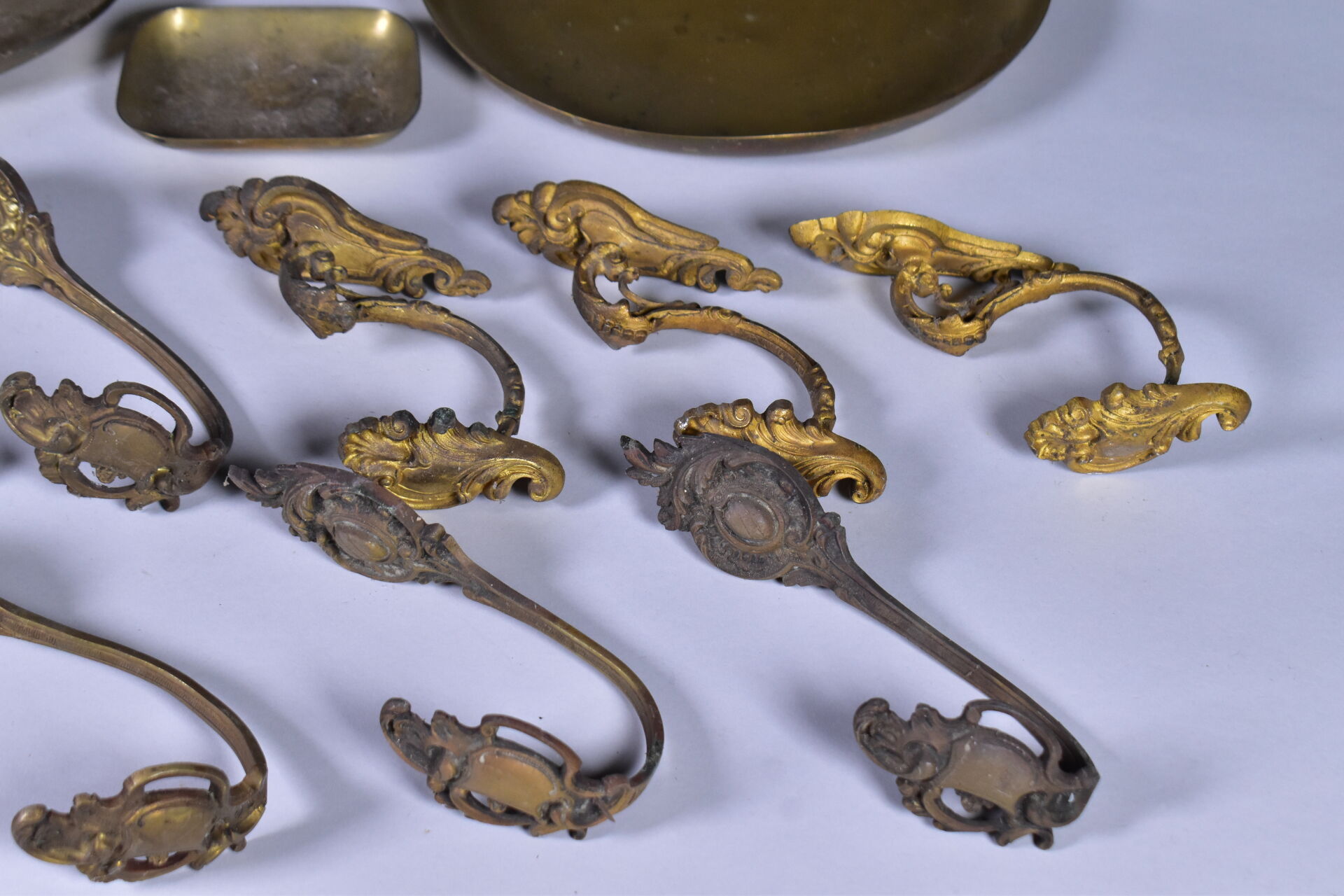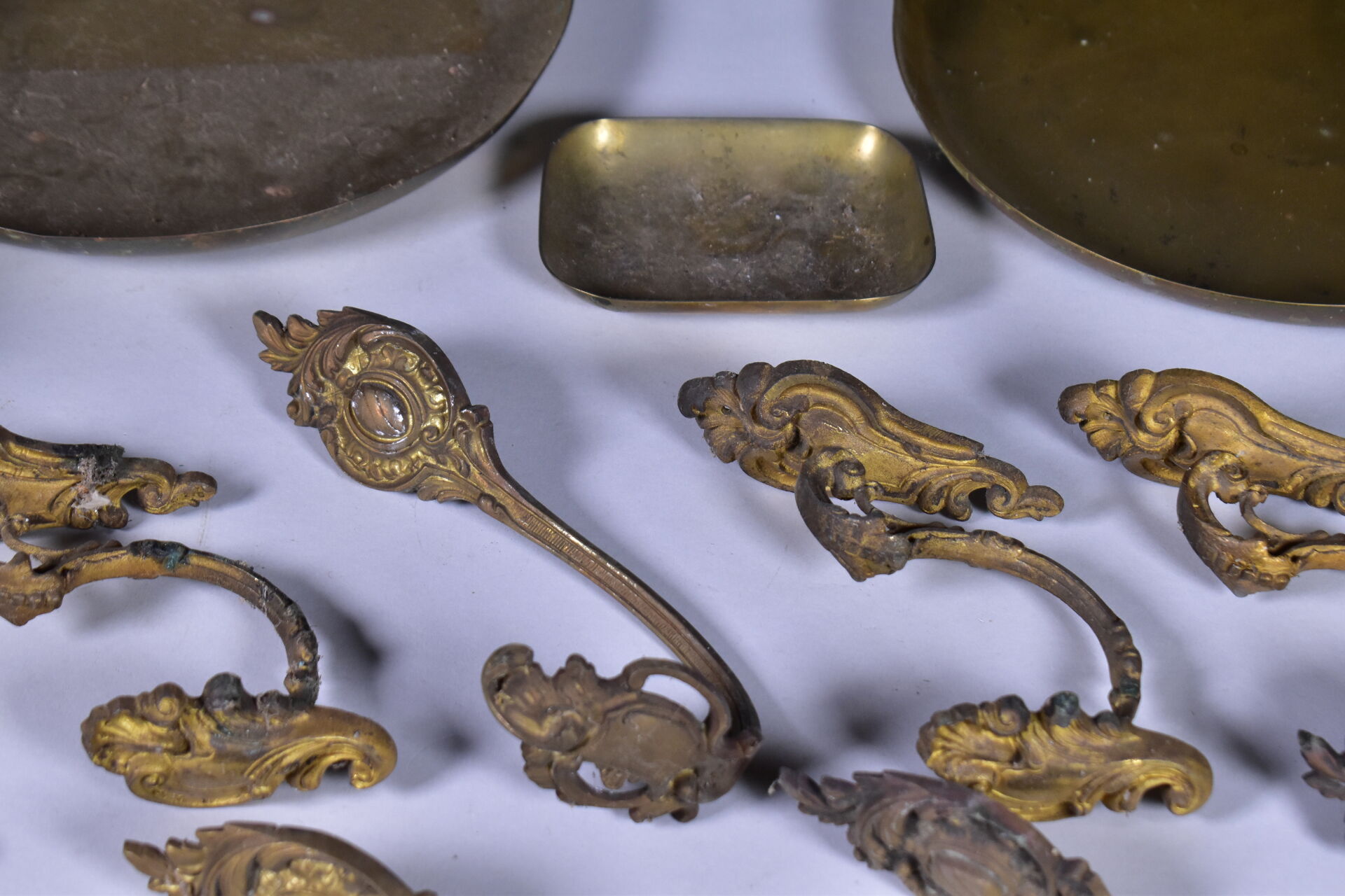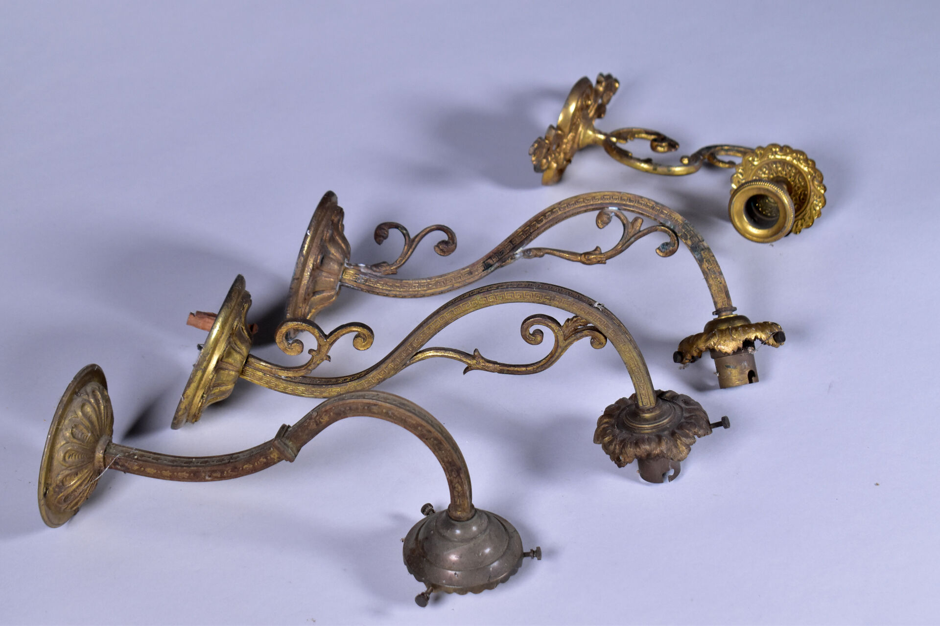 Ensemble en cuivre, laiton et bronze doré dont lampe de bureau, éléments de chenets, appliques, plateaux de balance, attaches pour embrases PCCF et divers. 1 caisse.