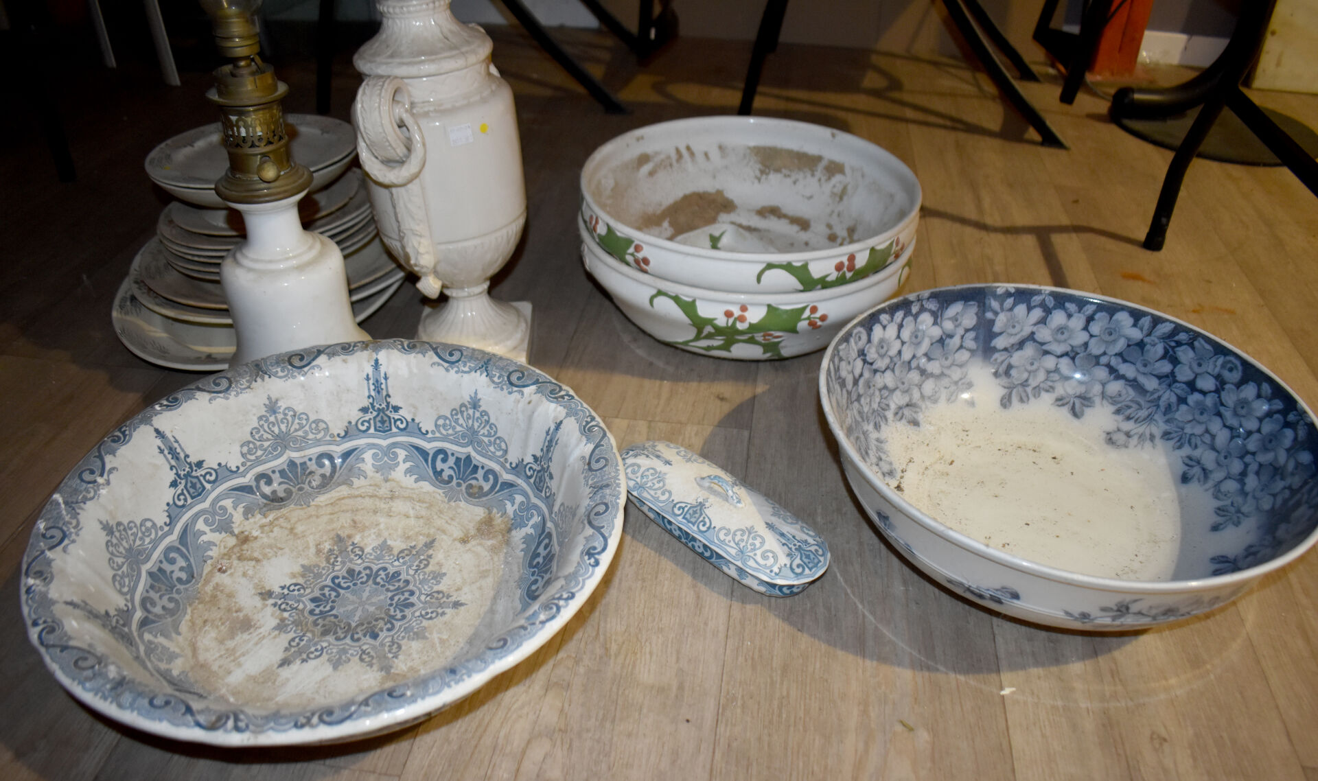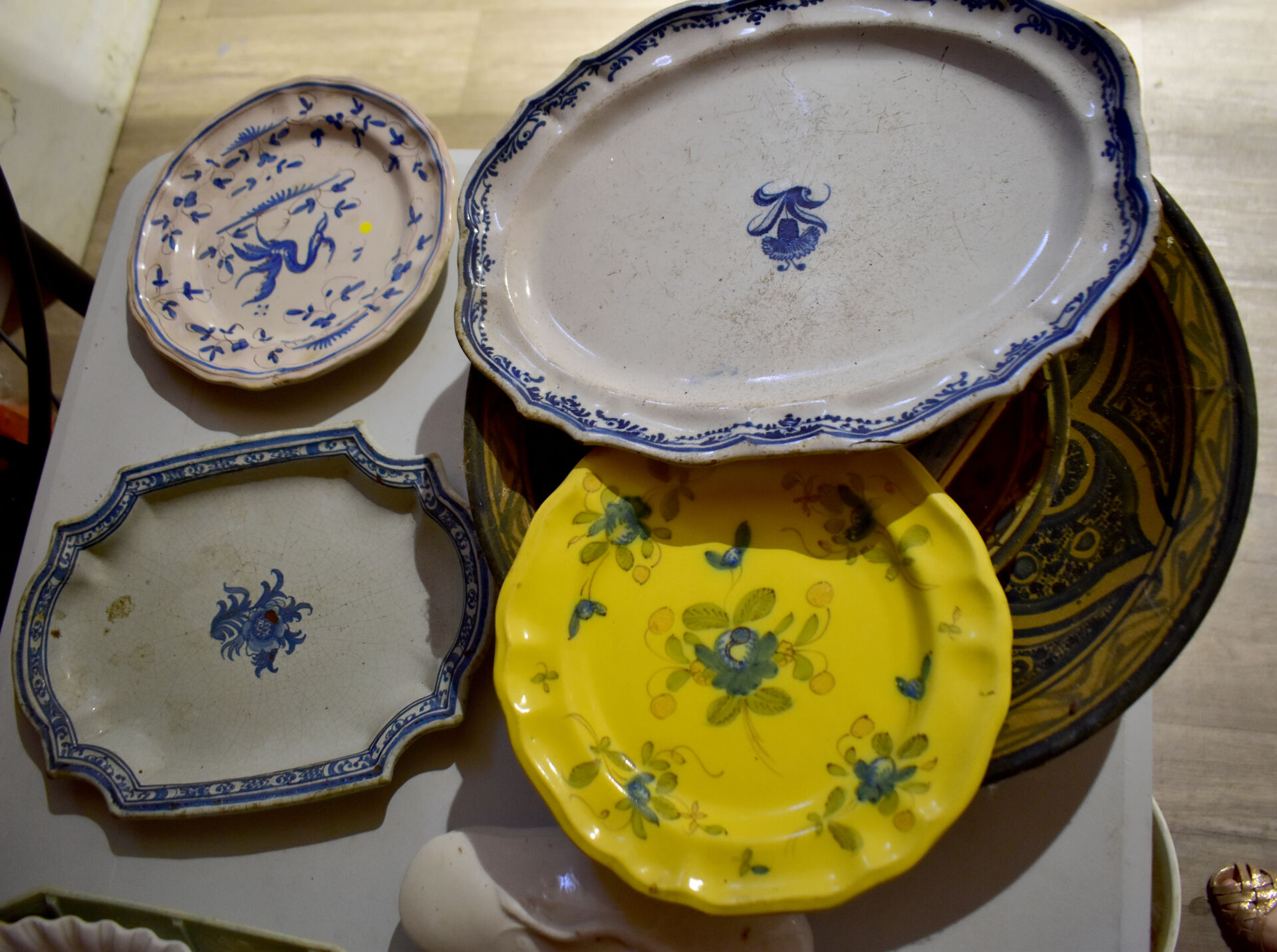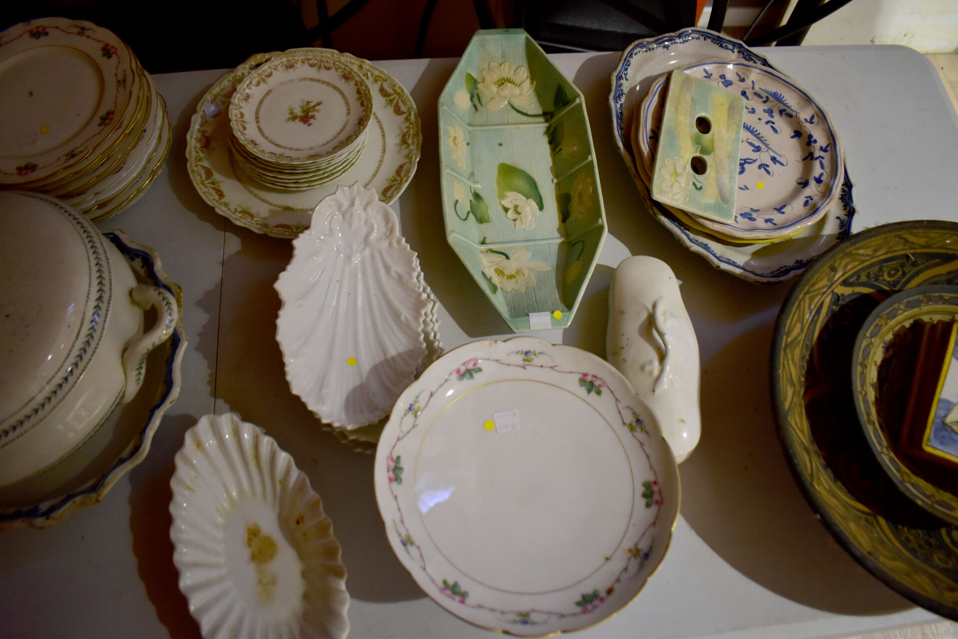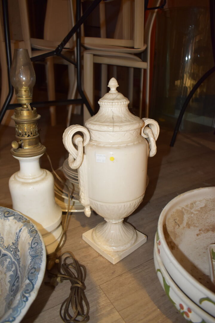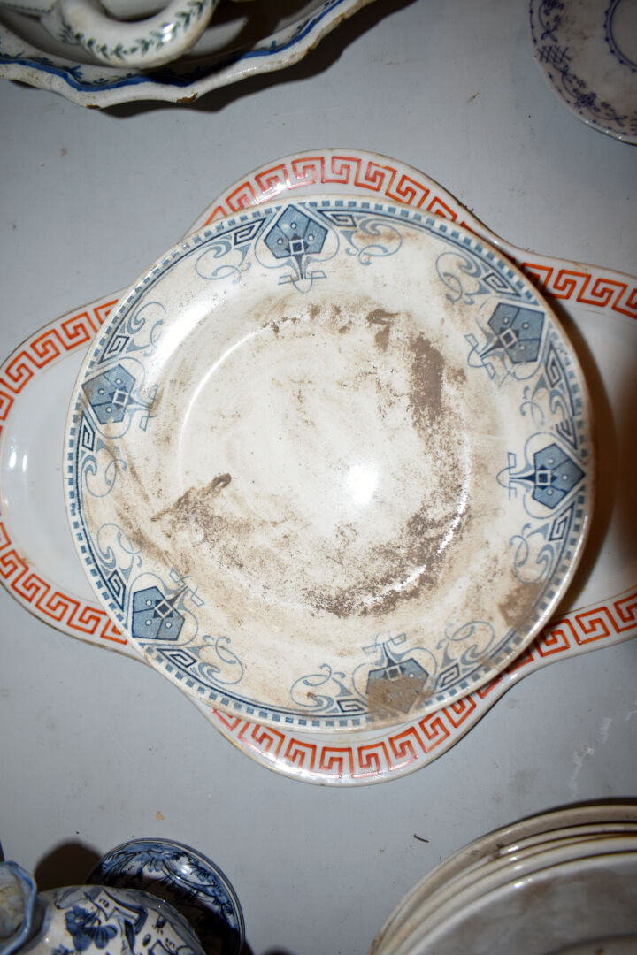 Ensemble en faïence et porcelaine dont bouquetière dans le goût de DELFT, compotier, plat en faïence, assiettes à huitres, assiettes à asperges, broc et bassin et divers… (usures, éclats).