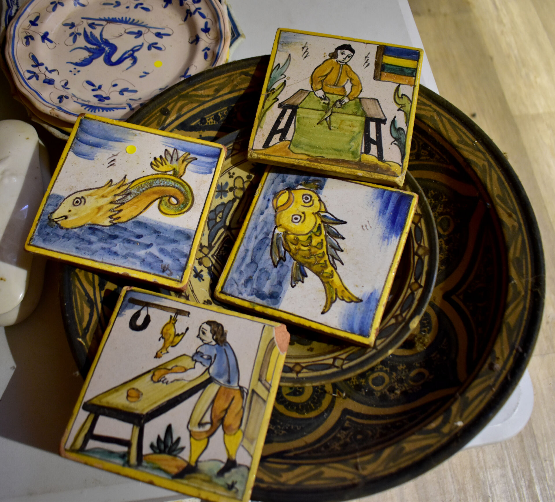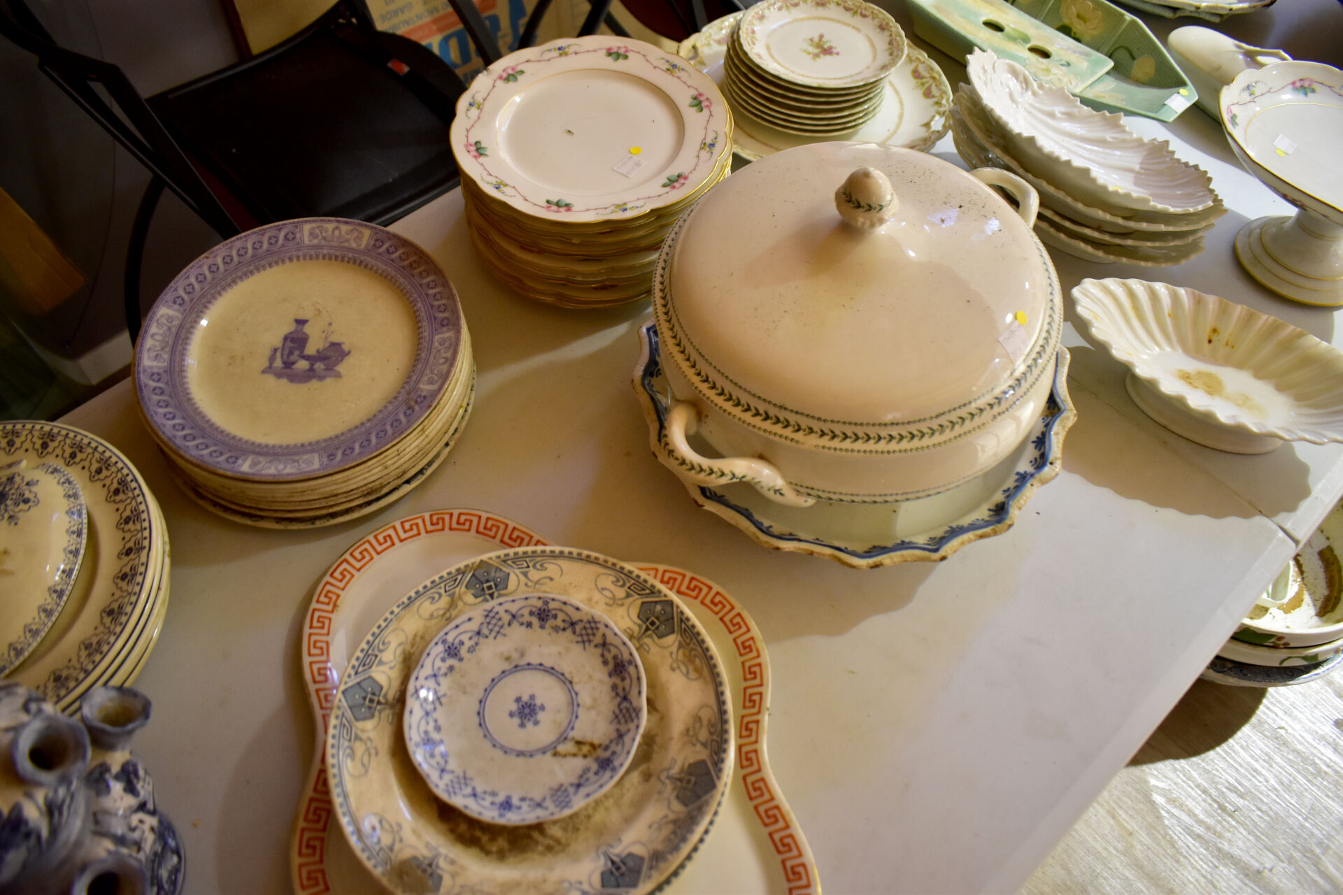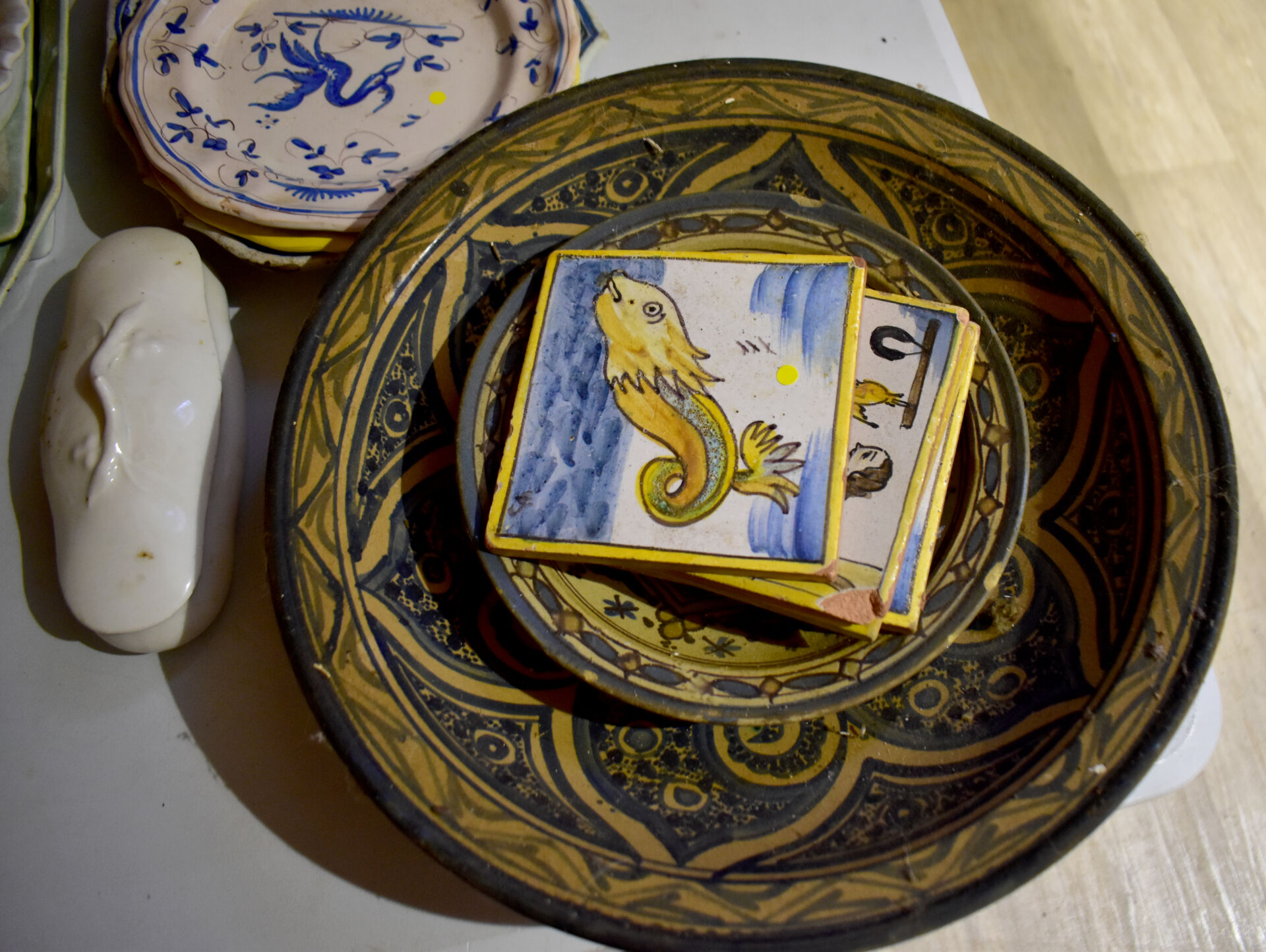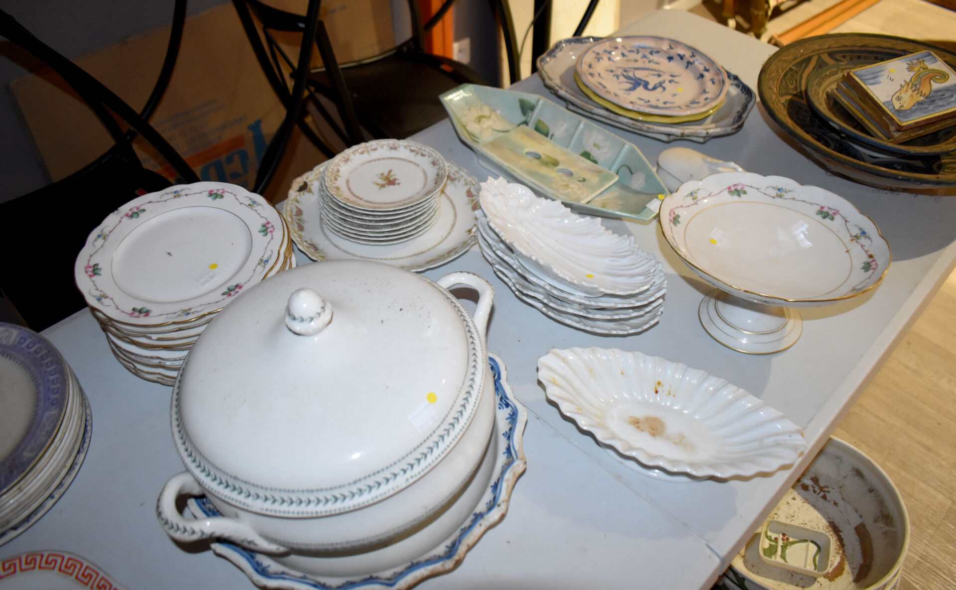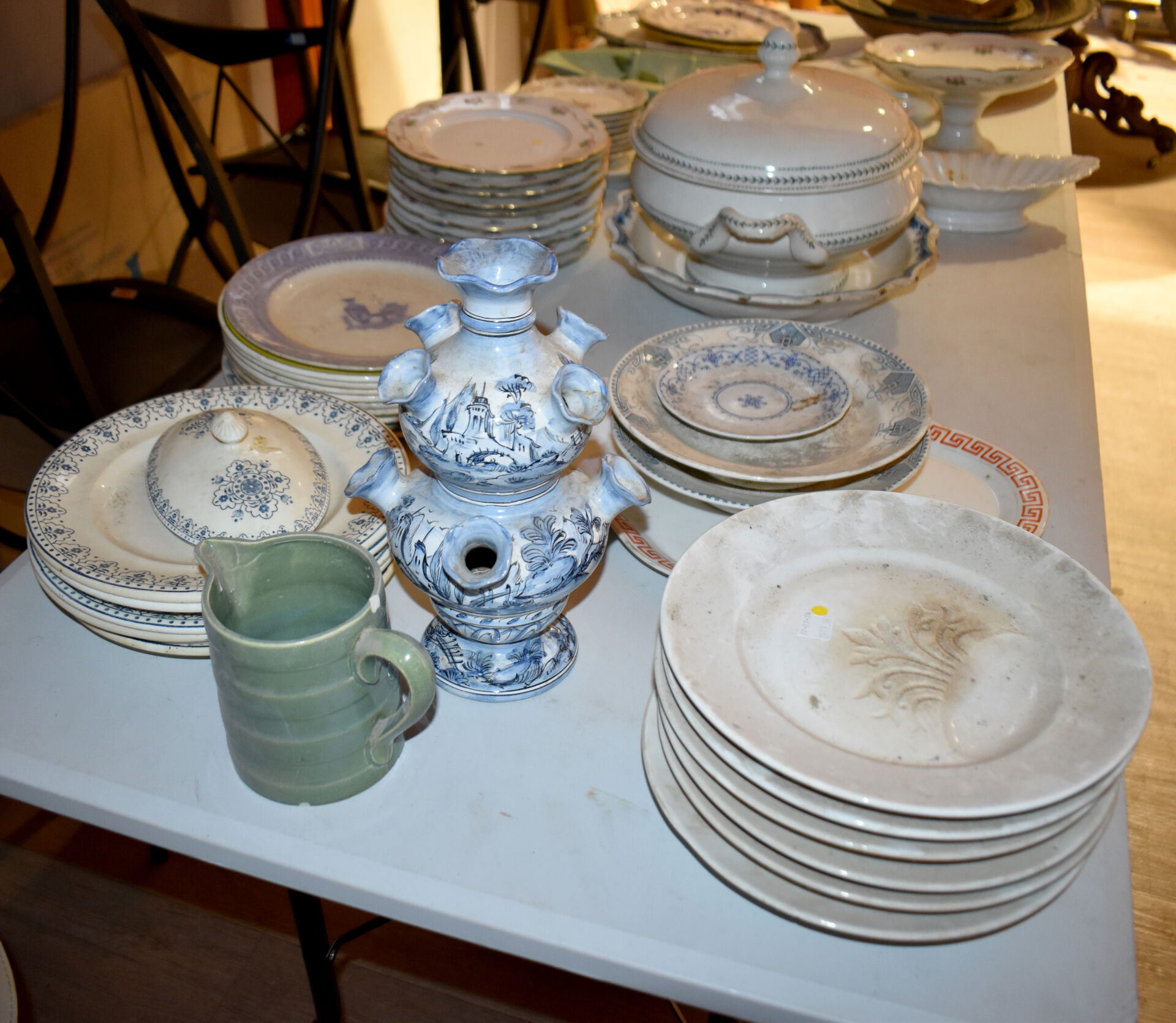 Ensemble en faïence et porcelaine dont bouquetière dans le goût de DELFT, compotier, plat en faïence, assiettes à huitres, assiettes à asperges, broc et bassin et divers… (usures, éclats).