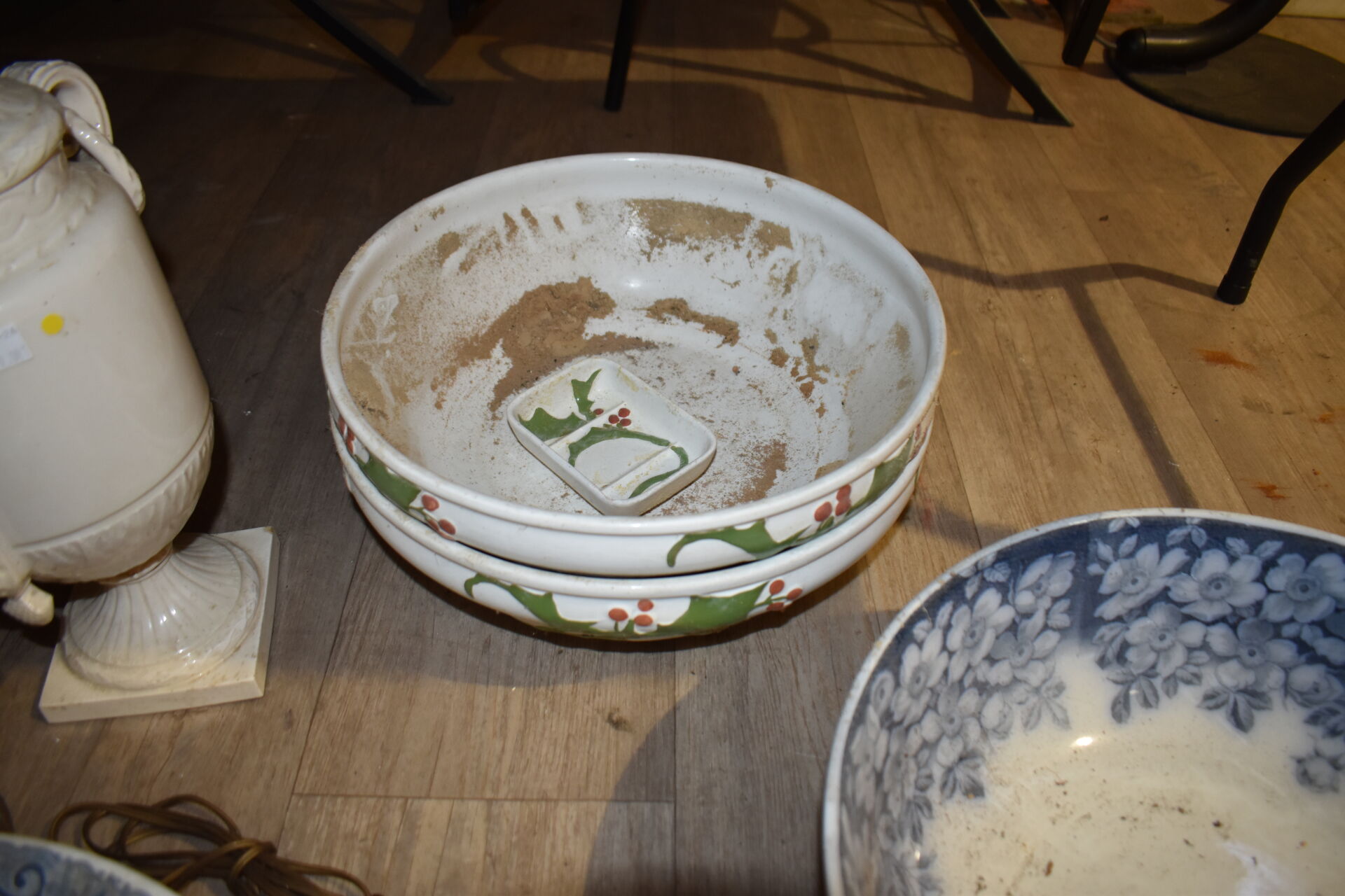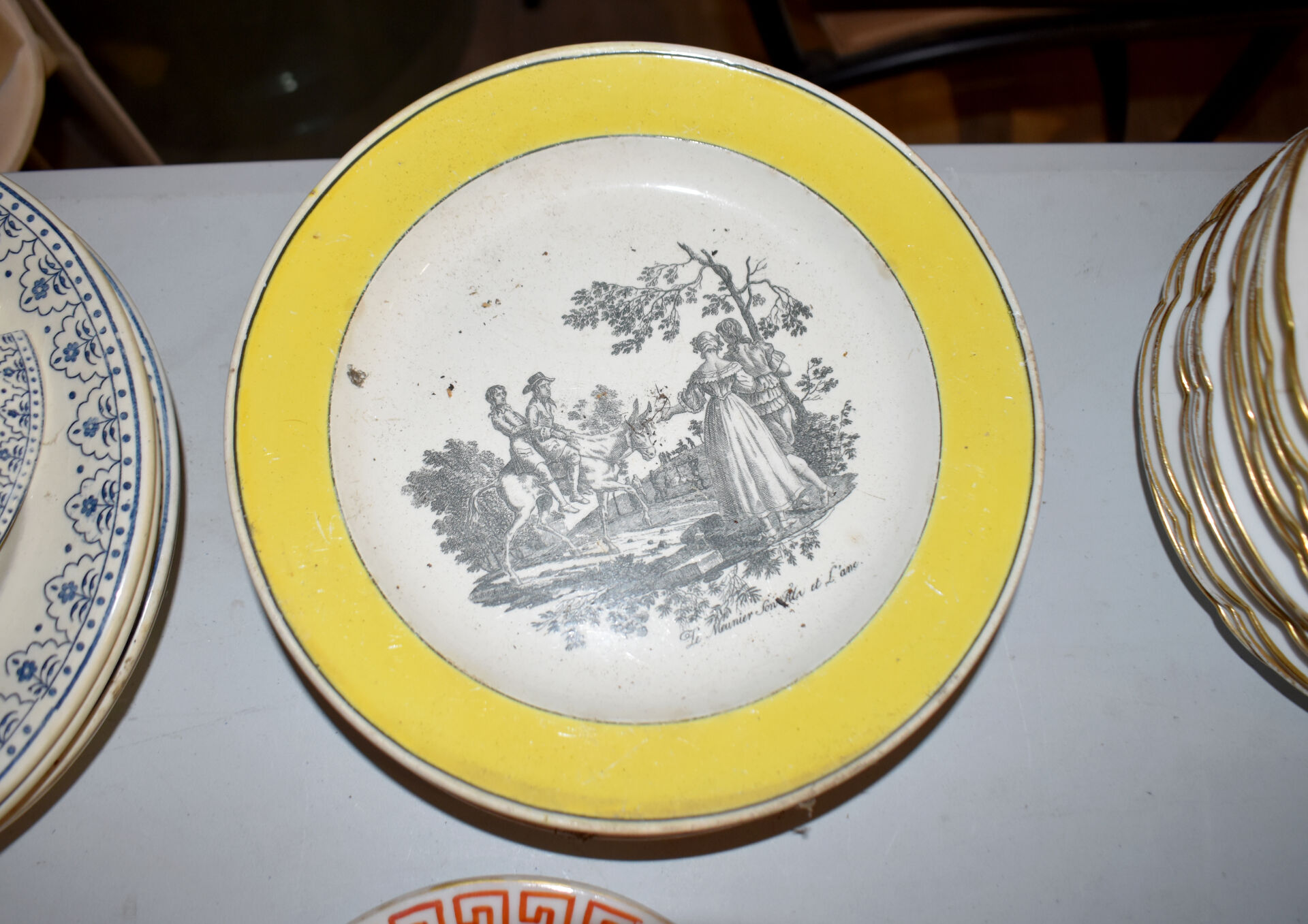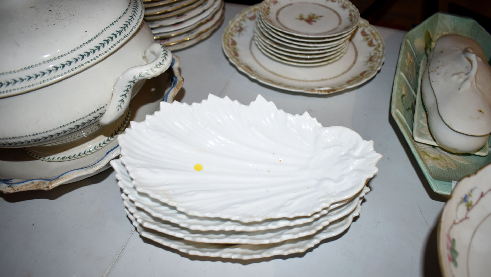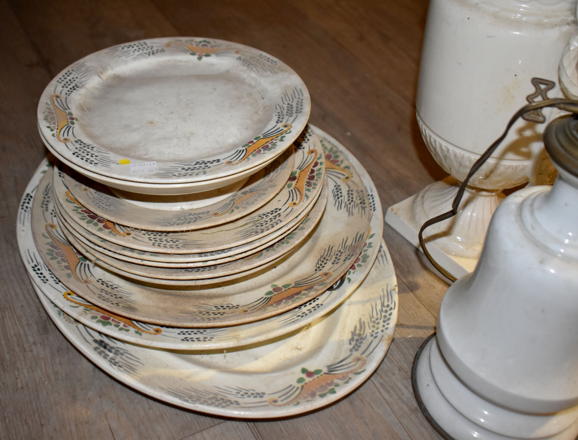 Ensemble en faïence et porcelaine dont bouquetière dans le goût de DELFT, compotier, plat en faïence, assiettes à huitres, assiettes à asperges, broc et bassin et divers… (usures, éclats).