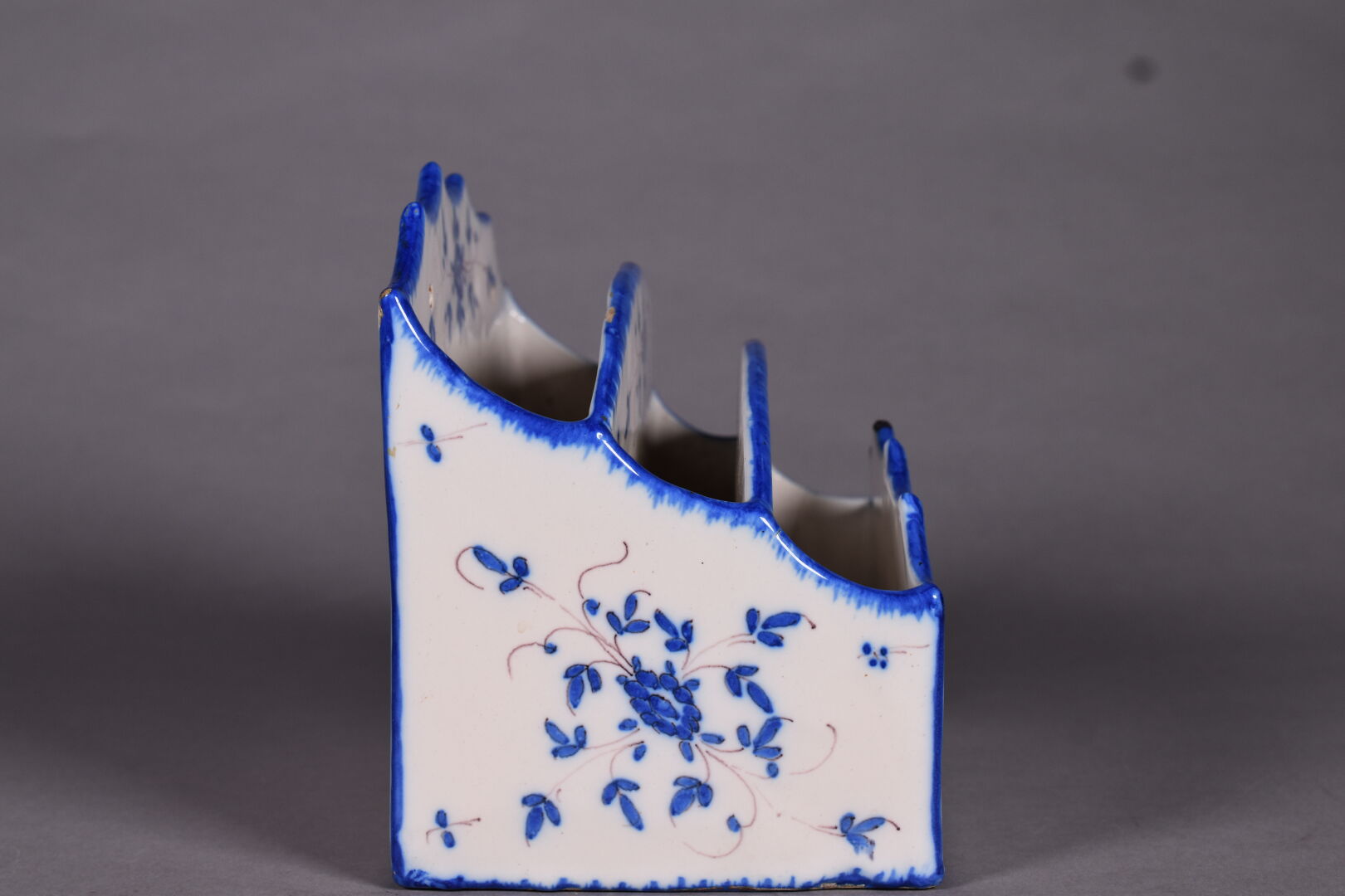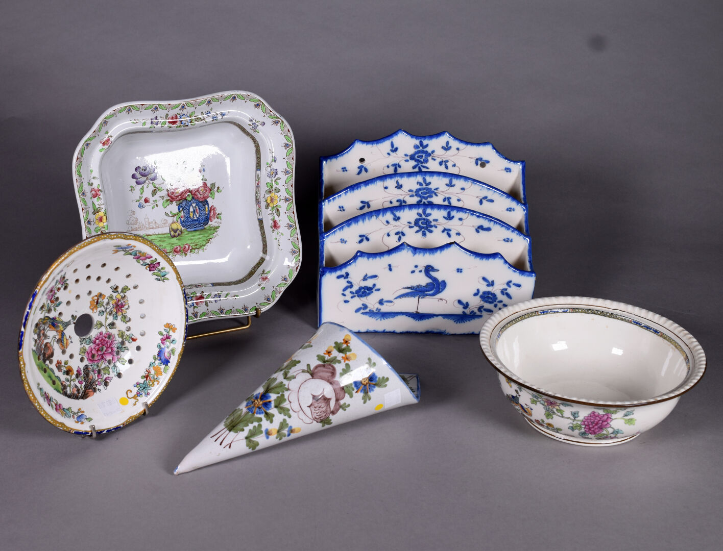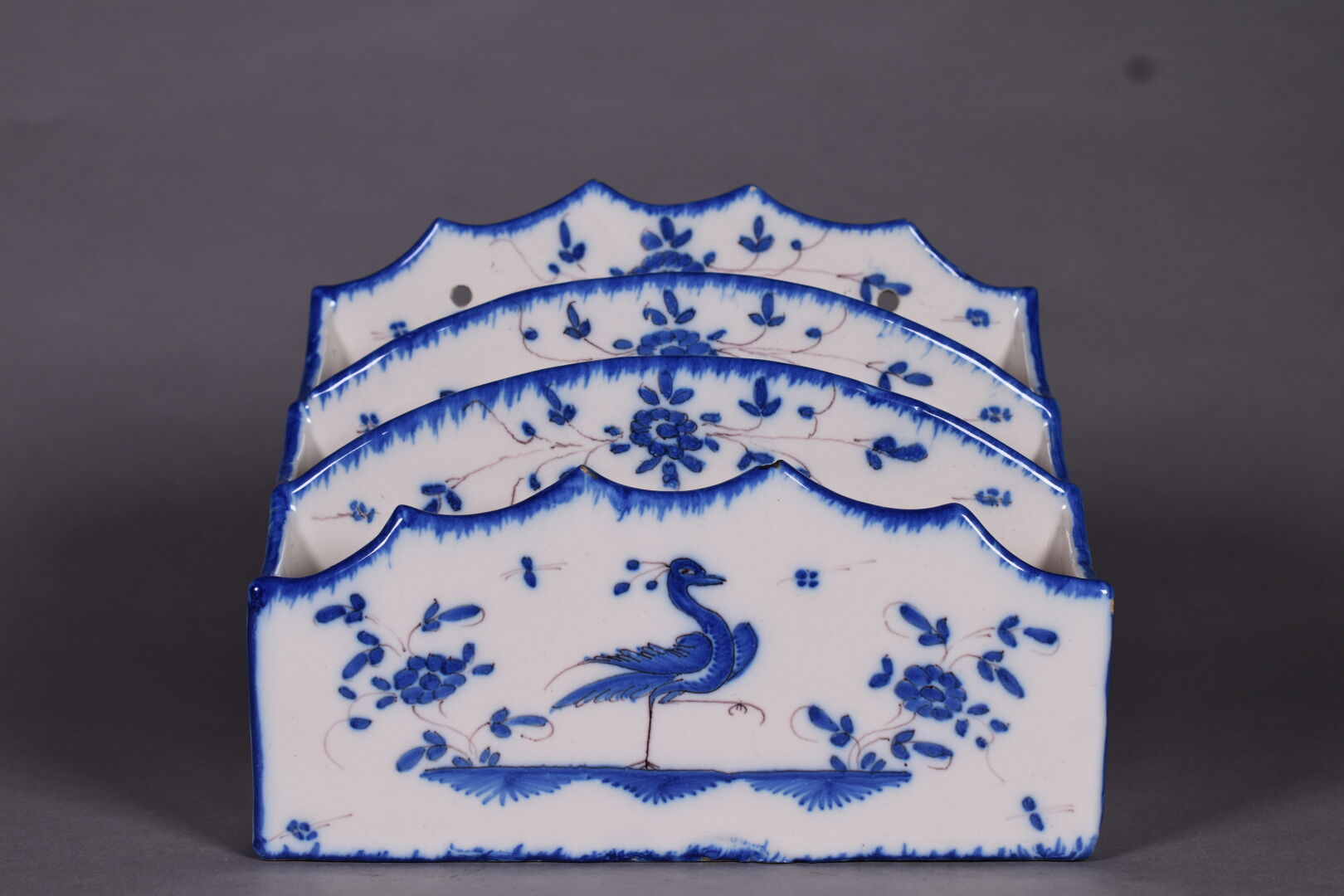 Ensemble en faïence soit un cornet, un porte lettres, un porte savon, un petit plat octogonal.