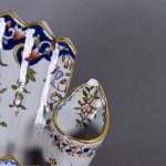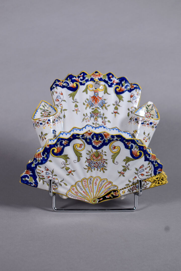 Ensemble en faïence soit un encrier en forme de coeur (petite restauration et un petit éclat) et une bouquetière à décor de fleurs (deux accidents restaurés). XXe siècle. Haut. bouquetière : 21 cm.