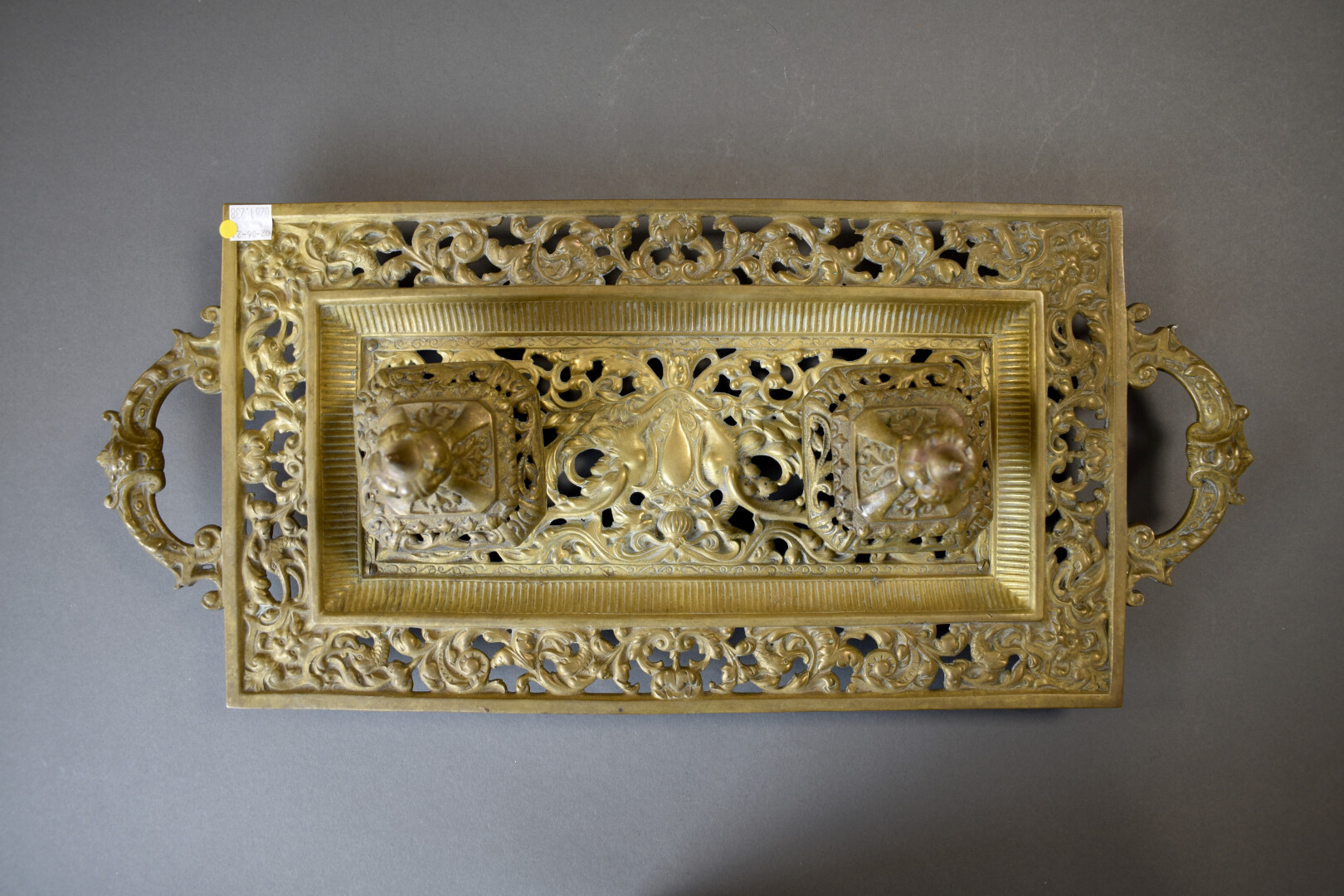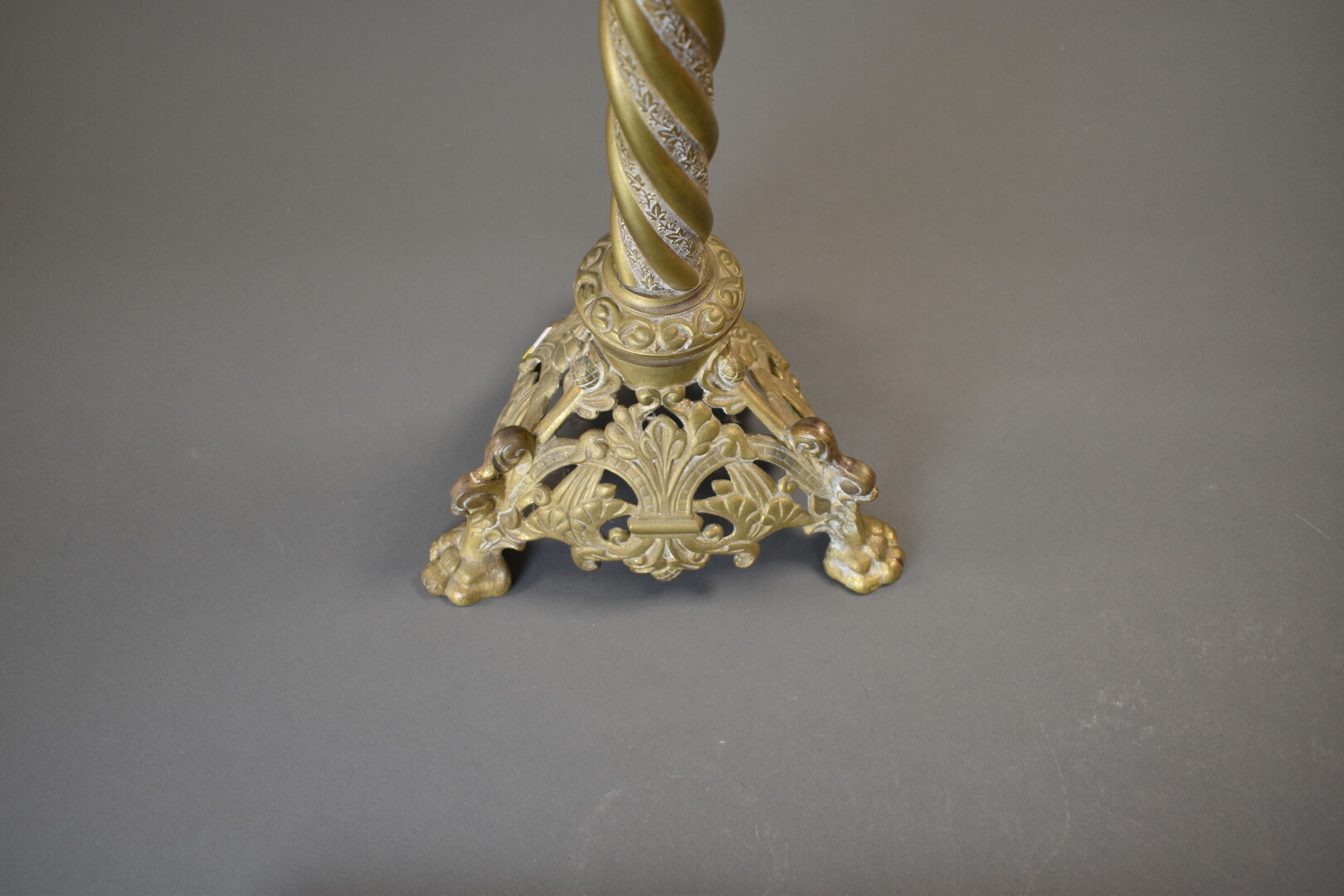 Ensemble en laiton ajouré d’acanthes soit un pique cierge à fût torsadé et un encrier à compartiments en porcelaine. Fin du XIXe ou début du XXe siècle. Haut. pique cierge. : 65,5 cm.