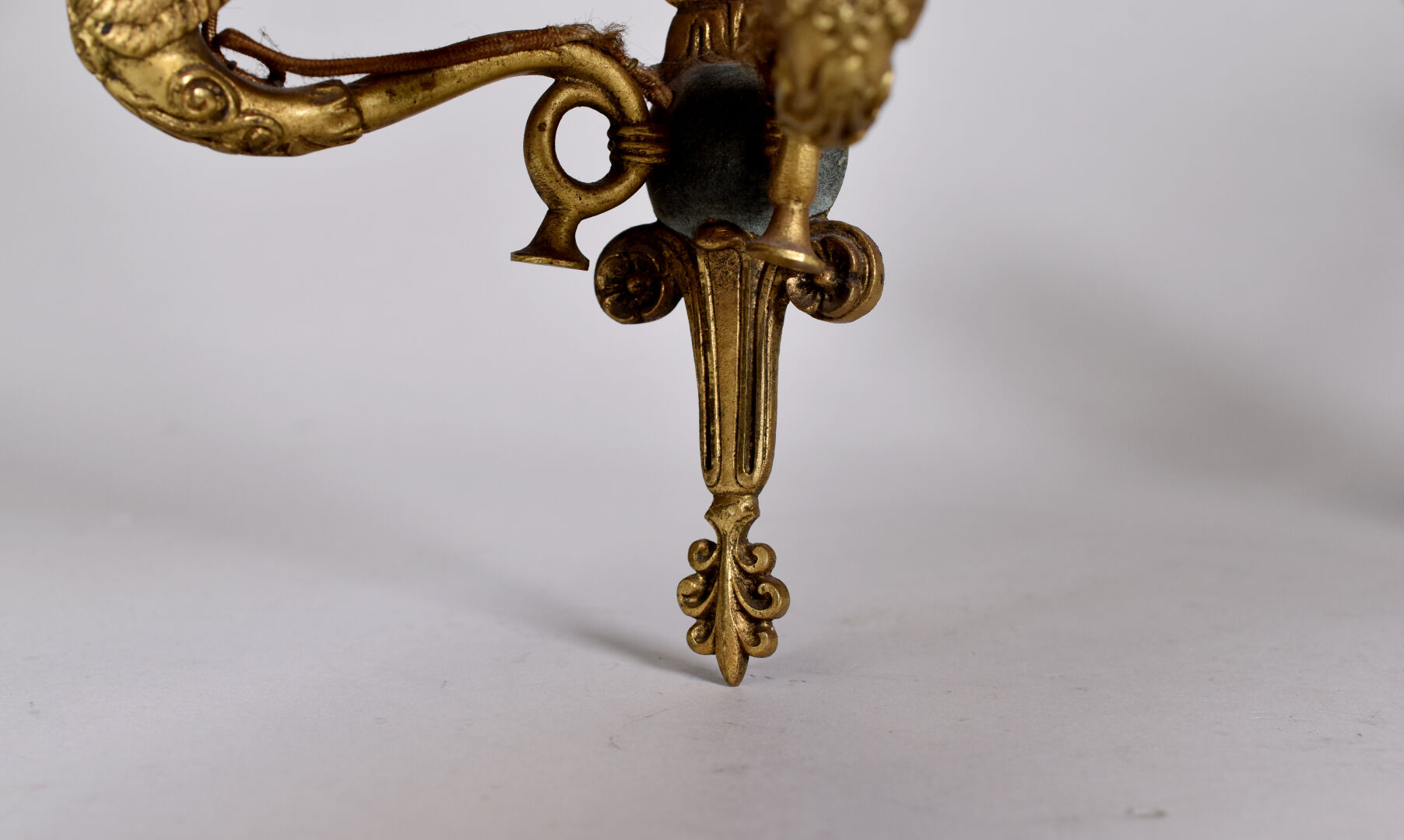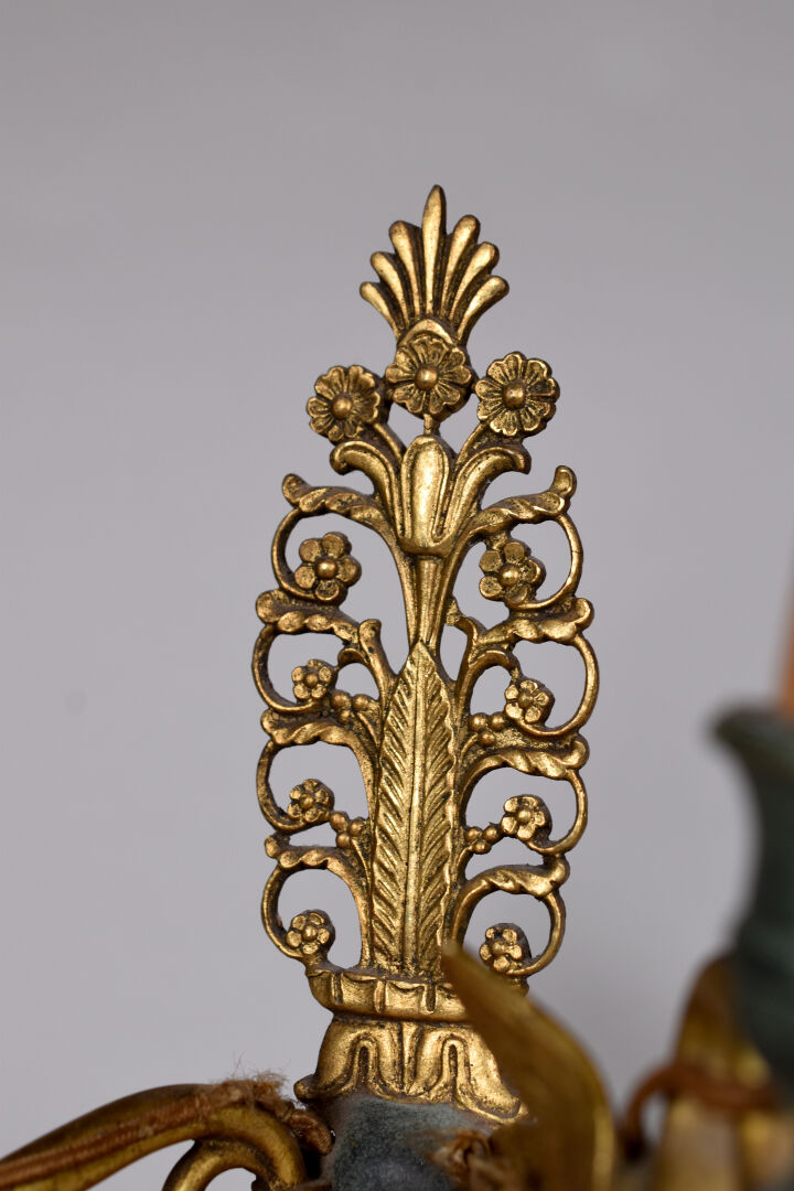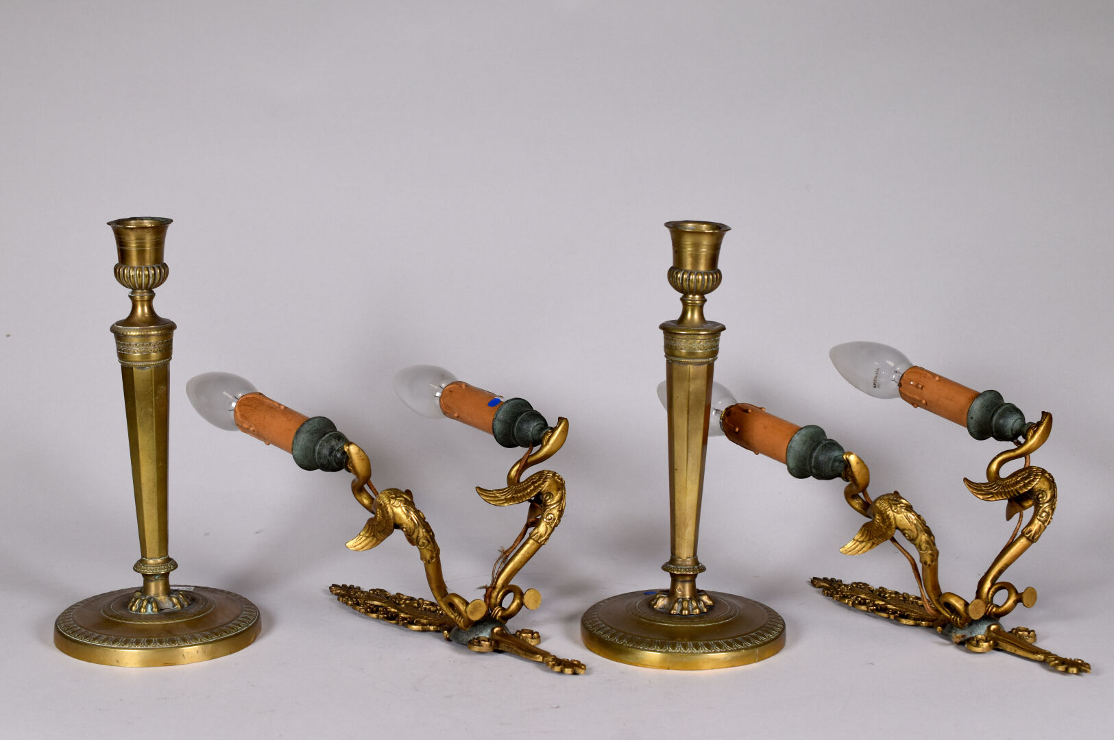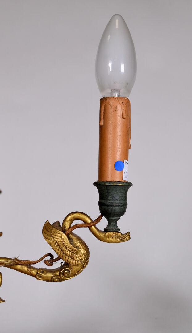 Ensemble en laiton et cuivre comprenant une paire de bougeoirs (fêles et manques) et une paire d’appliques à deux bras de lumière formés par des cygnes. Style Empire. Haut. des bougeoirs : 25,5 cm. Haut. des appliques : 33 cm. avec les douilles.
