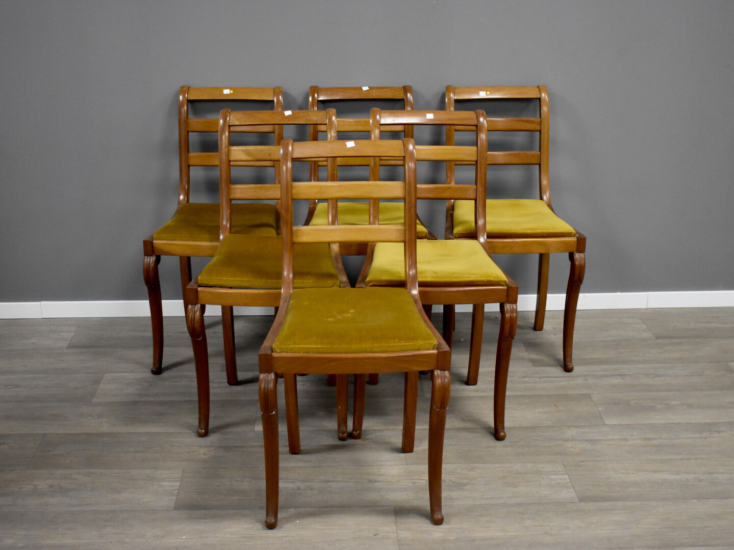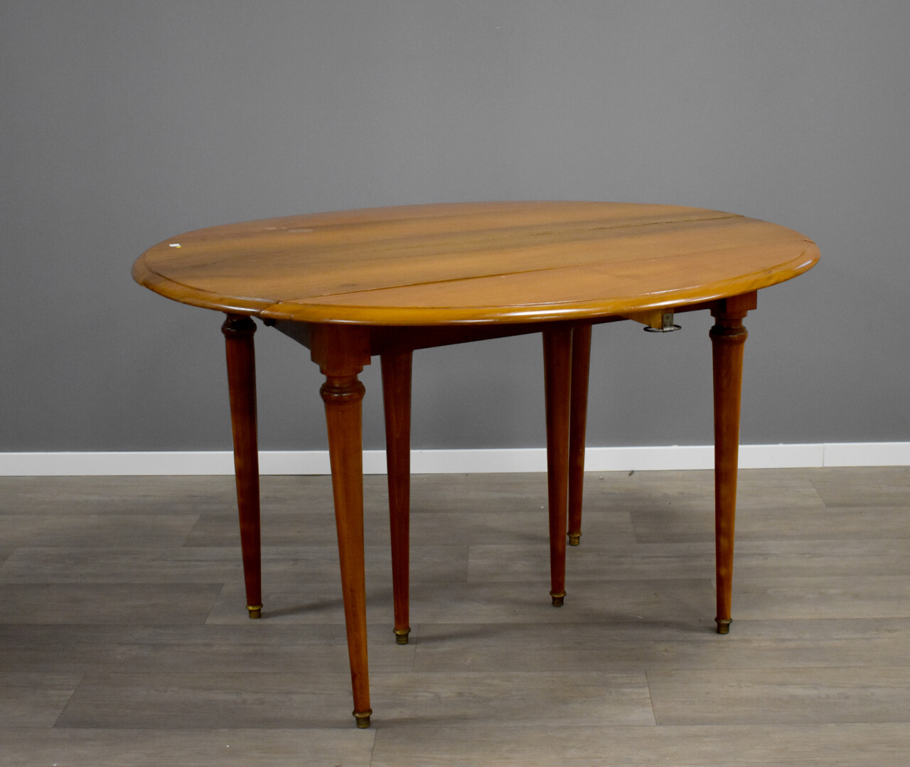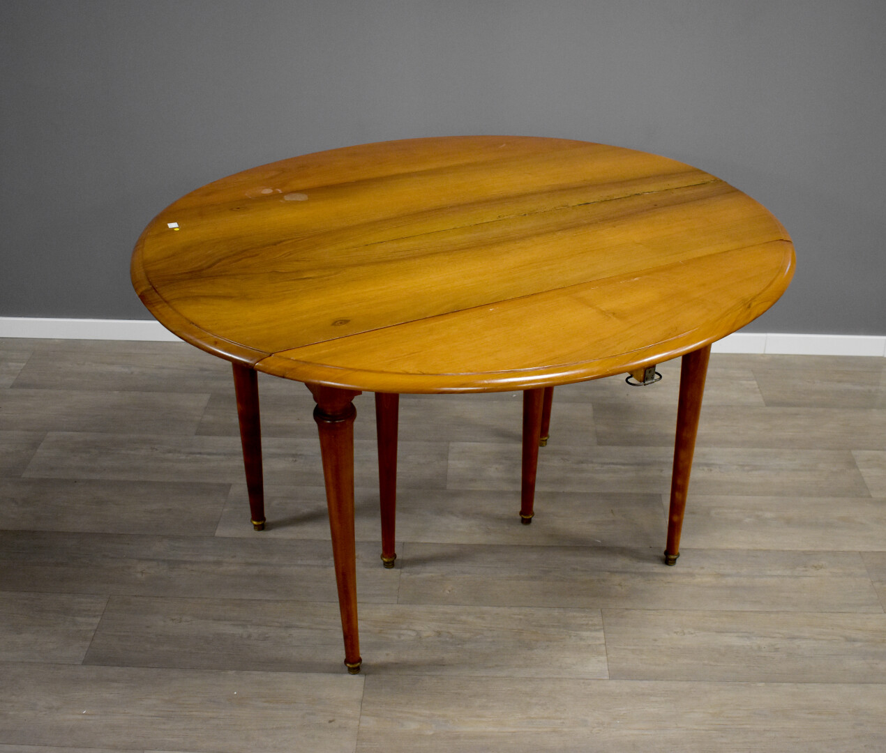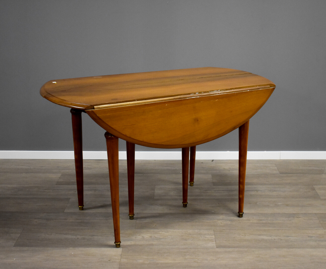 Ensemble en noyer et bois blond soit une table à volets et six chaises à dossiers renversés. Style Restauration, XXe siècle. Haut. Table : 75 cm – Plateau : 124 x 109,5 cm.