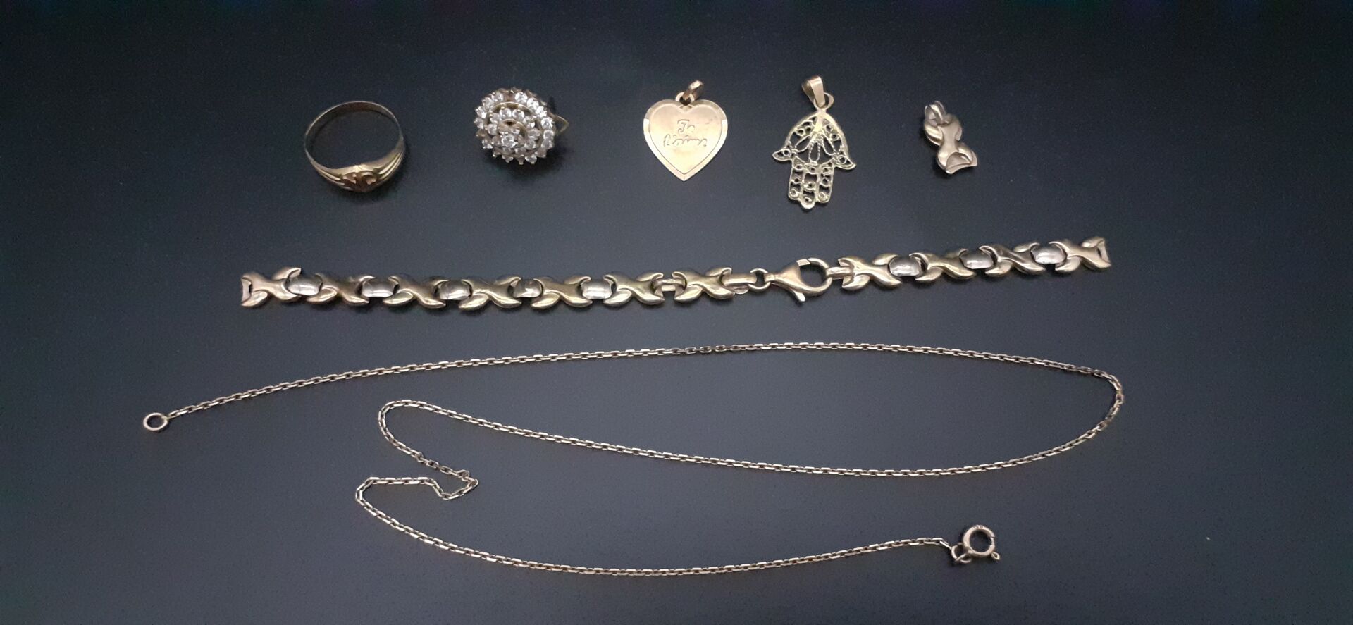 Ensemble en or jaune 18k 750/1000e comprenant une bague monogrammée NC tdd 49, une boucle d’oreilles ornée de pierres blanches (châtons vides), un bracelet souple cassé, une chaine à maille forçat long.env. 45,5cm, un pendentif-main et un pendentif-coeur gravé « je t’aime. ». Poids brut total = 18,10g.