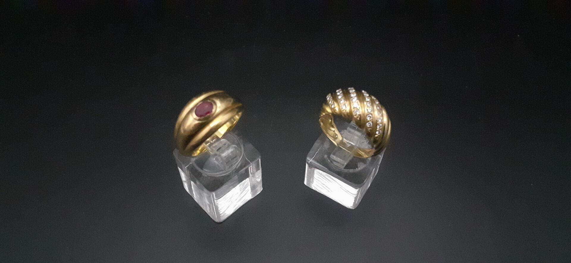 Ensemble en or jaune 18k 750/1000e comprenant une bague sertie de 5 lignes de diamants d’env. 0,02 carat chacun tdd 56 et une bague sertie d’une pierre rouge (usures) tdd 56. Poids brut total = 19,05g.