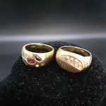 Ensemble en or jaune 18k 750/1000e comprenant une bague tank pavée de diamants d’env. 0,02 carat chacun (tdd 51) et une bague jonc sertie de 2rubis, 2 saphirs et 1 diamants d’env. 0,02 carat (tdd 49). Poids brut total = 12,90g.
