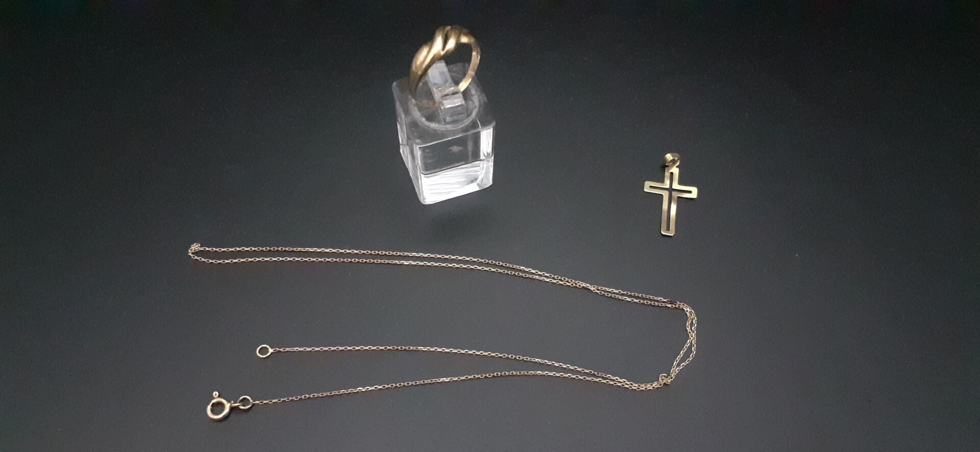 Ensemble en or jaune 18k 750/1000e comprenant une bague tdd 52, une chaine à maille forçat long.env. 49,5cm. Poids total or 18k 750/1000e : 4,20g. On y joint une croix en pendentif en or jaune 14k 585/1000e 0,50g. Poids total = 4,70g.