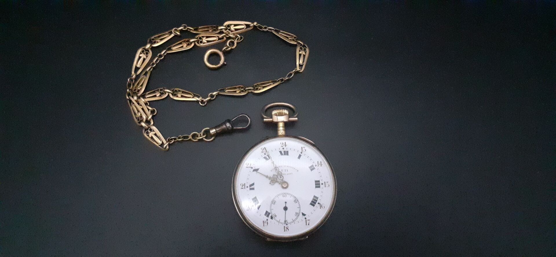 Ensemble en or jaune 18k 750/1000e comprenant une montre de gousset circulaire, remontoir et cache-poussière en or 18k 750/1000e, cadran à fond blanc, index chiffres romain noirs et chiffres arabes rouges, guichet trotteuse à 6H, mention « diplôme d’honneur – UTI – milan 1906 », diamètre env. 43mm (poids brut de la montre : 57,15g) et une giletière à maille filigranée long.env. 39cm. Poids brut total = 71,45g.