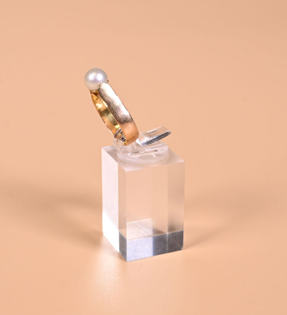 Ensemble en or jaune 18K 750/1000e et perles de culture soit un collier (manquent des perles), une paire de pendants d’oreille (à charge : le lot sera poinçonné avant la vente.), un pendentif et une bague. Poids brut : 32,57 g.