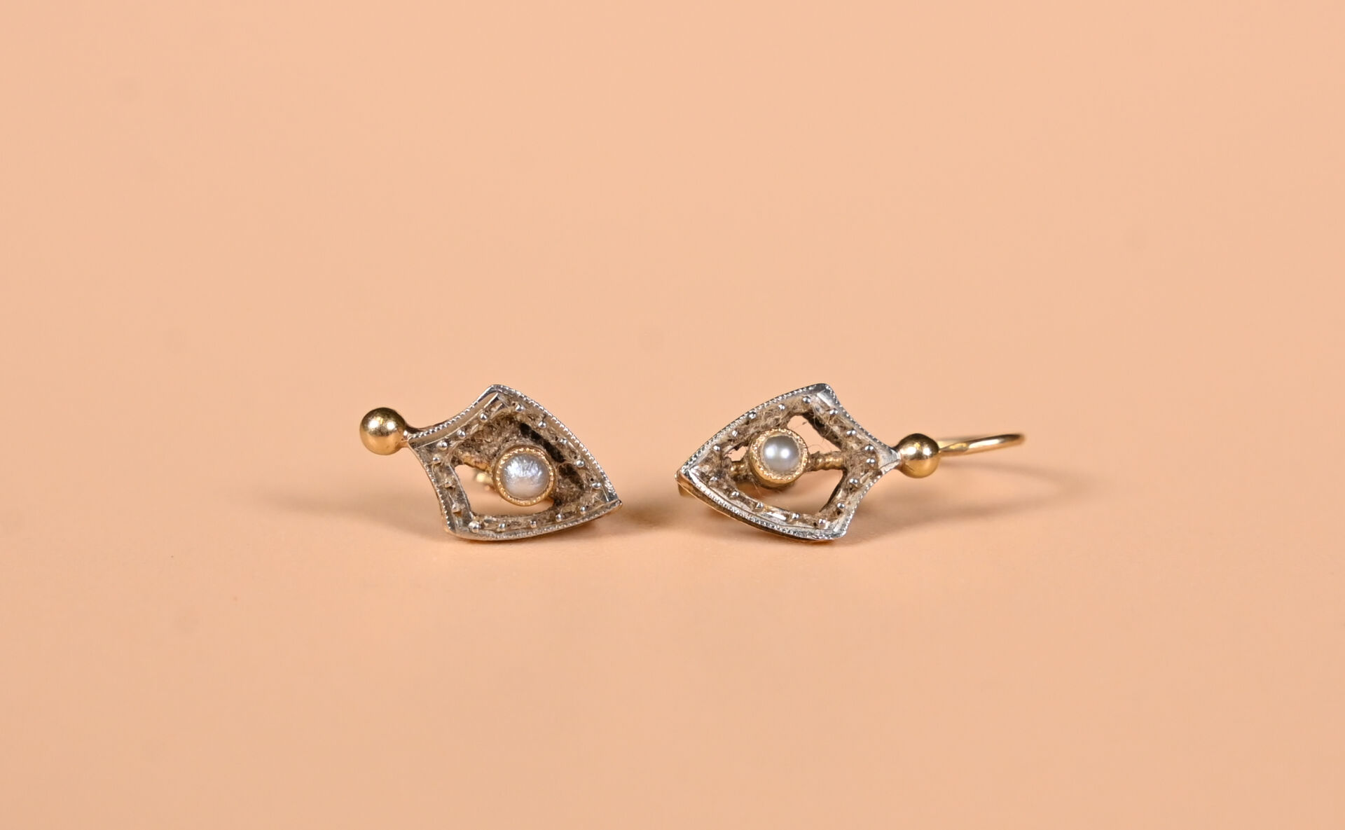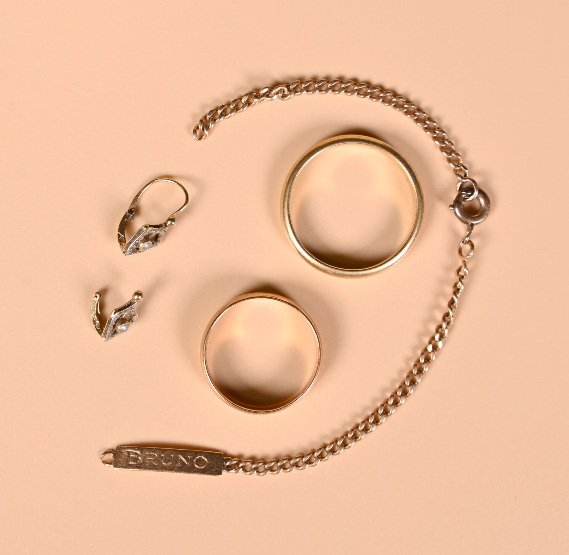 Ensemble en or jaune 18K 750/1000e soit deux anneaux, un bracelet accidenté et deux débris de dormeuses à semences de perles. Poids total brut. : 10,25 g.