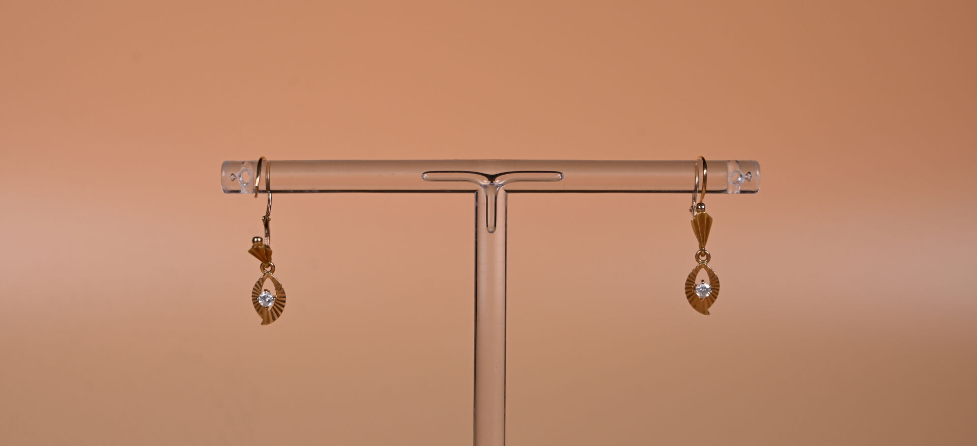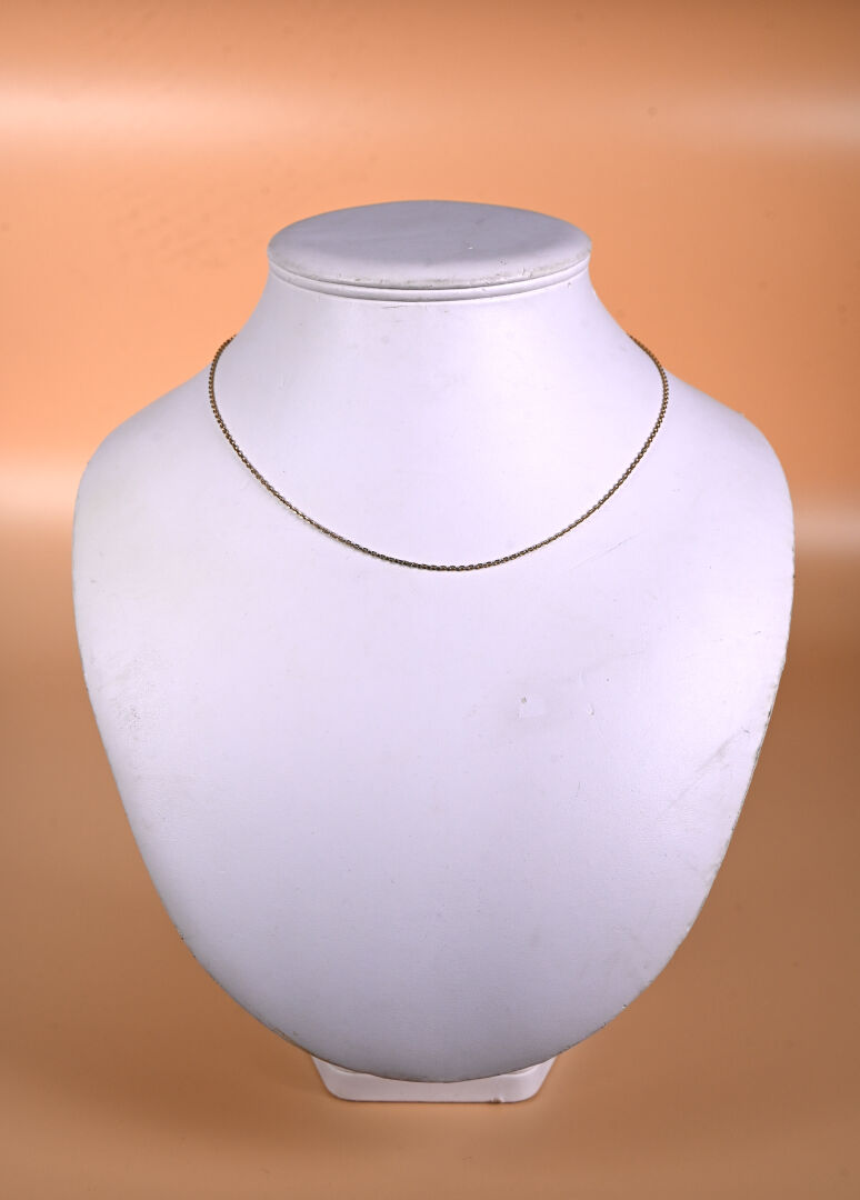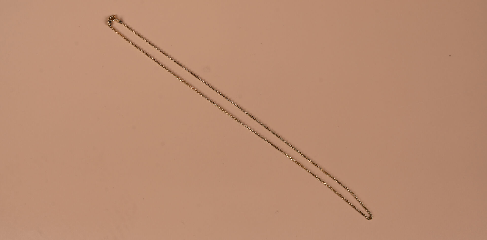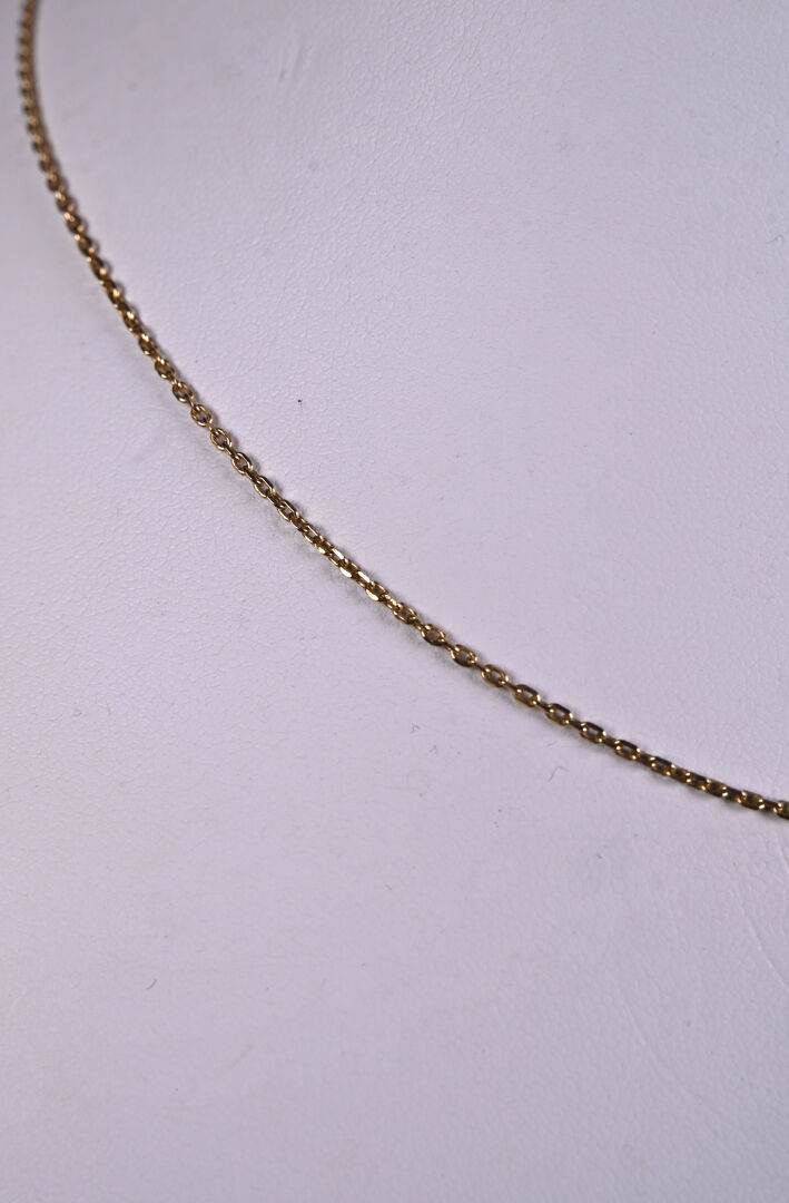 Ensemble en or jaune 18K 750/1000e soit une chaine à maille forçat (noeuds) et une paire de pendants d’oreilles navette serties d’une verroterie. Poids brut total : 4,76 g.