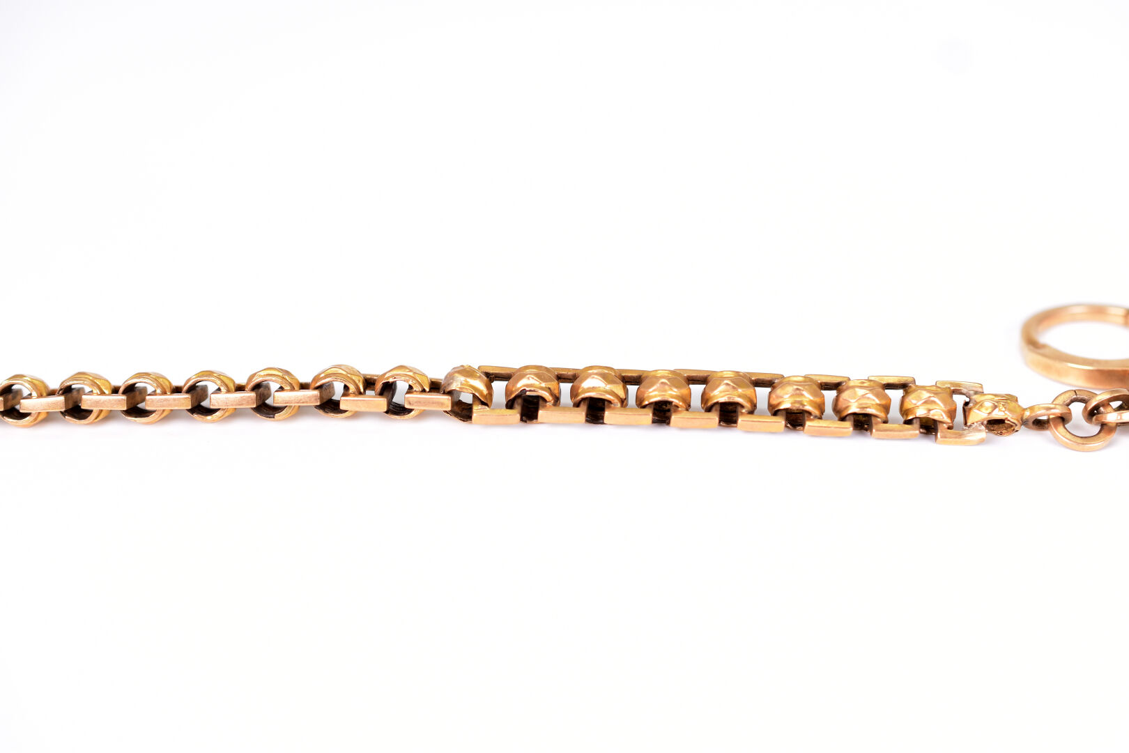 Ensemble en or jaune 18K 750/1000e soit une montre de gousset à cache poussière en or, cadran émaillé (éclats) (bouton en métal doré), une chaine giletière (restaurée), un médaillon porte photo avec un verre. Poids brut total : 107,57 g.