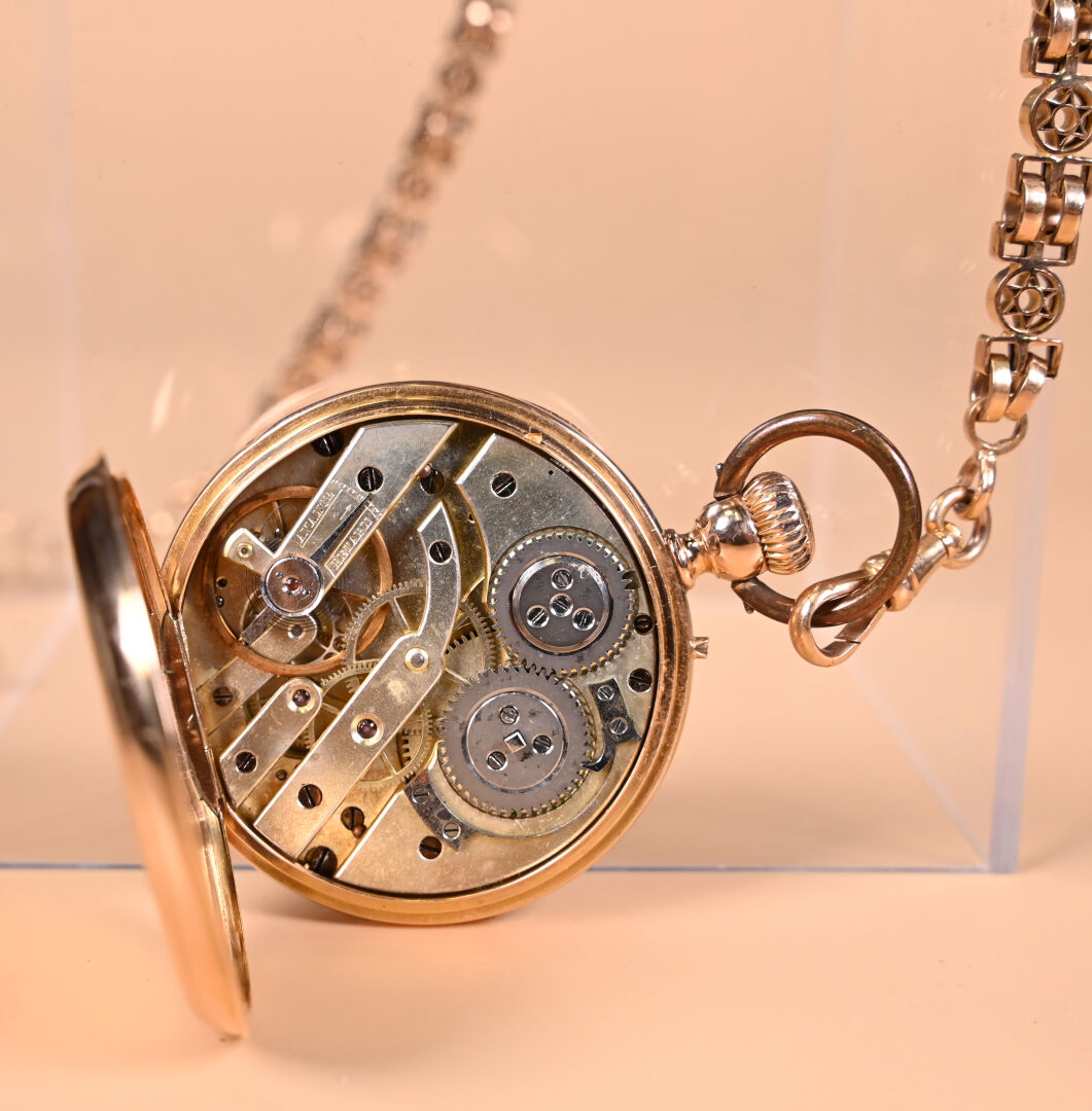 Ensemble en or jaune 18K 750/1000e soit une montre de gousset, sa chaine giletière et son remontoir en or fourré. Cache-poussière en or, poinçons aigle et tête de cheval. Poids brut total : 106,54 g. Dans son écrin à la forme.