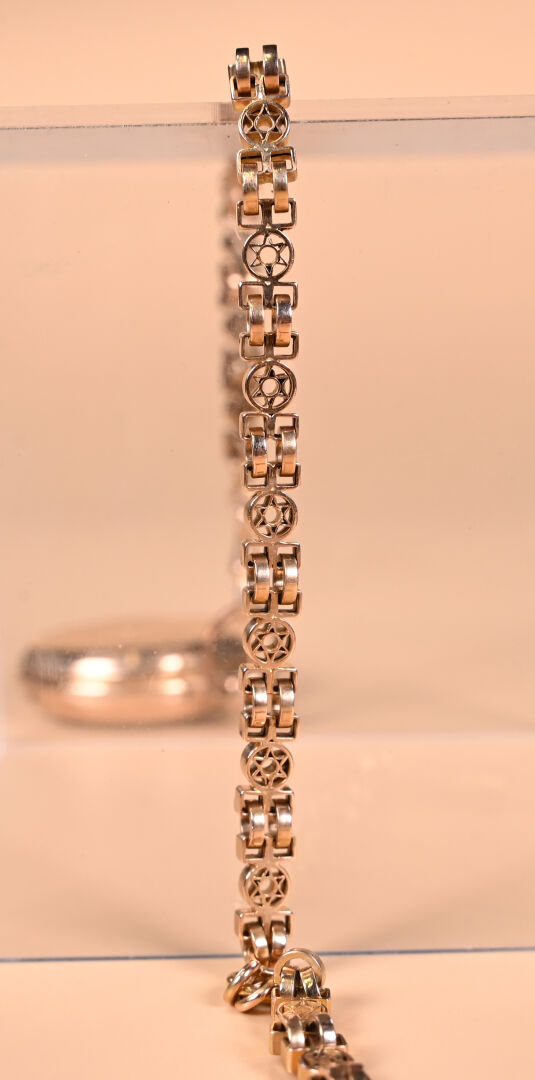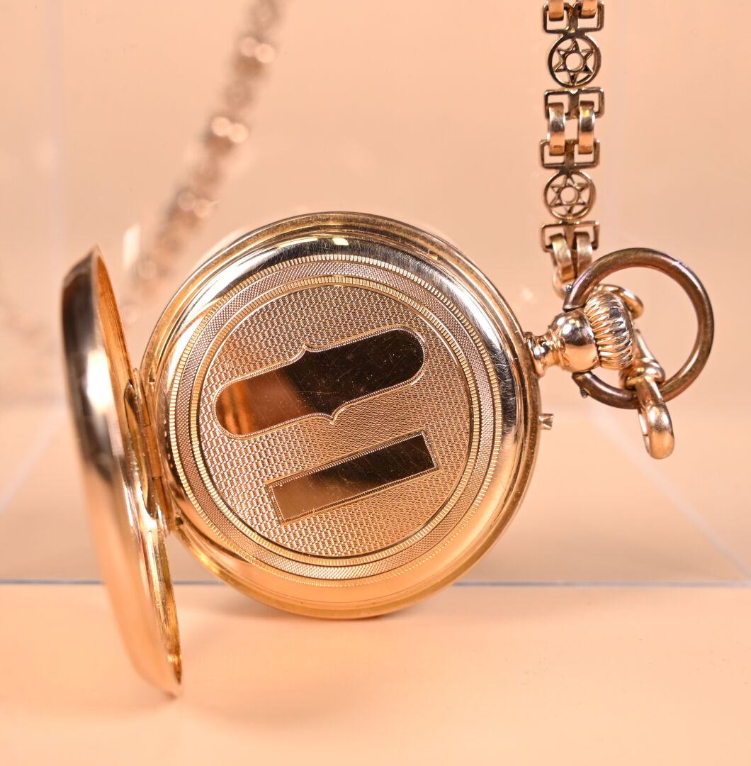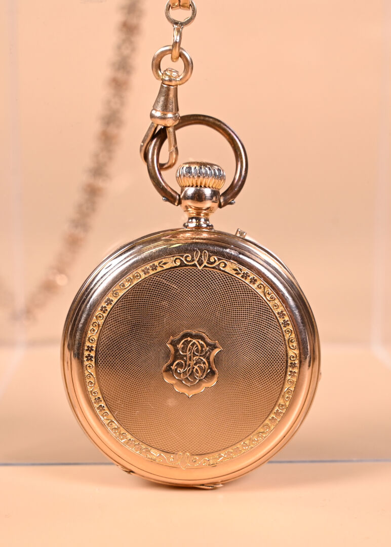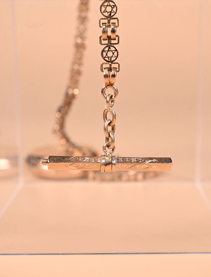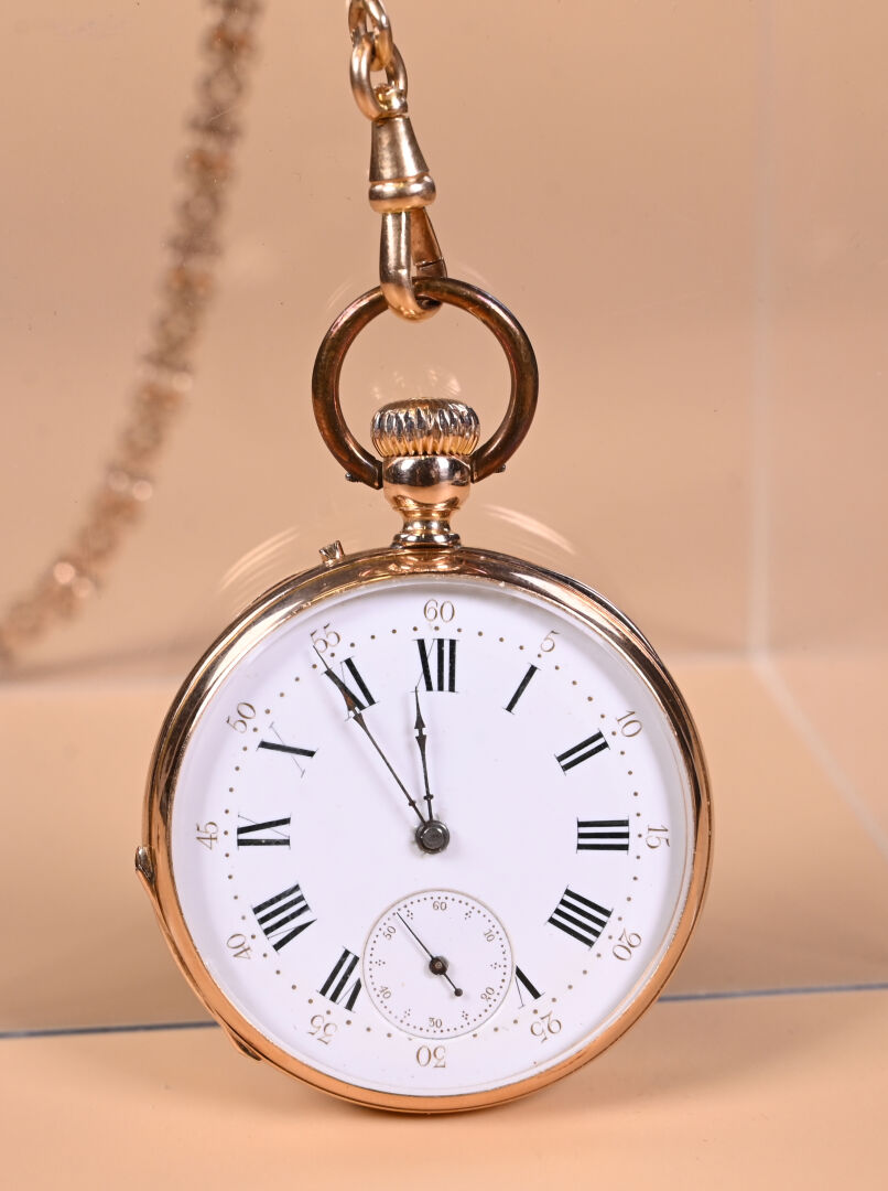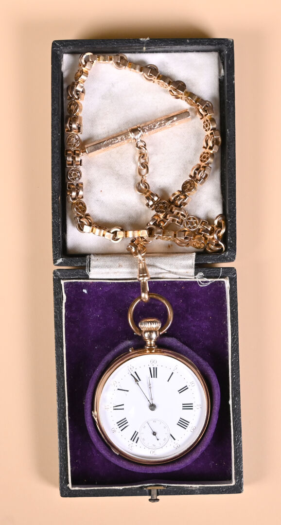 Ensemble en or jaune 18K 750/1000e soit une montre de gousset, sa chaine giletière et son remontoir en or fourré. Cache-poussière en or, poinçons aigle et tête de cheval. Poids brut total : 106,54 g. Poids de la chaîne : 38,1 g. Dans son écrin à la forme.