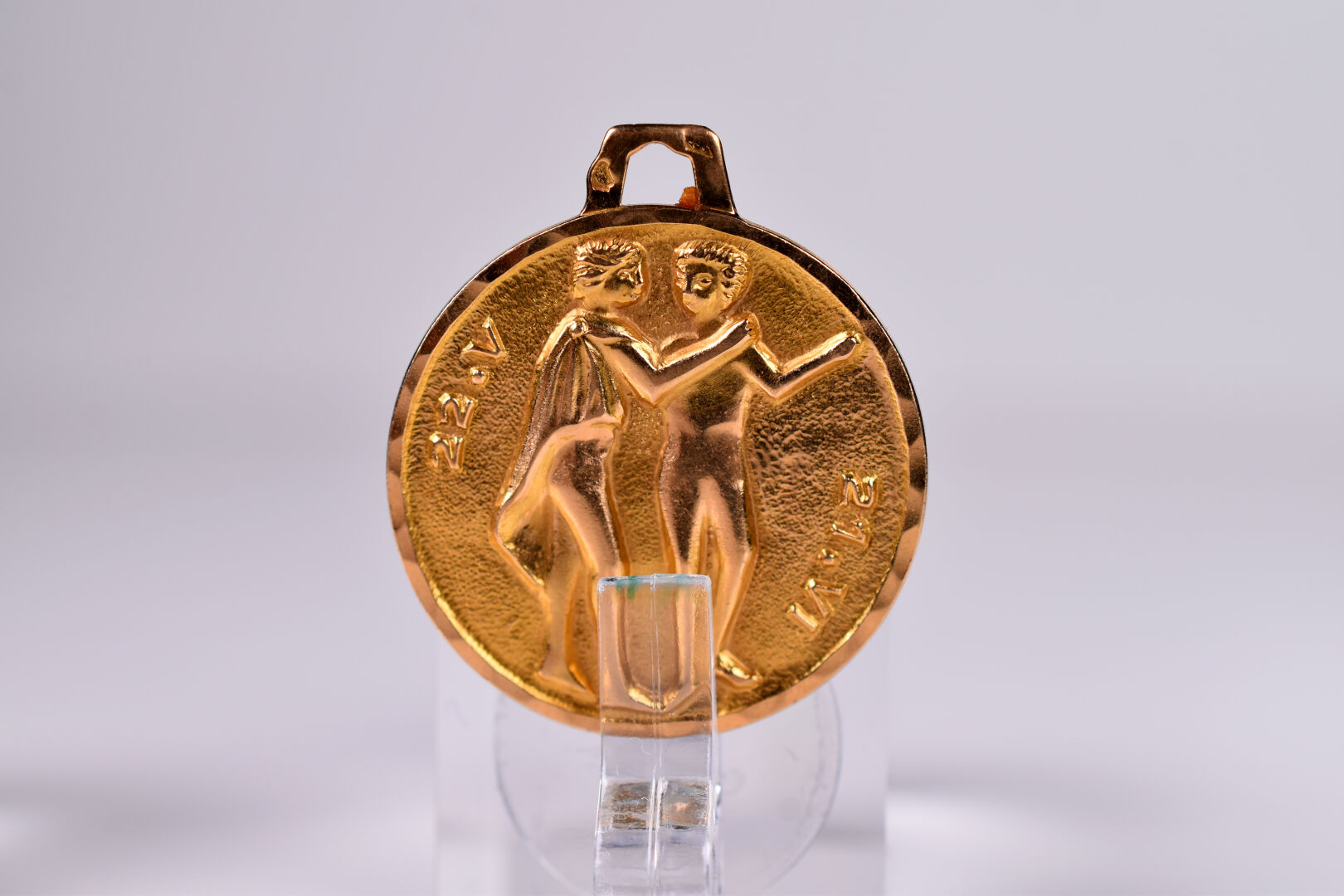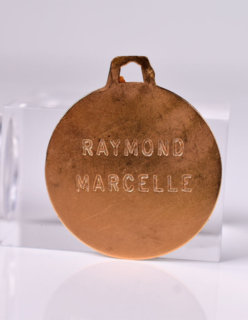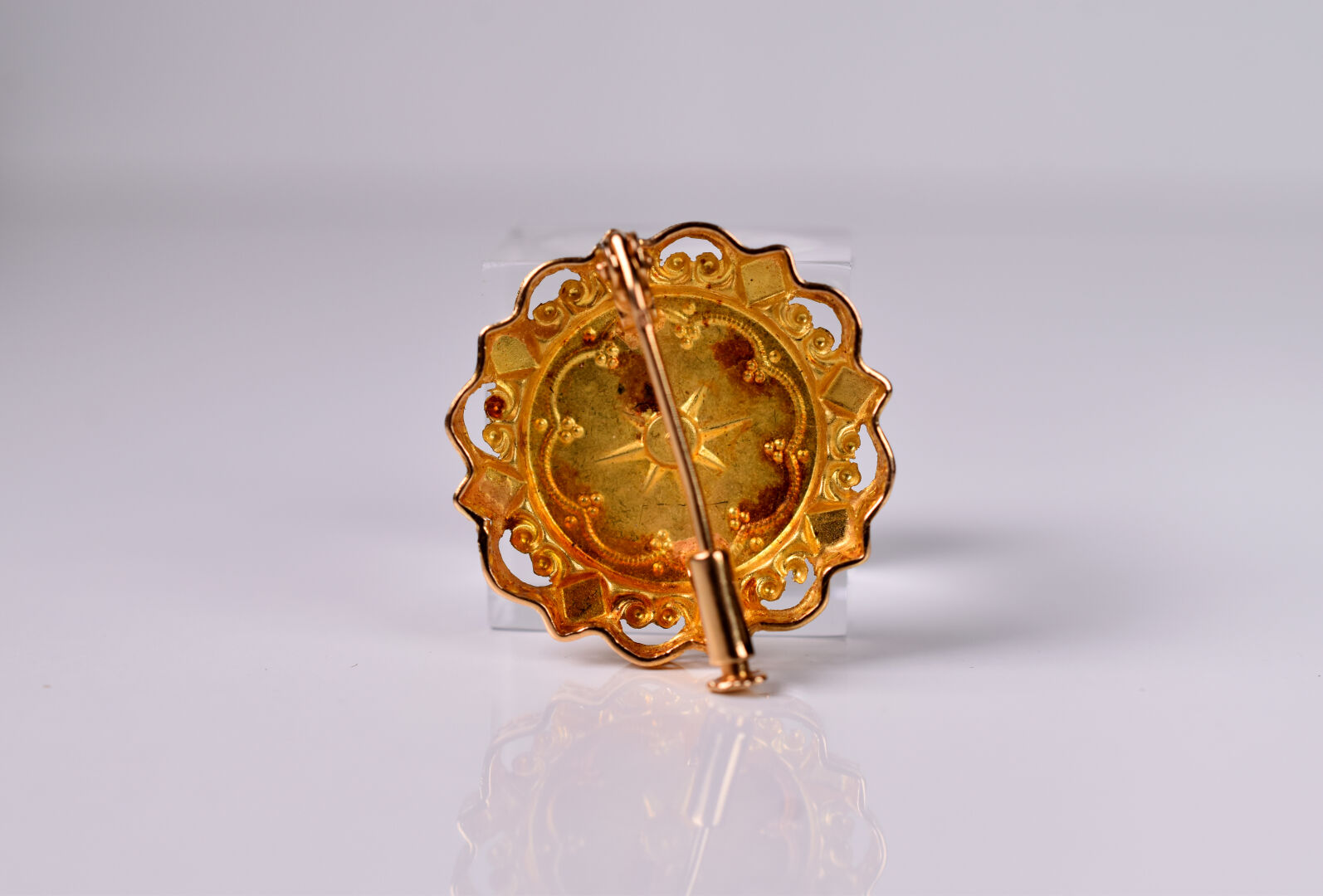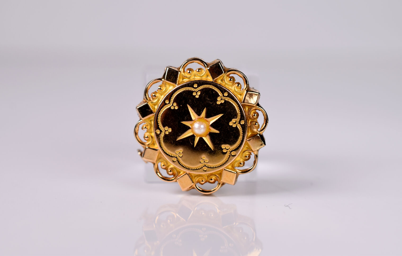 Ensemble en or jaune 18K 750/1000e soit une petite broche fleur orné d’une perlette et une médaille gravée. Poids brut total : 7,56 g.