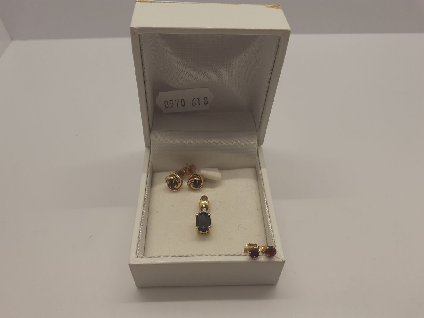 Ensemble en or jaune 18k 750/1000e un pendentif serti d’un saphir et d’un diamant de poids inférieur à 0,02 carat, une paire de vis d’oreilles serties chacune d’une pierre rouge, une paire de vis d’oreilles serties chacune d’une pierre bleue. On joint un écrin blanc usé « MARC ORIAN ». Poids brut total = 2,75g.