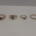 Ensemble en or jaune 18k 750/1000e une bague sertie d’un rubis épaulé de 2 diamants de poids inférieur à 0,02 carat chacun (tdd 53), une alliance gravée à l’intérieur « DENISE 03-99 » (tdd 58), deux bagues sertie d’une pierre blanche chacune (usures – tdd 53, 45). Poids brut total = 8,70g.