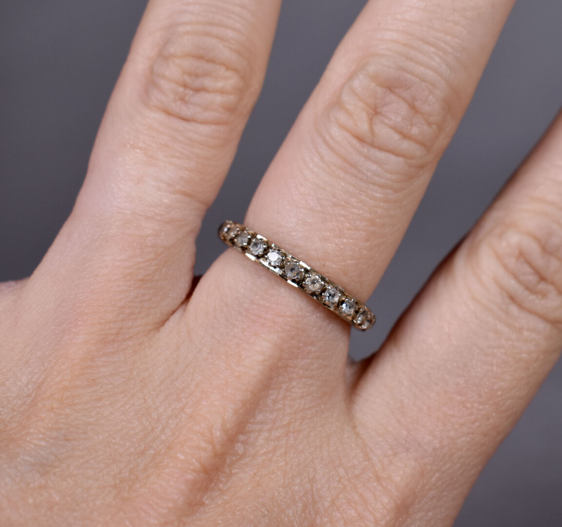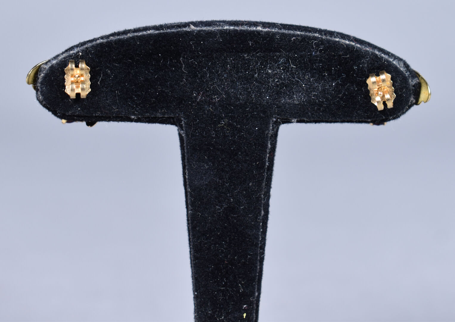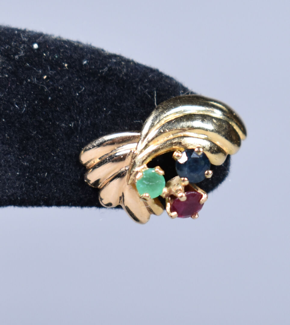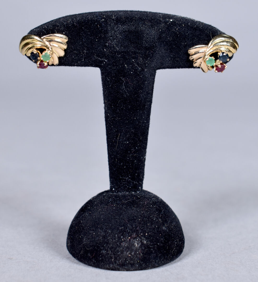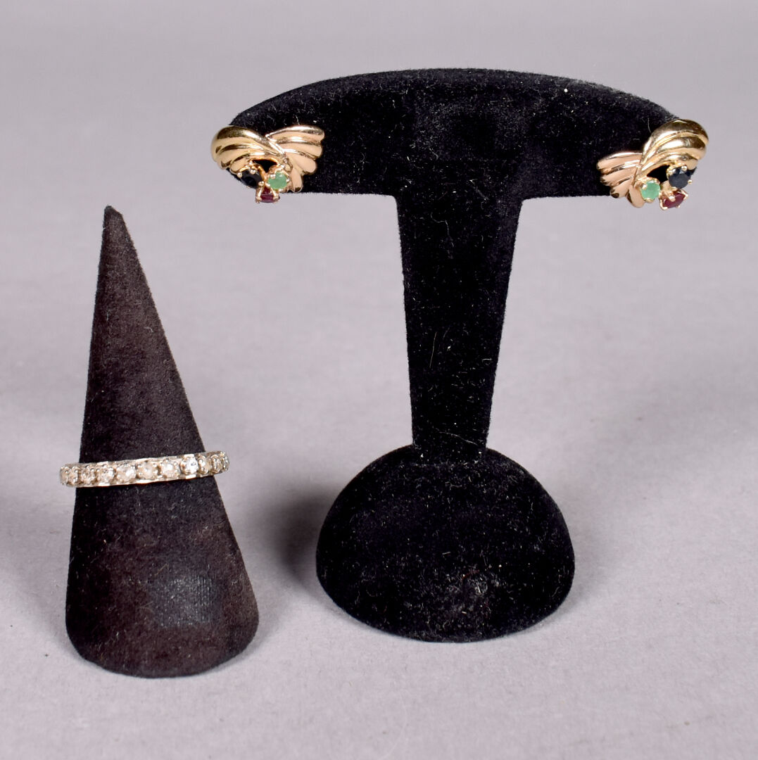 Ensemble en or jaune et gris 18K 750/1000e soit une alliance américaine sertie de verroterie et une paire de puces d’oreilles serties d’émeraude, rubis et saphir. Poids brut total : 5,5 g.