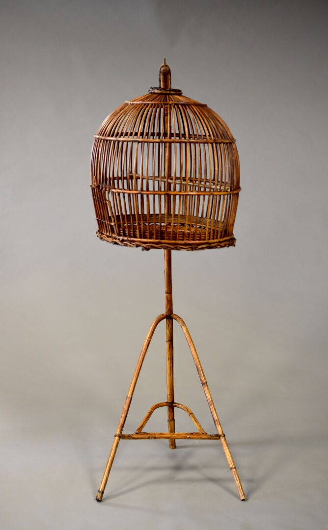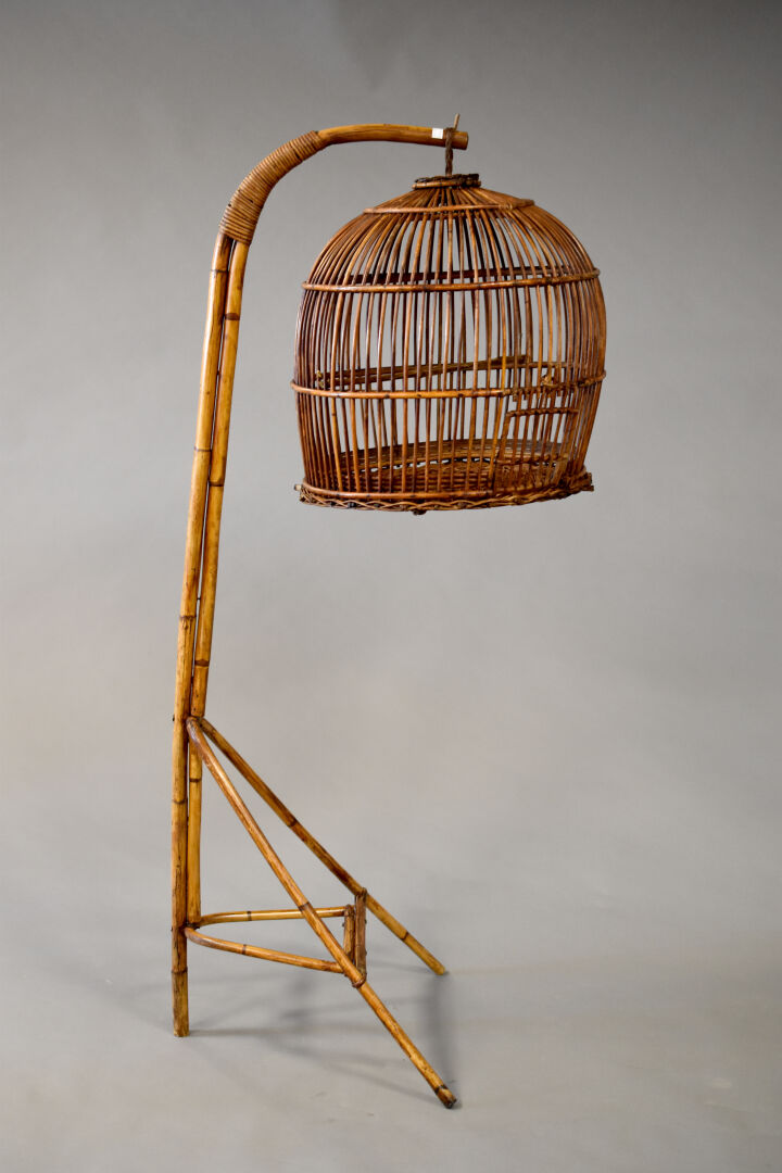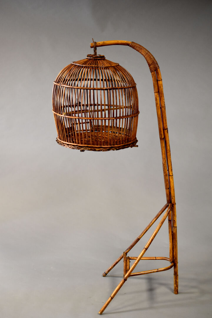 Ensemble en osier et bambou soit une cage sur pied. Dans le goût asiatique, XXe siècle. Dimensions : 163x49x73 cm.