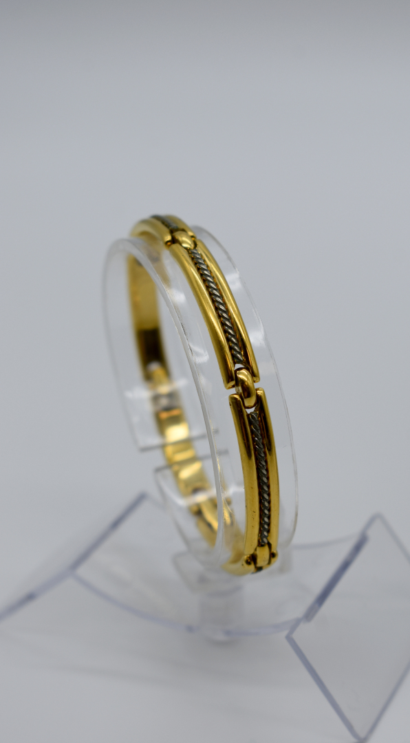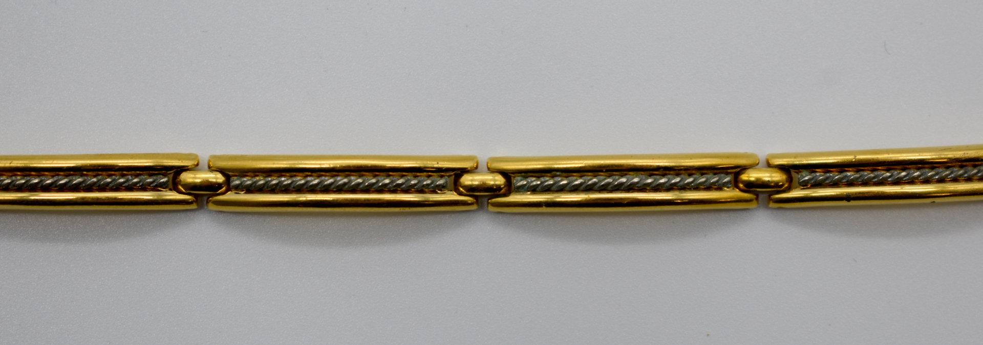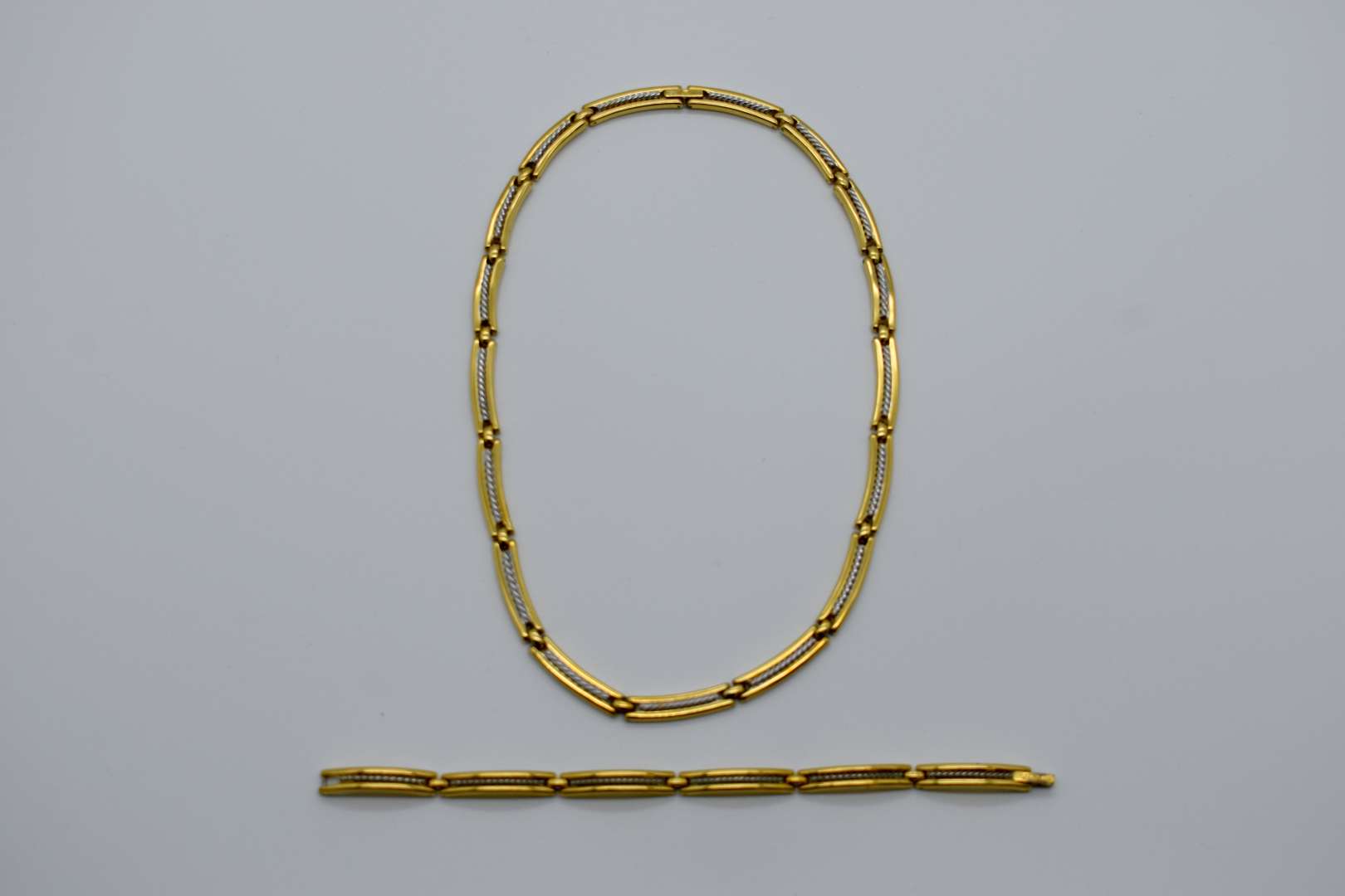 Ensemble en plaqué or à larges maillons rectangulaires en jaune à torsades grises comprenant un collier et un bracelet (petits éclats). Long. : 42 cm (environ).