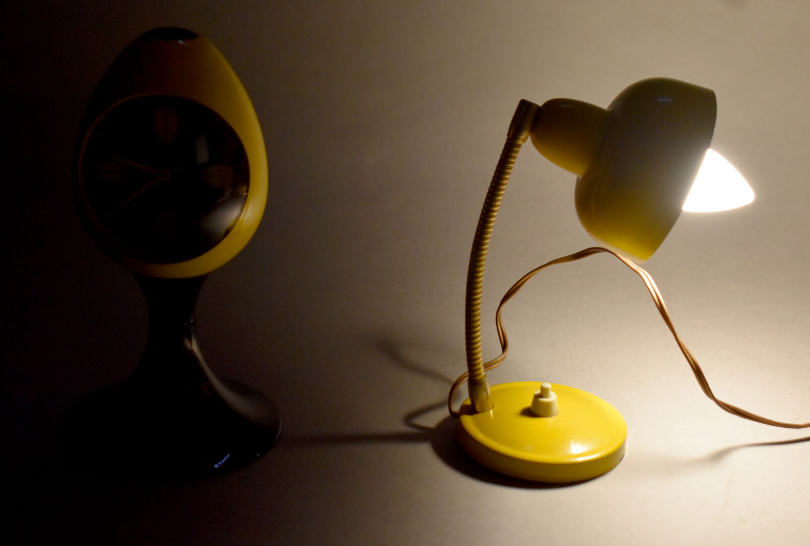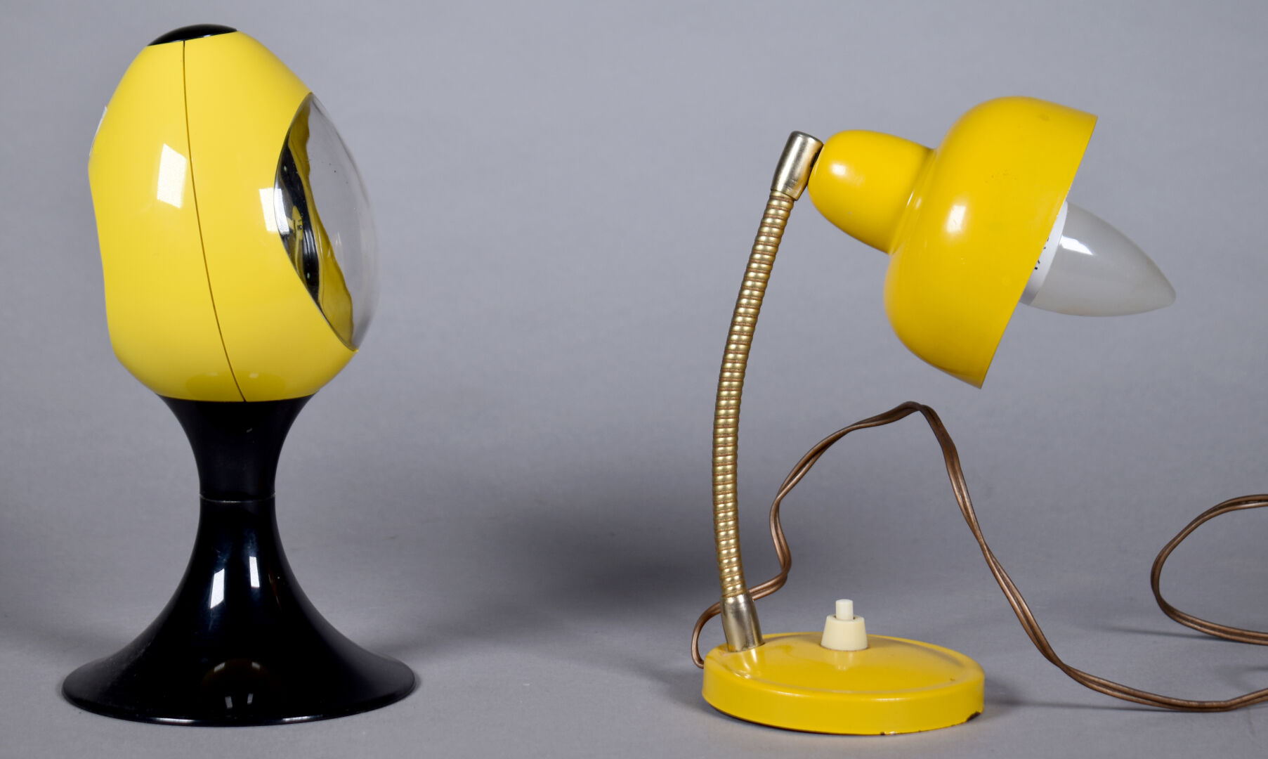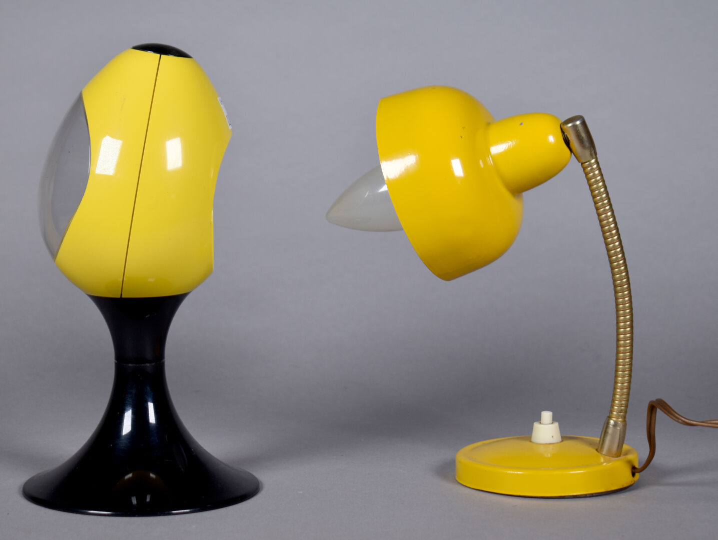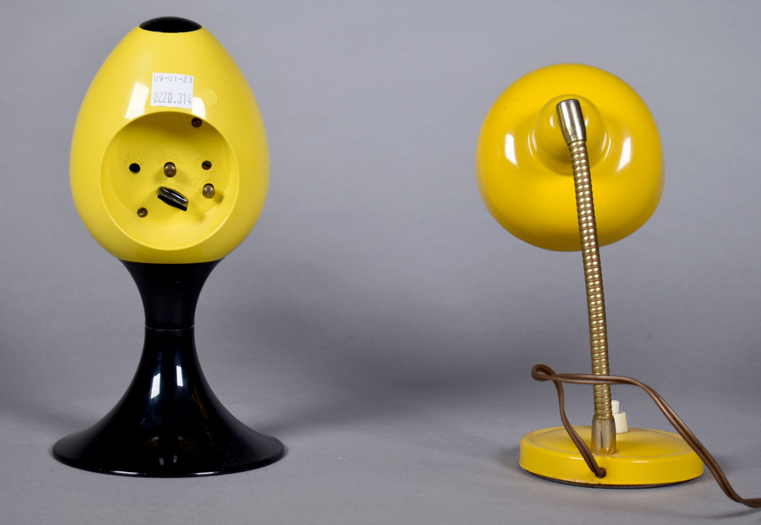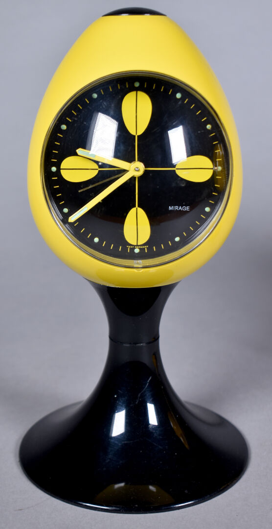 Ensemble en plastique et métal laqué jaune soit une petite lampe à poser et un réveil oeuf sur pied marqué « Mirage ». Vers 1960/70. Haut. : 23 cm (réveil).