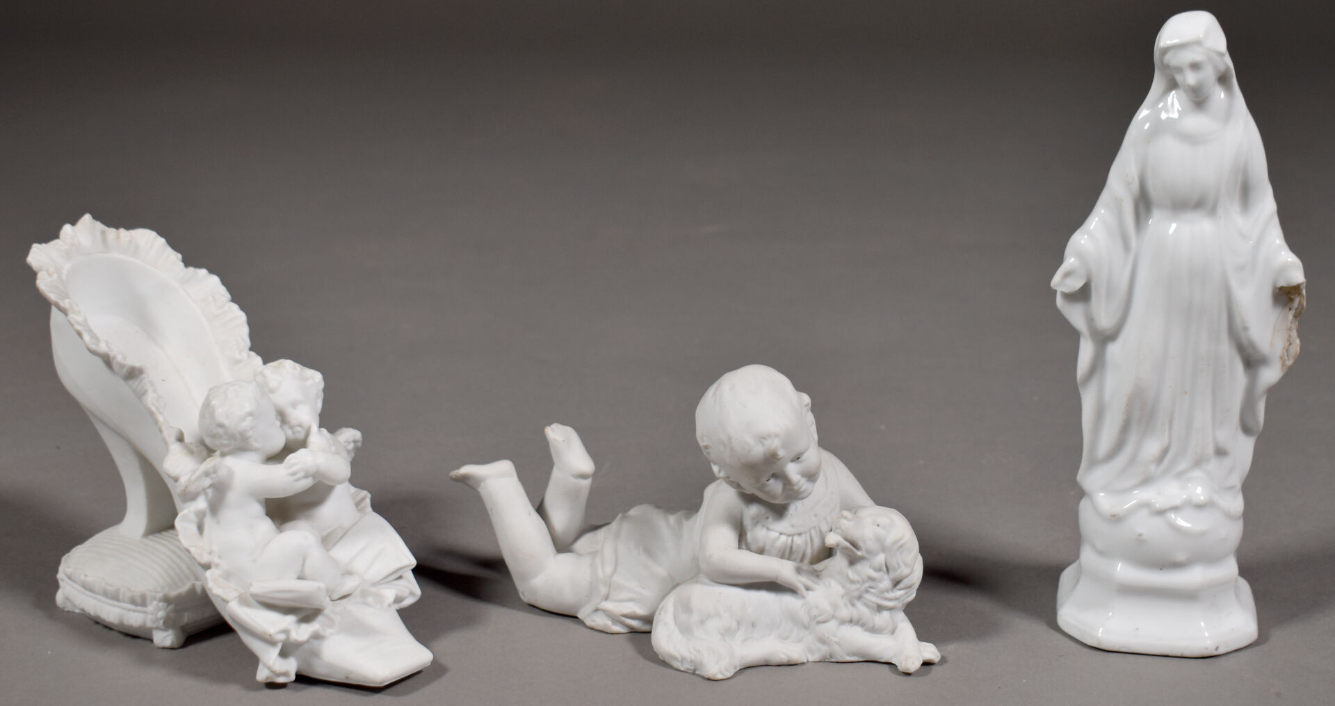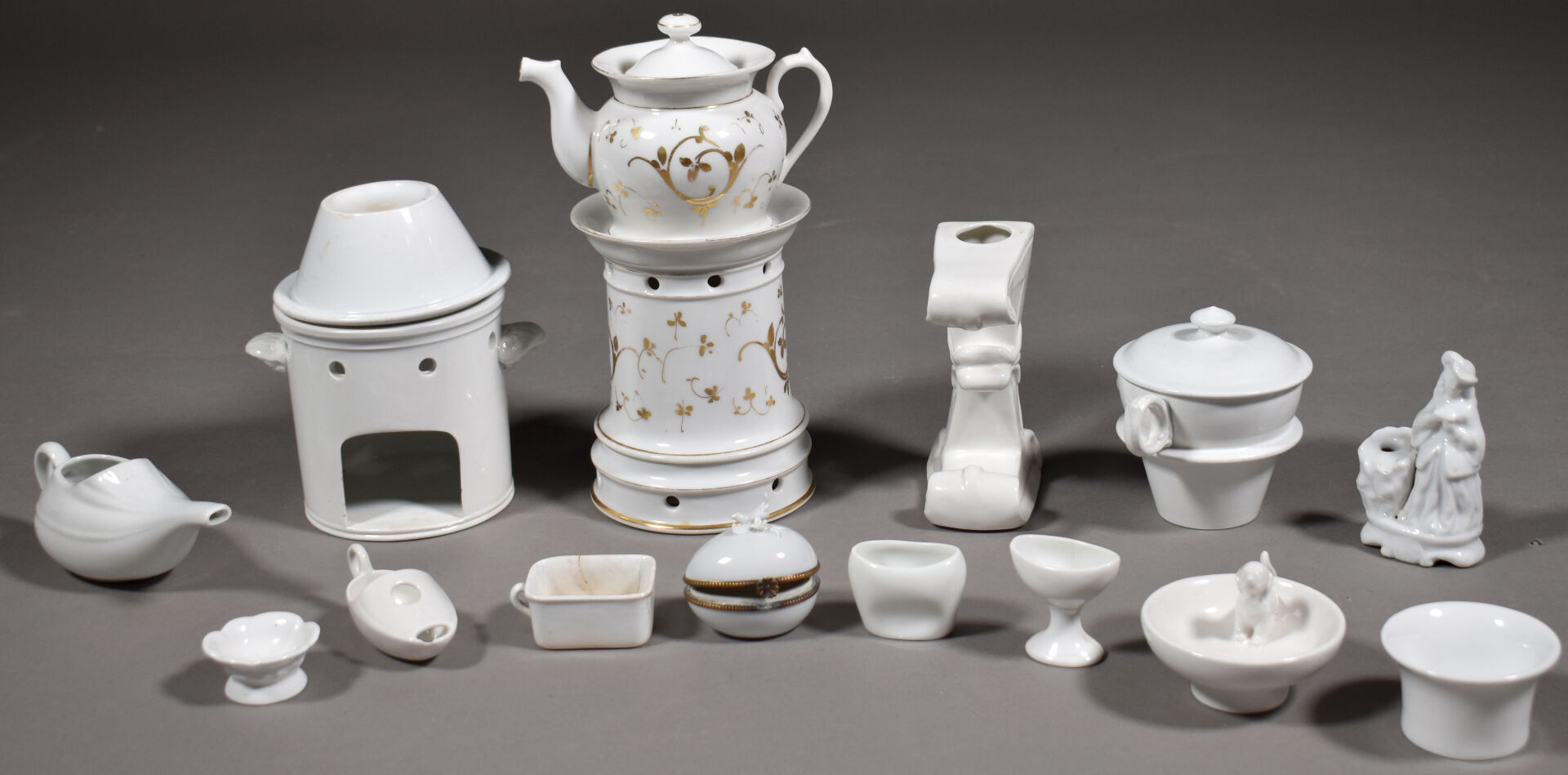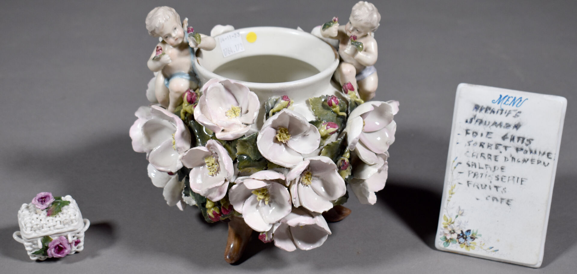 Ensemble en porcelaine, biscuit et grès dont samovar en porcelaine de Paris, vase dans le goût de saxe, canard de malade et divers. 1 caisse;