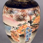 Ensemble en porcelaine soit une coupe octogonale à décor en polychromie et dorure (un éclat) Satsuma, Japon, un petit vase balustre en porcelaine de Satsuma, deux pots couverts, une petite boite, un vase à décor émaillé en vert rouge et jaune d’un personnage, un service à saké en porcelaine de Nankin à décor en bleu. On joint une plaque de nacre à décor d’un palais (égrenures, un morceau décollé sur la plaque).