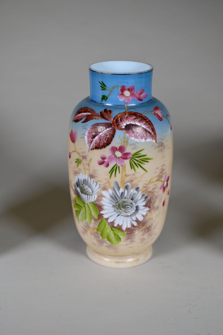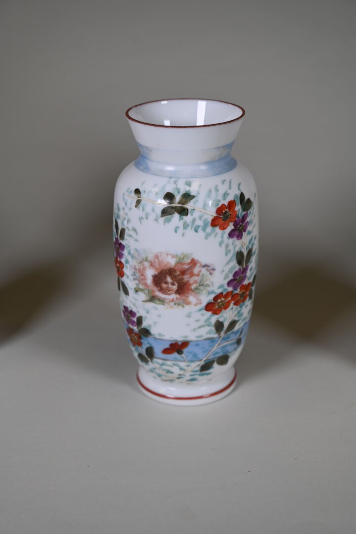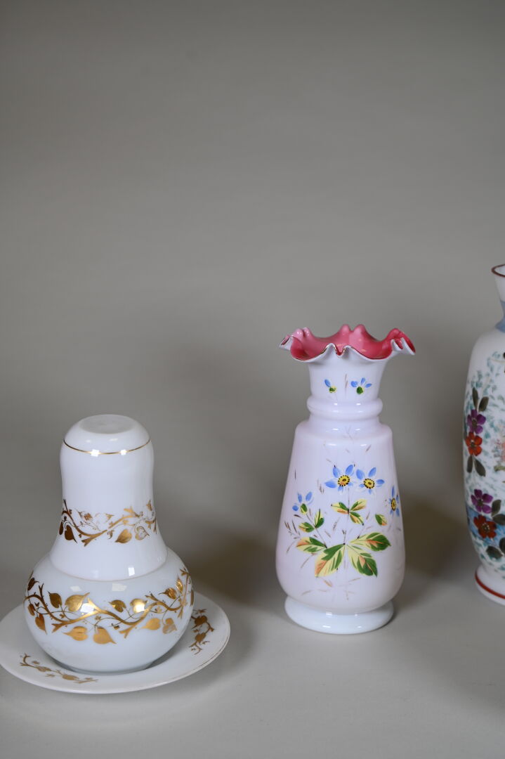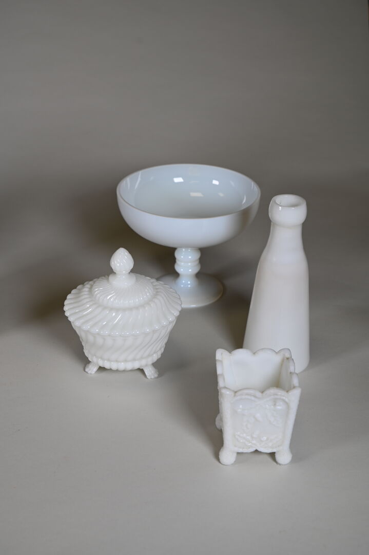 Ensemble en verre blanc, opaline et verre opalescent dont cocotte, coupe sur pied, vase à décor émaillé de fleurs, pots couvert… 2 caisses.