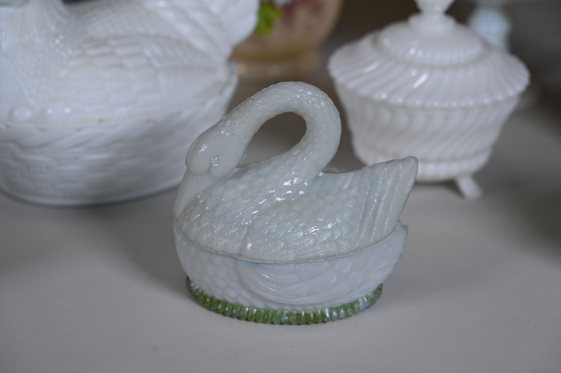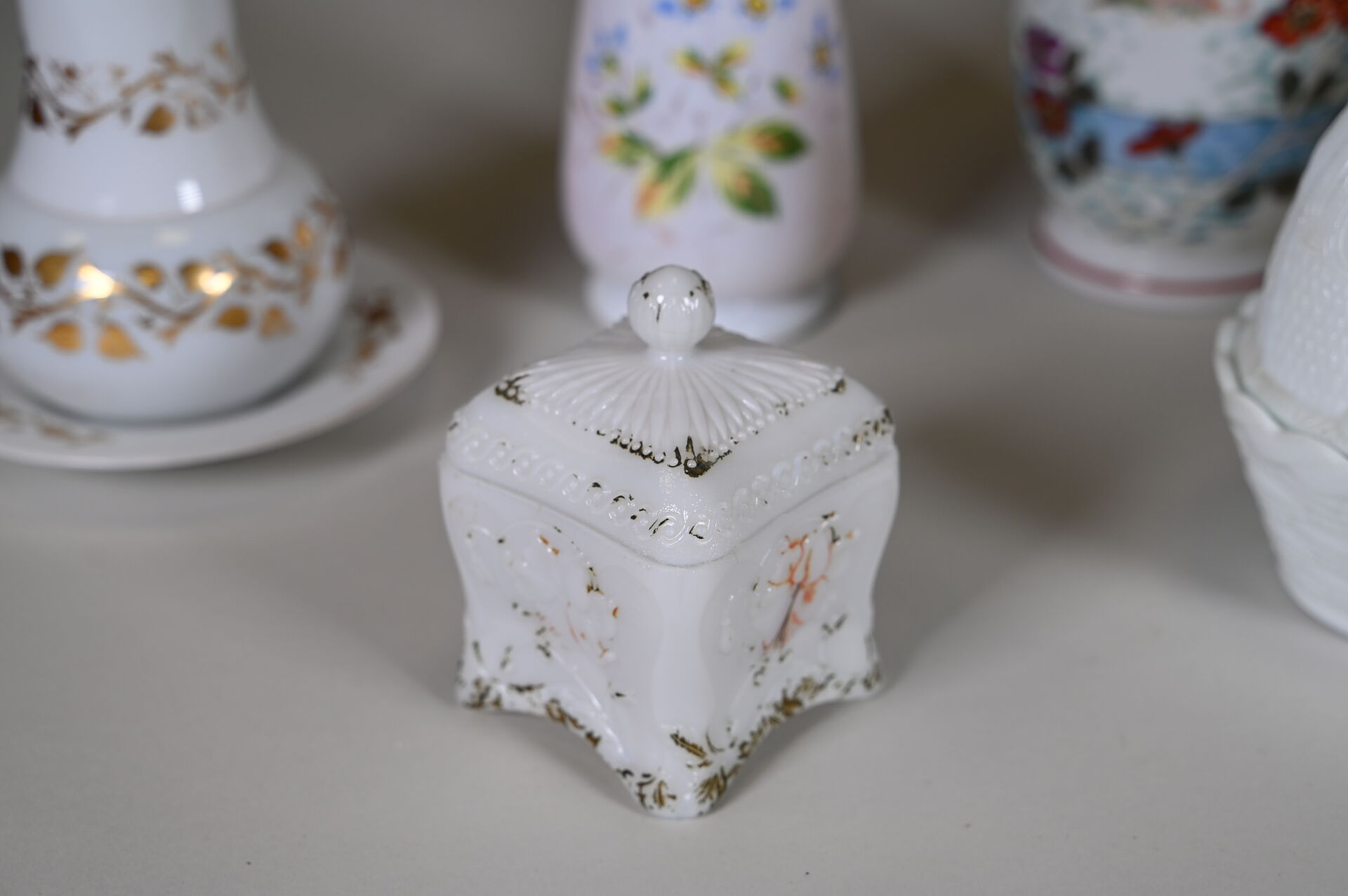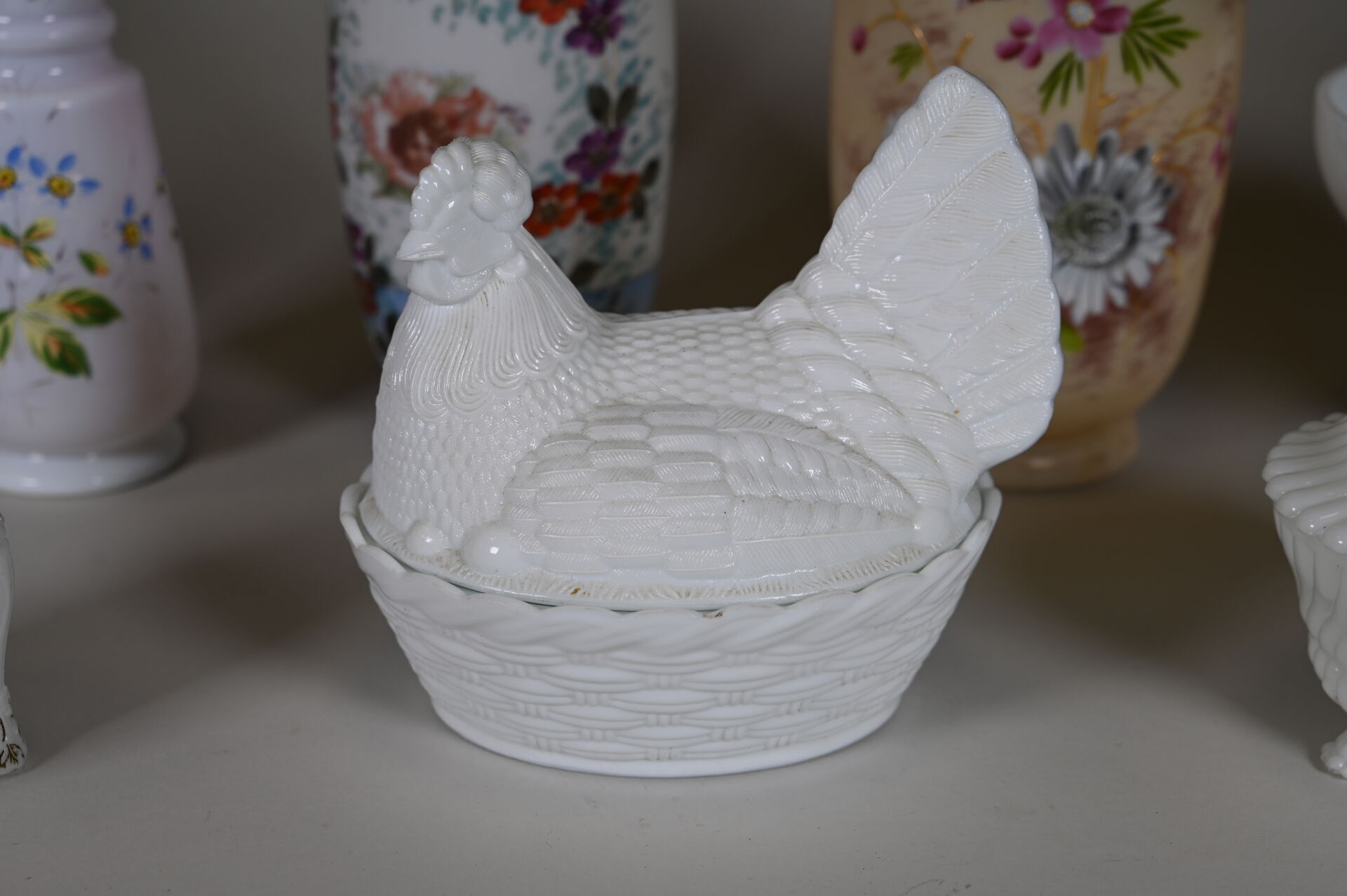 Ensemble en verre blanc, opaline et verre opalescent dont cocotte, coupe sur pied, vase à décor émaillé de fleurs, pots couvert… 2 caisses.